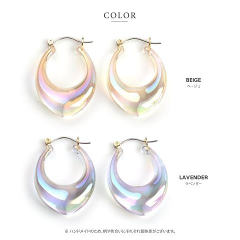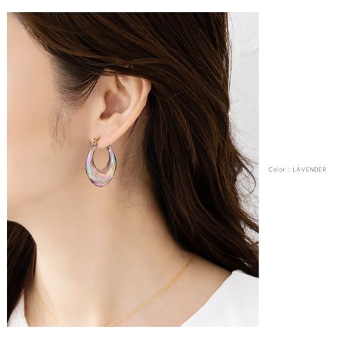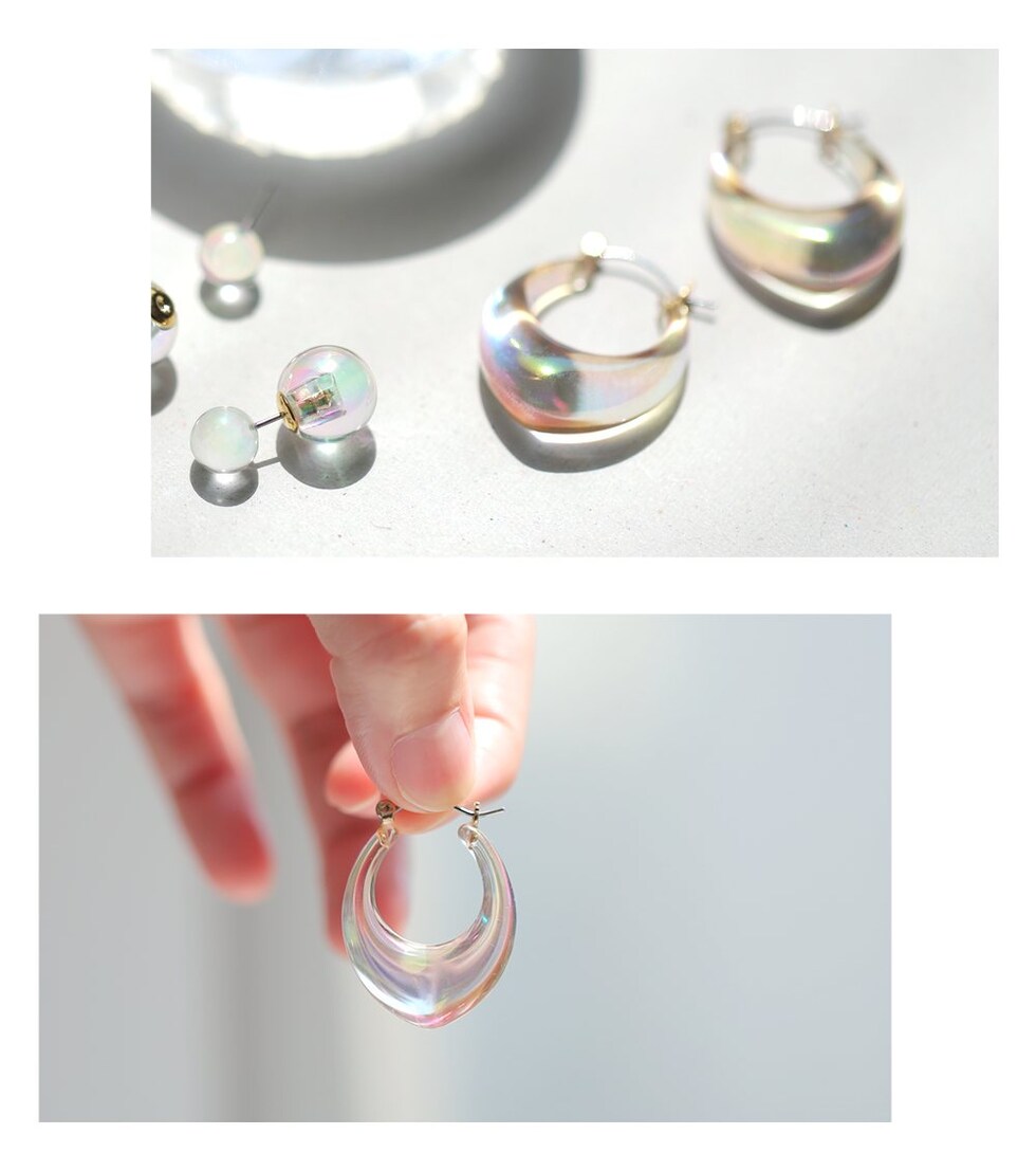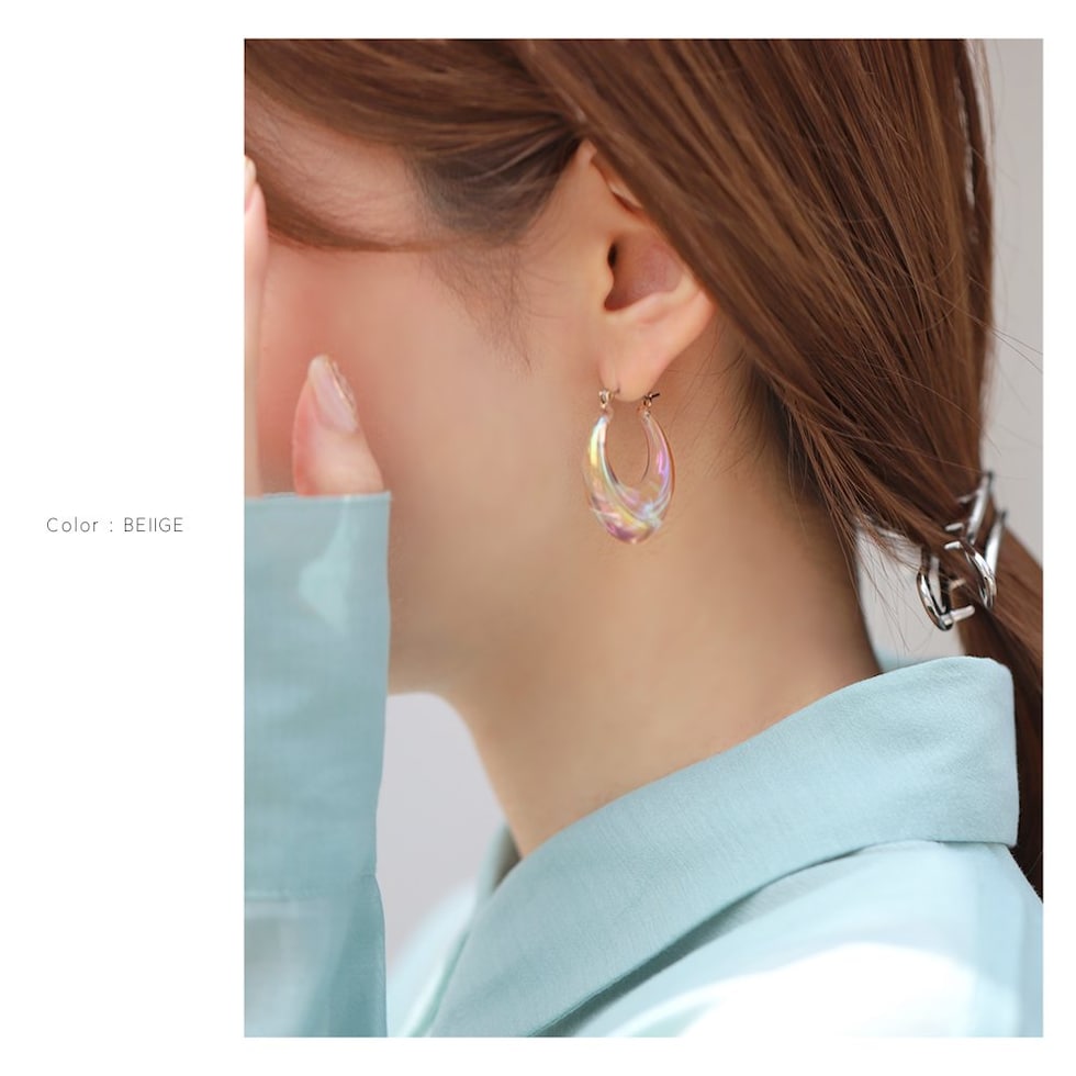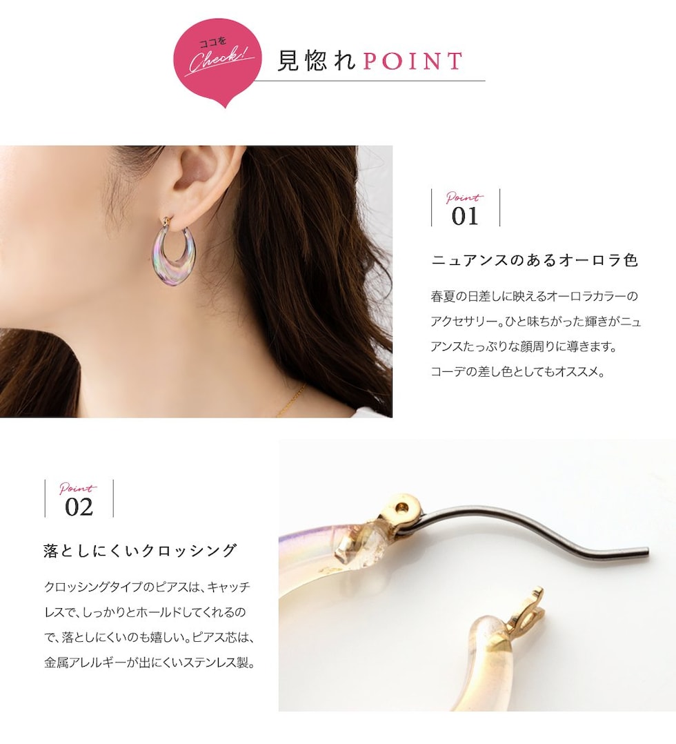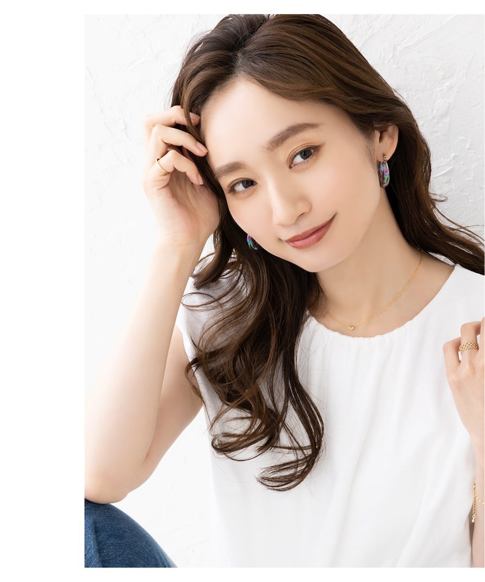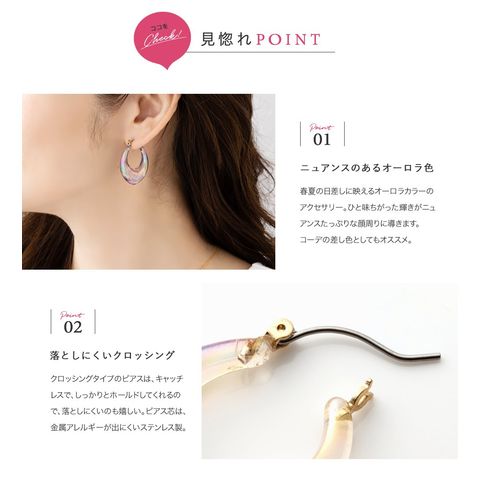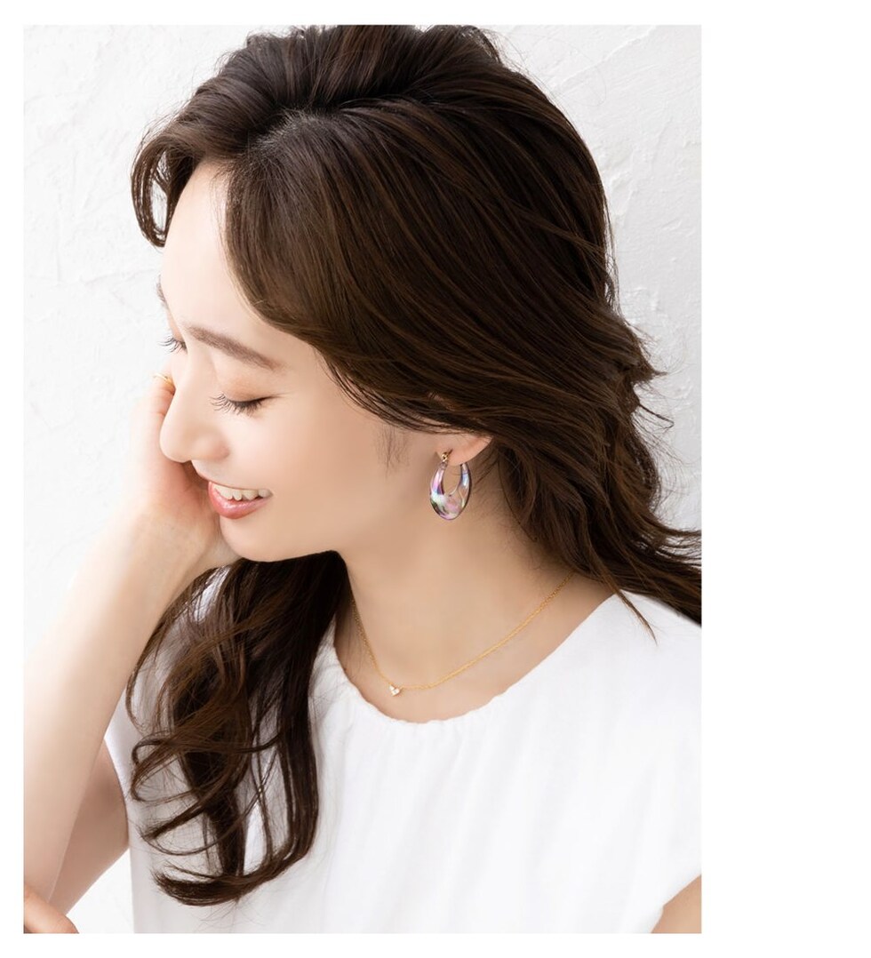 春夏の日差しに映えるオーロラカラーのアクセサリー。ひと味ちがった輝きがニュアンスたっぷりな顔周りに導きます。コーデの差し色としてもオススメ。