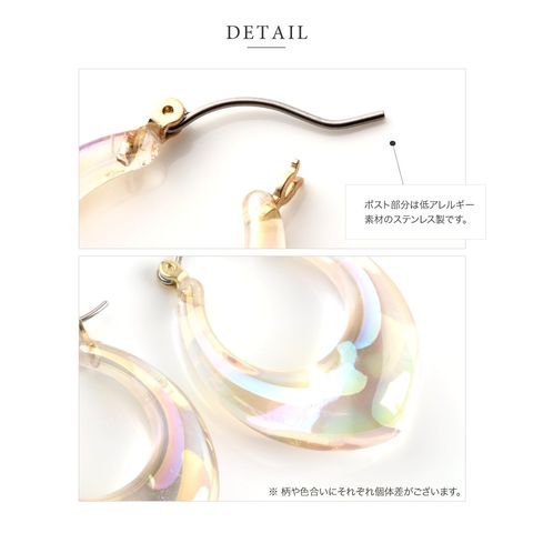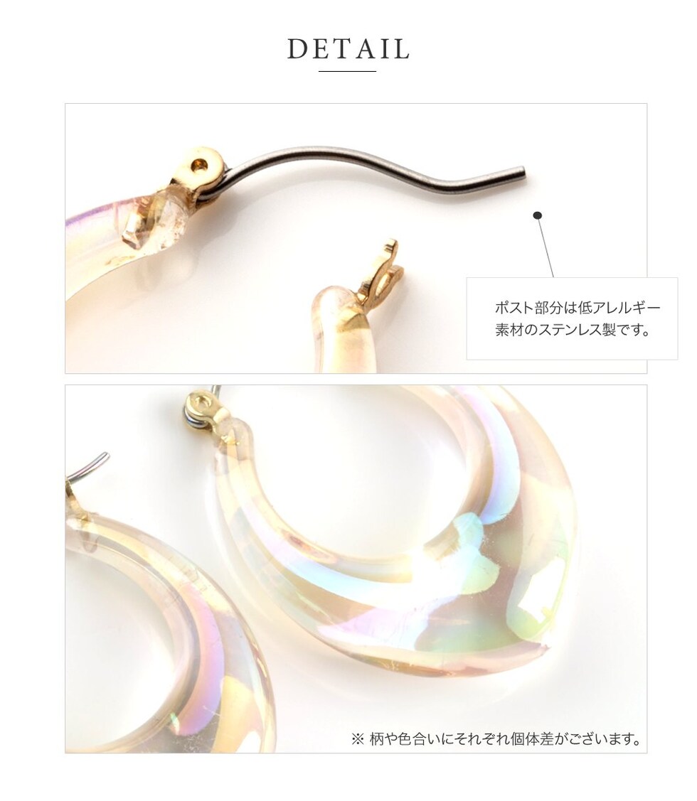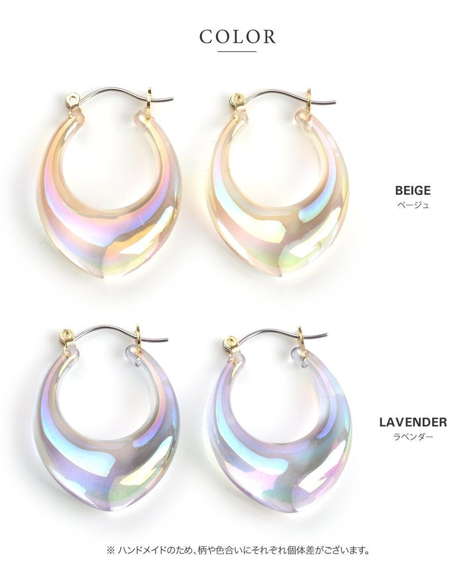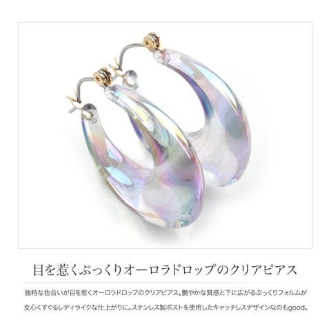 独特な色合いが目を惹くオーロラドロップのクリアピアス。艶やかな質感と下に広がるぷっくりフォルムが女心くすぐるレディライクな仕上がりに。ステンレス製ポストを使用したキャッチレスデザインなのもgood。