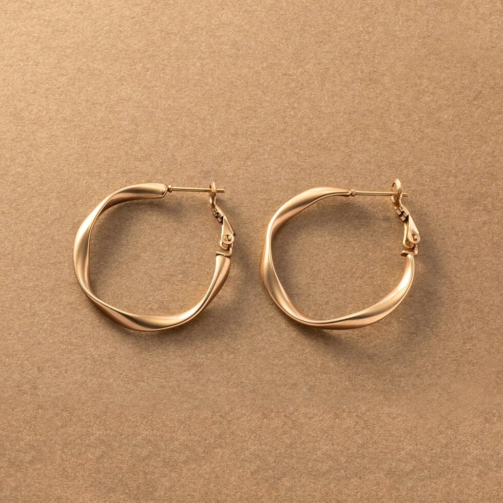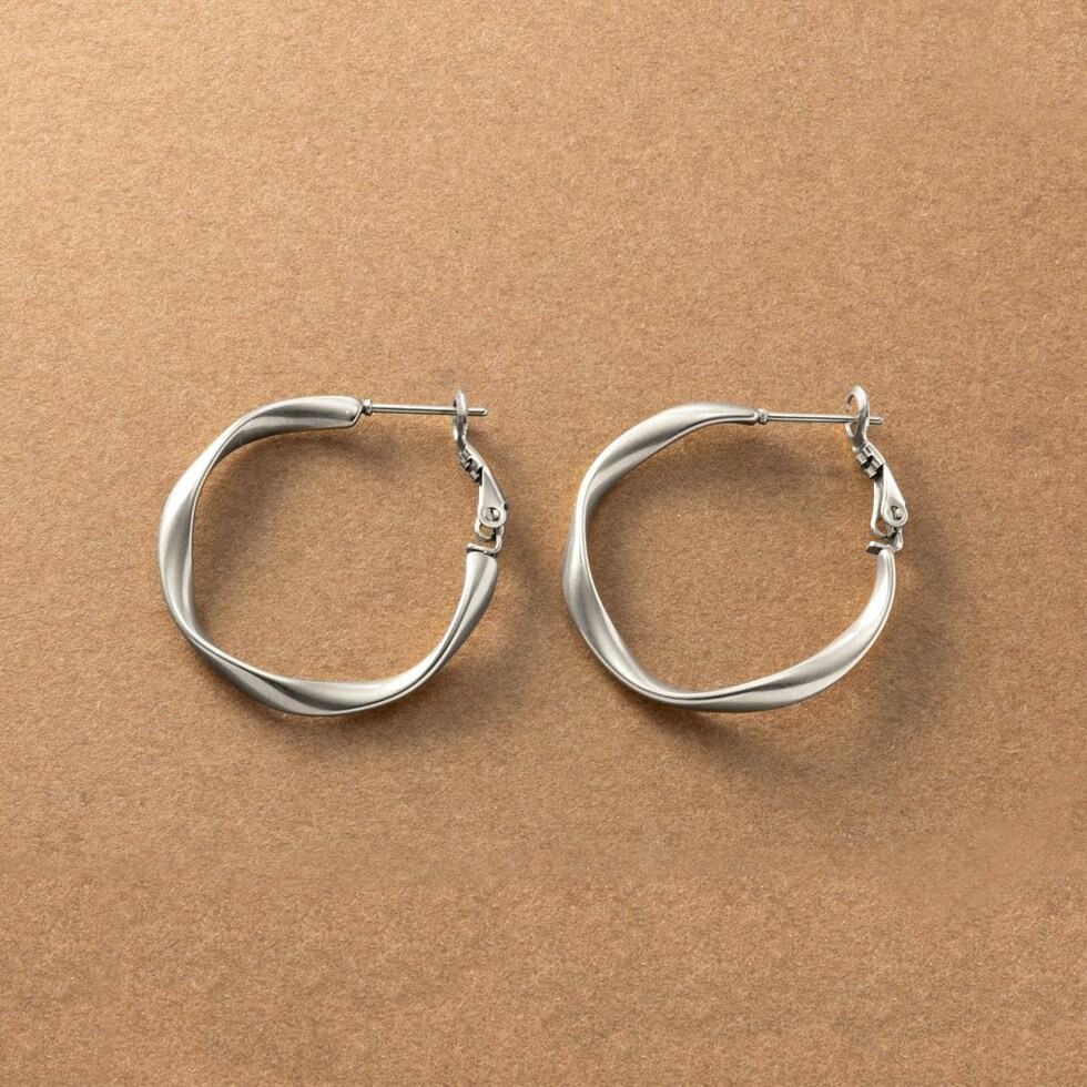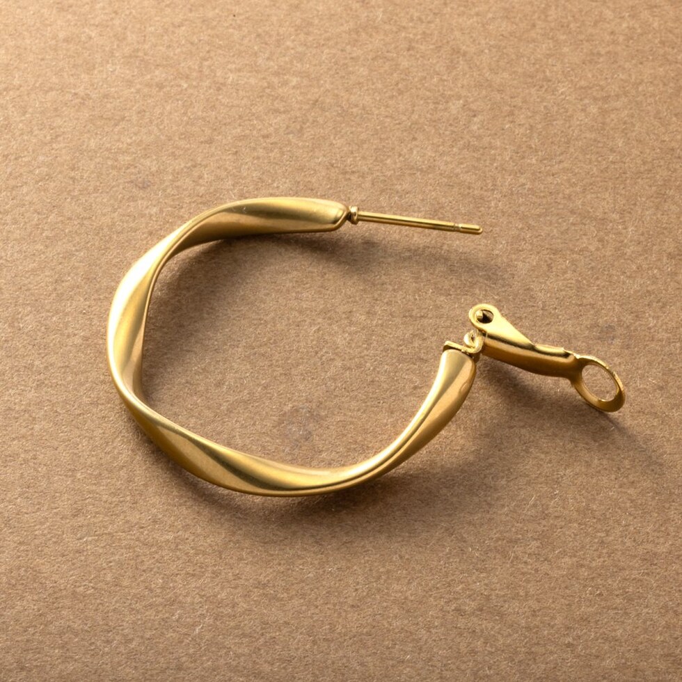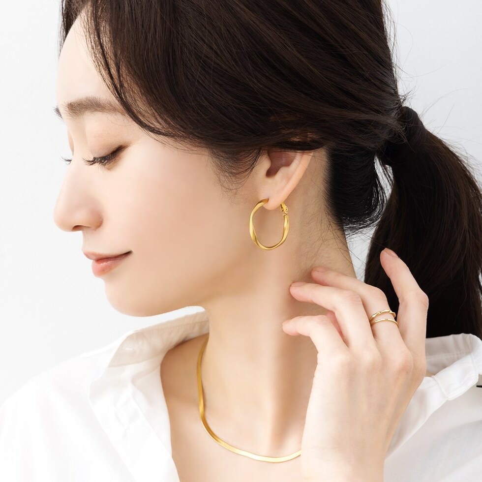 フープにひねりを効かせたシンプルなフォルムが大人っぽいステンレス製ピアス。カチッと留まる開閉式のキャッチレスデザイン。耳元にさりげなくアクセントをプラスしてくれるオンオフ問わないデザインで使い勝手の良い逸品。錆びにくいステンレス製でデイリーに活躍しそう◎