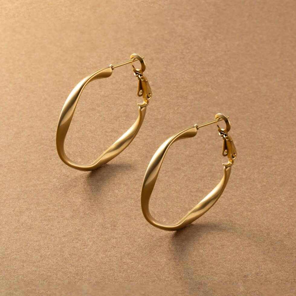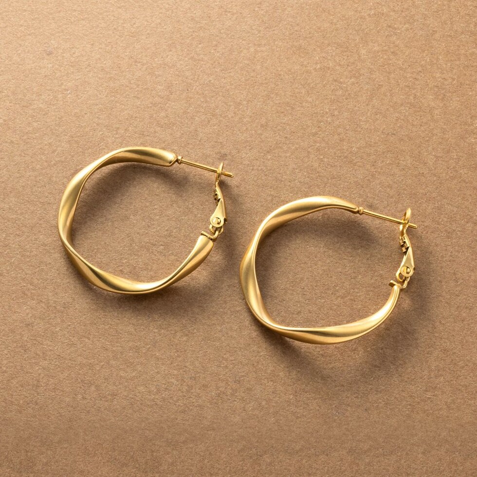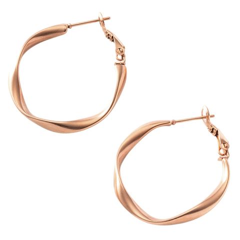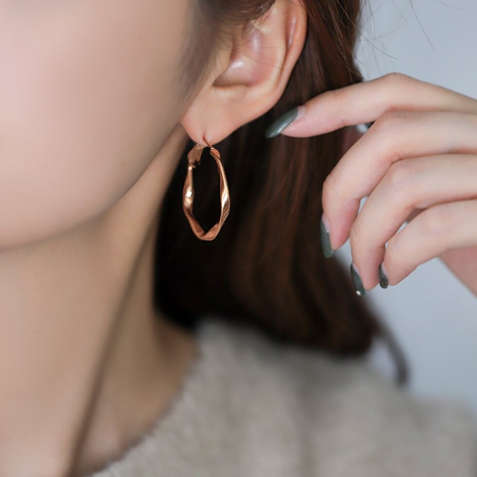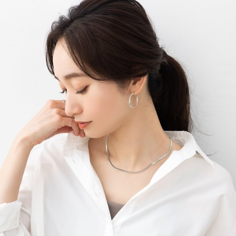 フープにひねりを効かせたシンプルなフォルムが大人っぽいステンレス製ピアス。カチッと留まる開閉式のキャッチレスデザイン。耳元にさりげなくアクセントをプラスしてくれるオンオフ問わないデザインで使い勝手の良い逸品。錆びにくいステンレス製でデイリーに活躍しそう◎