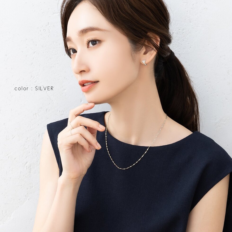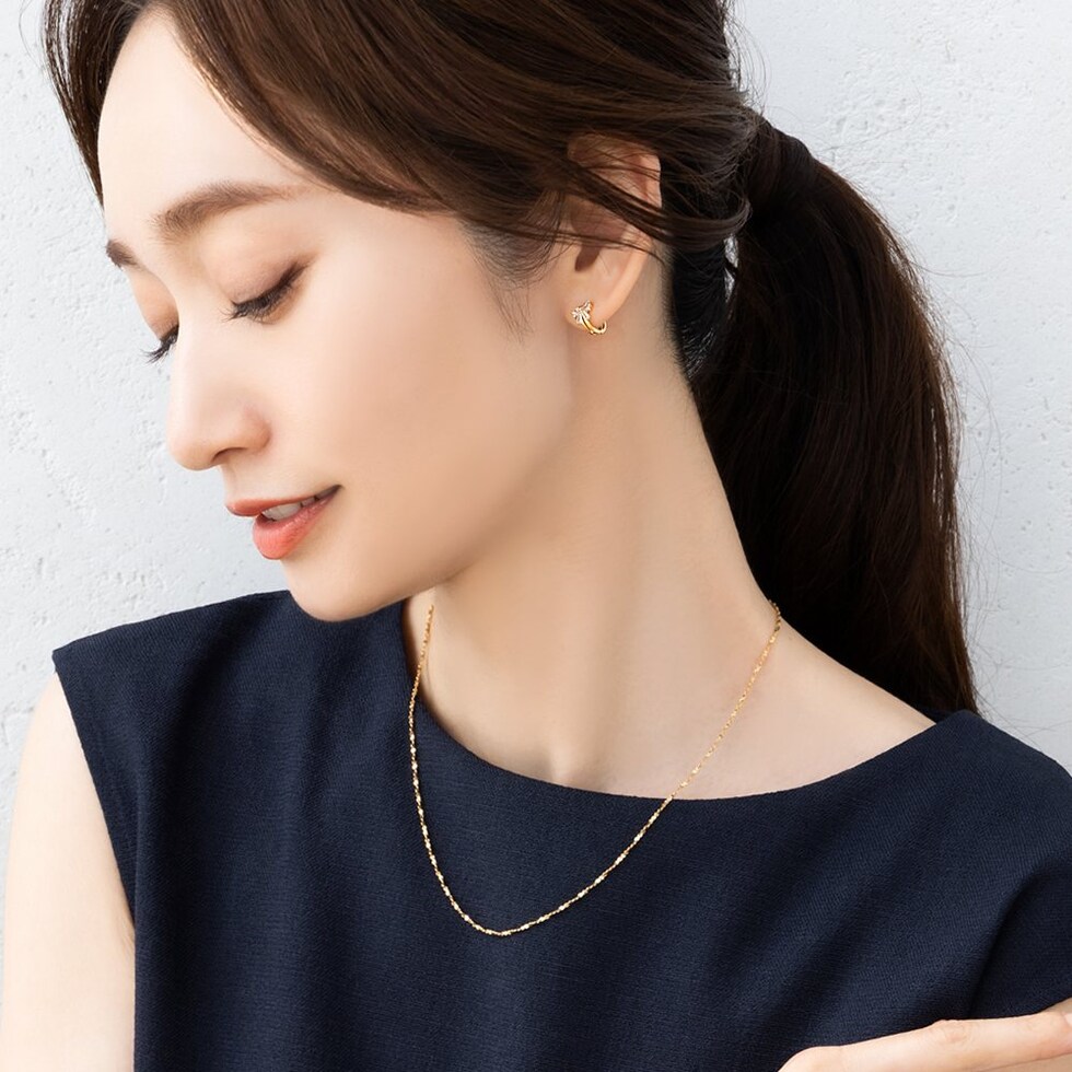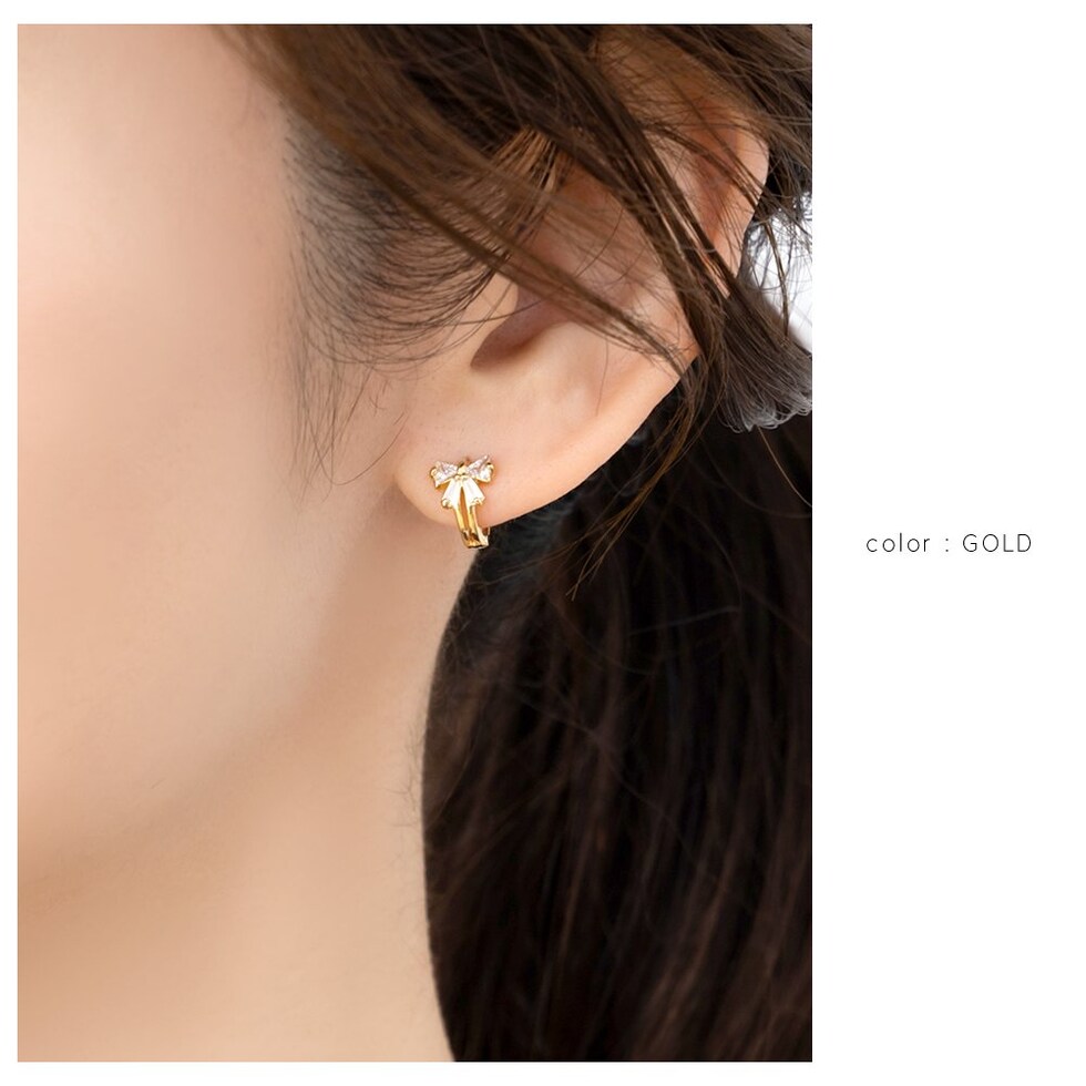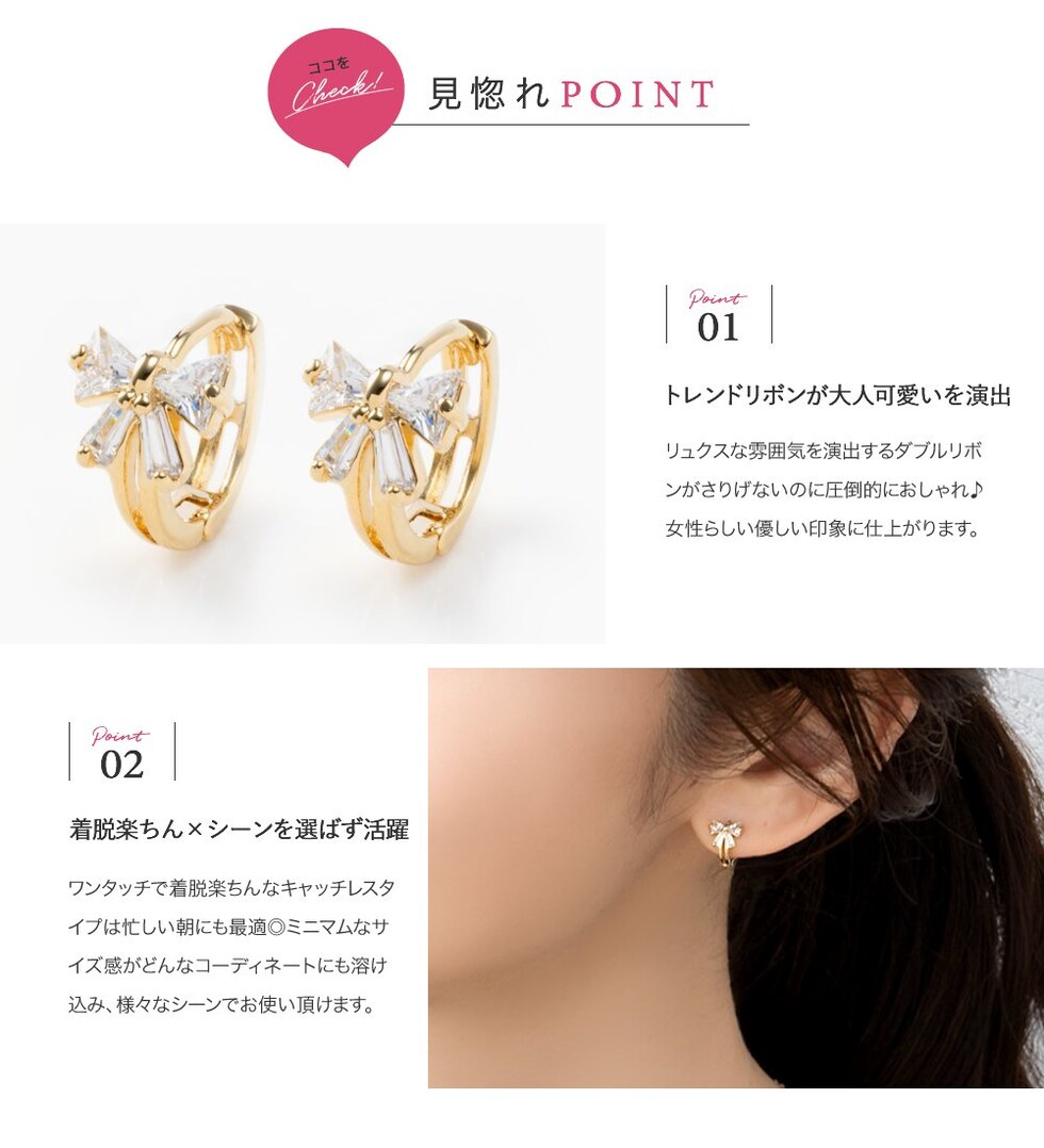 小粒なビジューのリボンが大人可愛いフープピアス。ぴったりと耳に沿うようなミニマムなサイジングとさりげないリボンモチーフが上品な印象に。ワンタッチ&落としにくいキャッチレスタイプなのも嬉しいひと品。