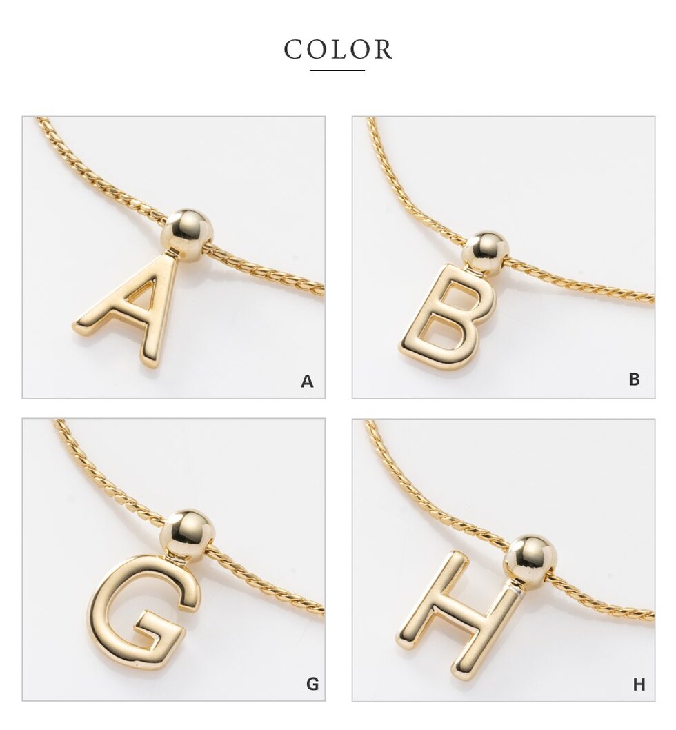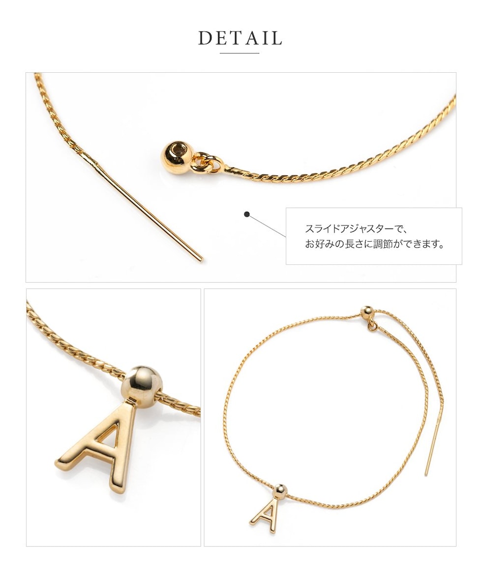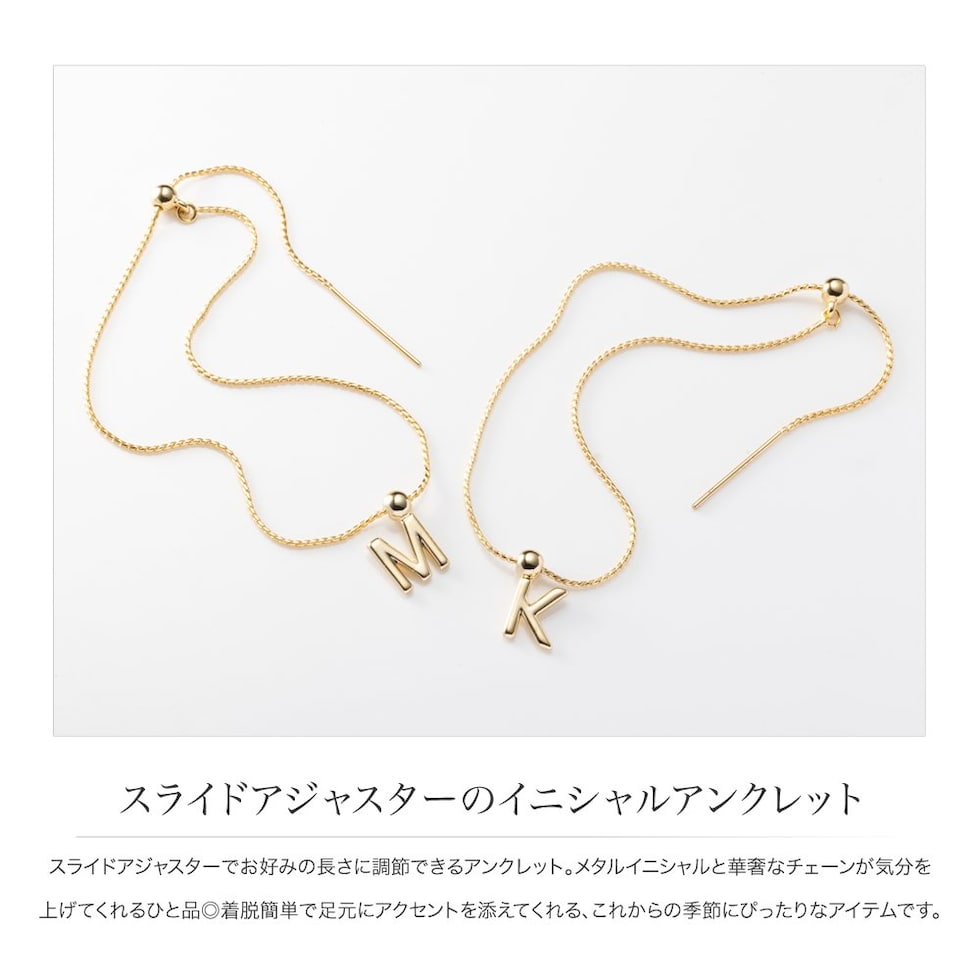 スライドアジャスターでお好みの長さに調節できるアンクレット。メタルイニシャルと華奢なチェーンが気分を上げてくれるひと品◎着脱簡単で足元にアクセントを添えてくれる、これからの季節にぴったりなアイテムです。