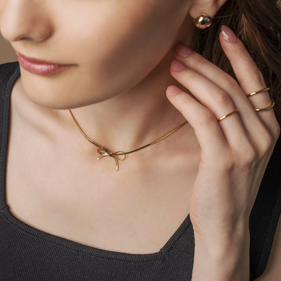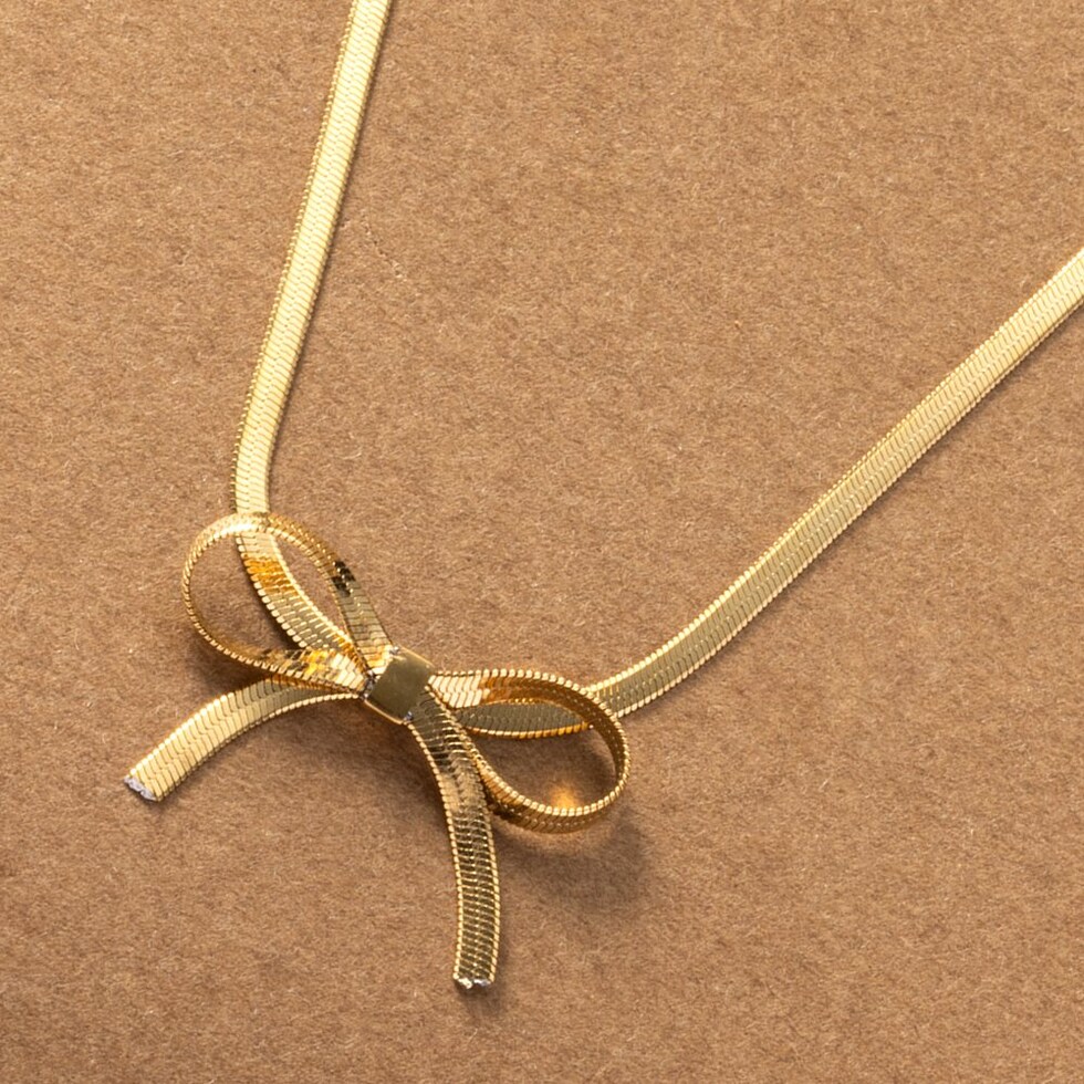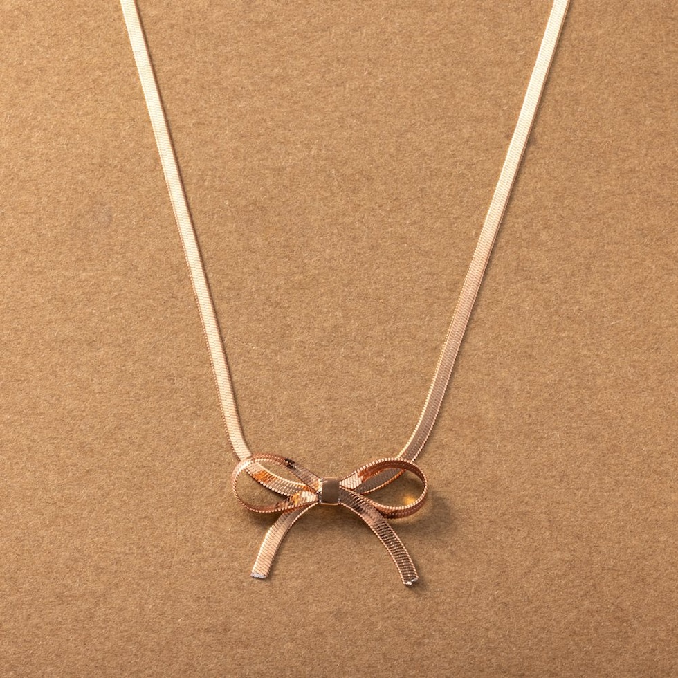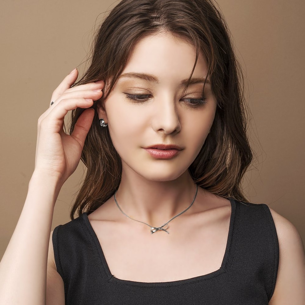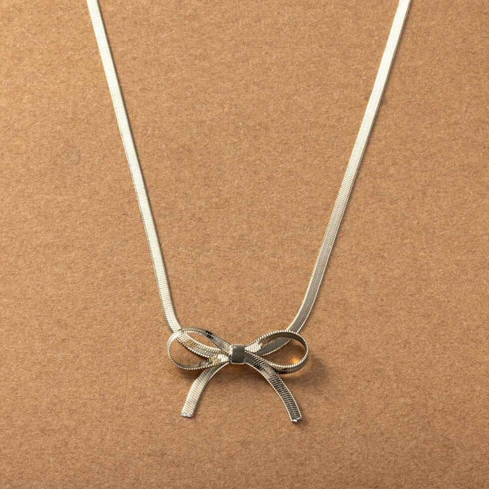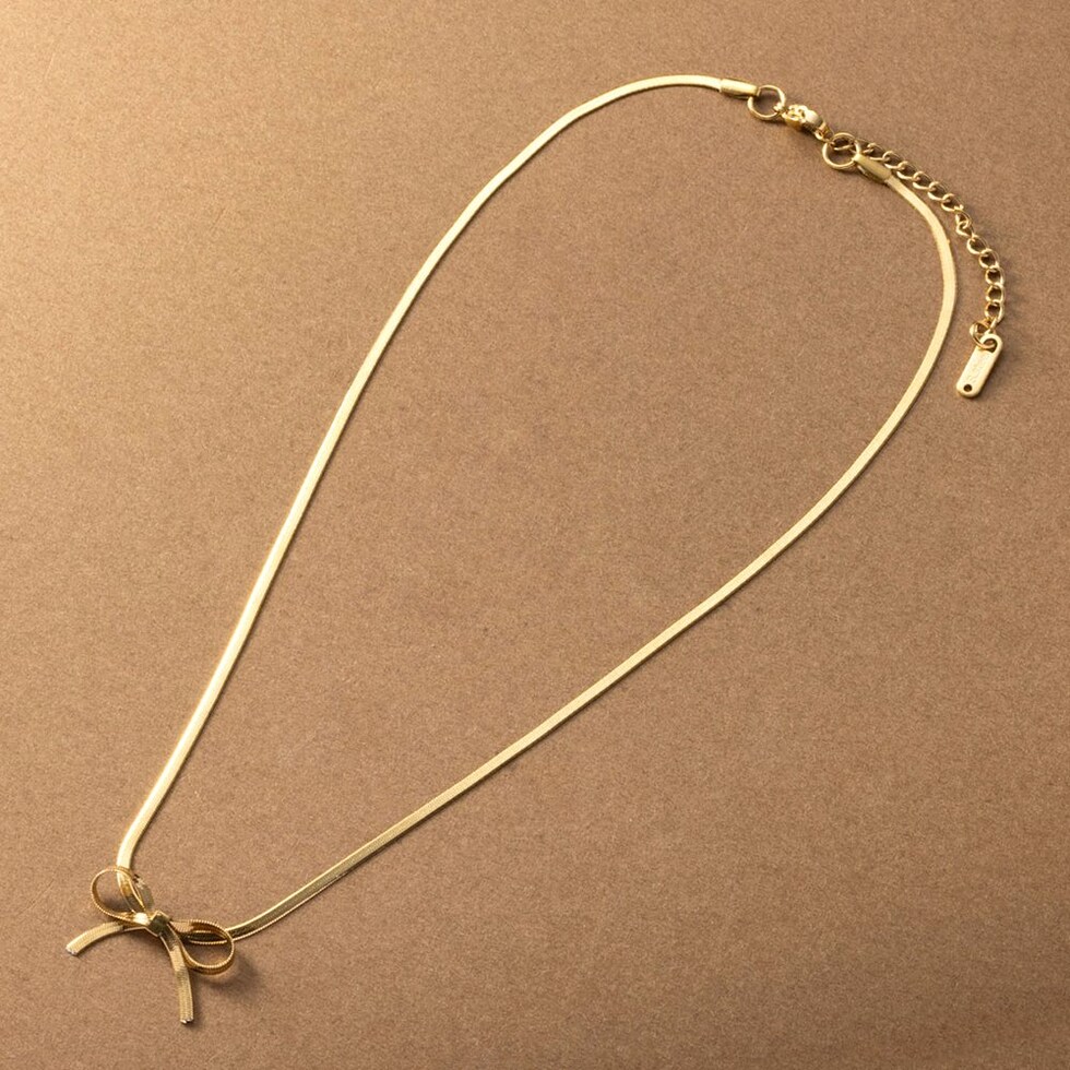 チェーンリボンのステンレス製ネックレス。3mm幅の平スネークチェーンをきゅっと結んだようなリボンがモードな印象。シャープな輝きで甘くなり過ぎないから大人コーデのポイント使いにぴったり◎錆びにくいステンレス製でデイリーに活躍しそう。