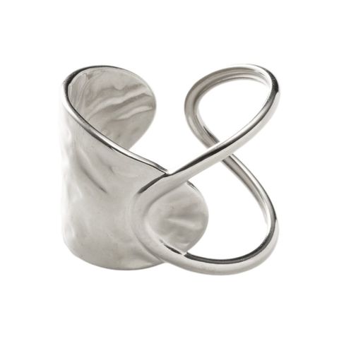 たたきメタルのクロス風ワイドオープンリング。角度によって表情が変わる個性的でひと味違ったデザインが、手元にモードな印象をプラス。錆びにくいステンレス製でデイリーに活躍しそう。
