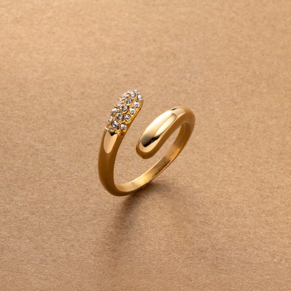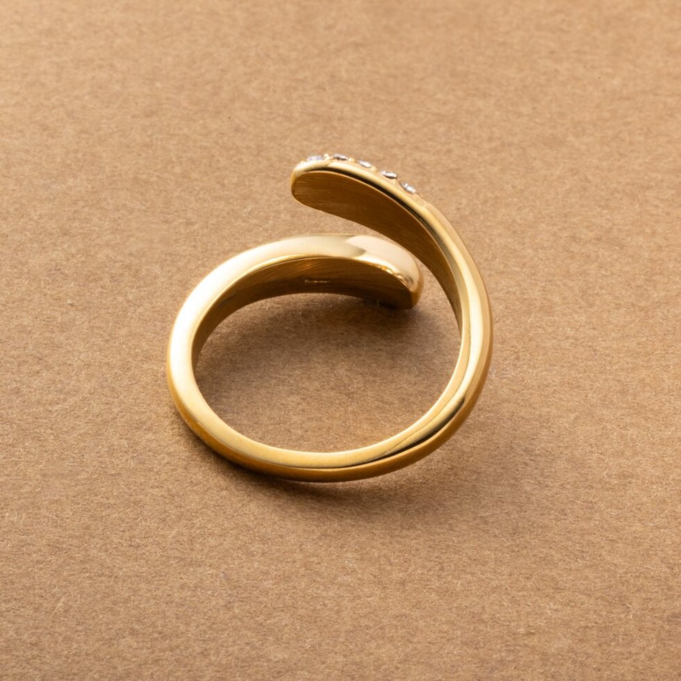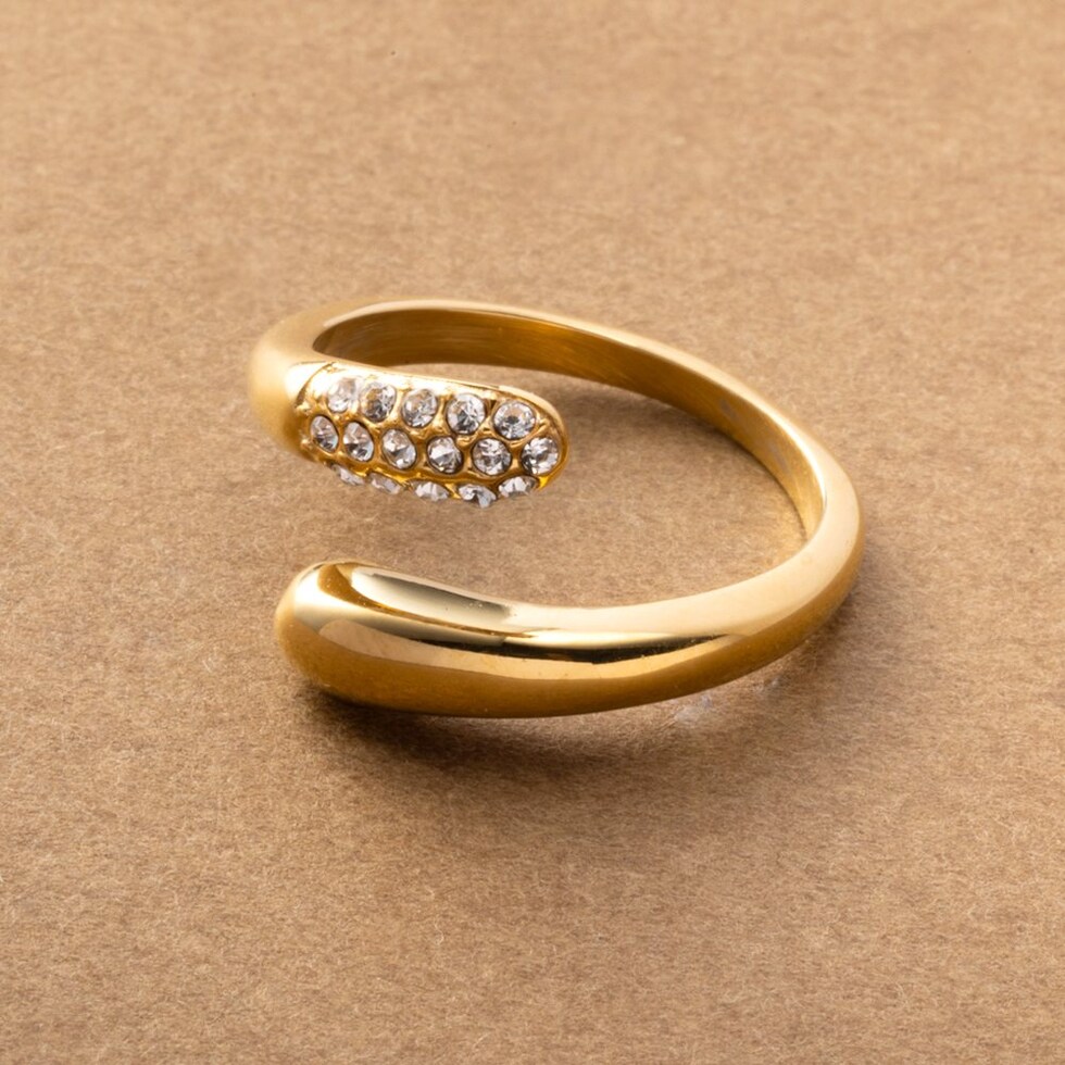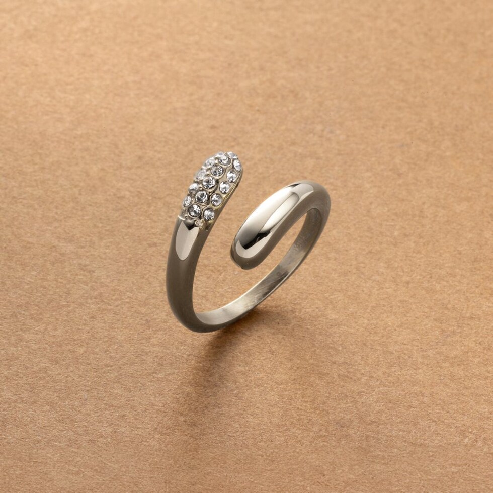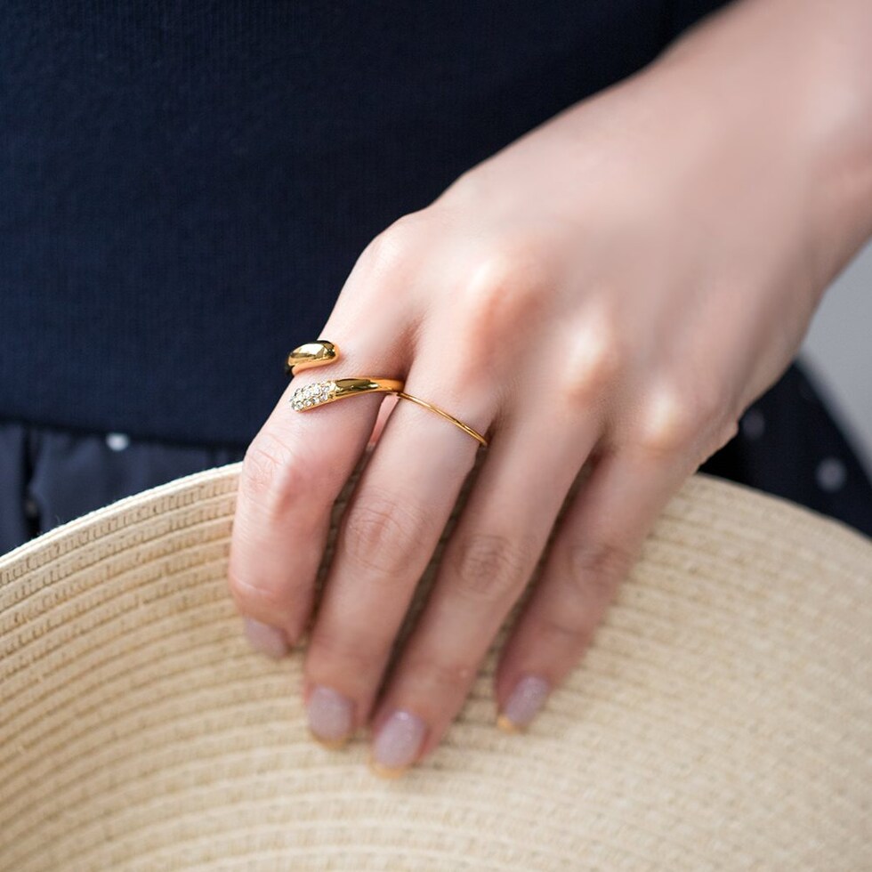 キラキラと繊細な輝きを放つダブルドロップのフォークリング。指を包み込むようなニュアンスのあるシルエットと重厚感が大人の手元に映えるアイテム。微調節できるフリーサイズ&錆びにくく傷に強いステンレス製でデイリーに活躍間違いナシ◎長時間の着用も安心の低アレルギー素材です。