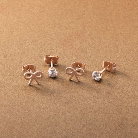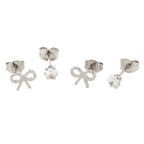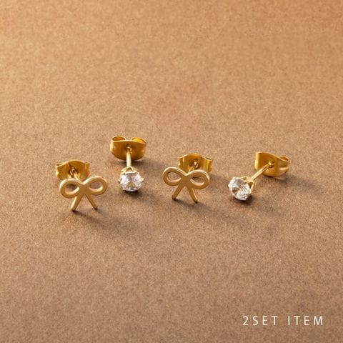 リボンモチーフと煌めく一粒ビジューの2点セットスタッドピアス。時代を超えて愛されるタイムレスなデザインで、コーデを選ばず身につけられるアイテムです。錆びにくく傷に強いステンレス製で、長時間の着用も安心の低アレルギー素材です。
