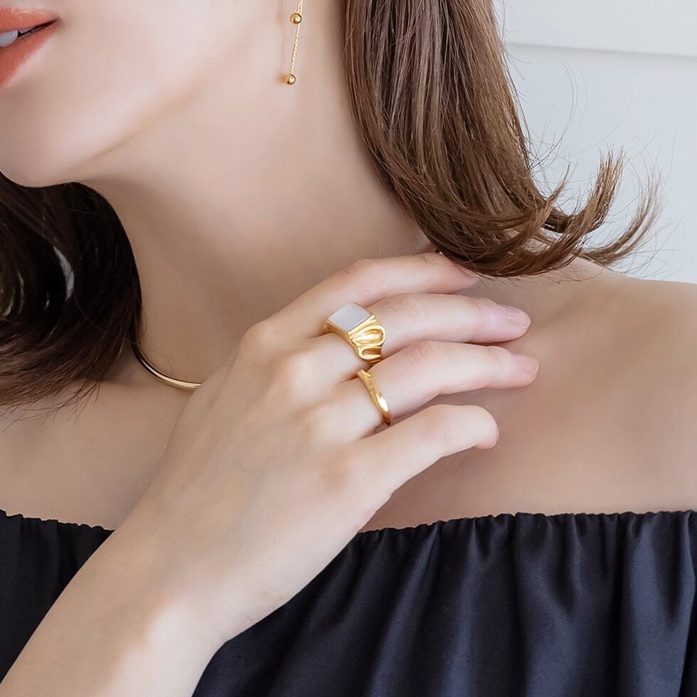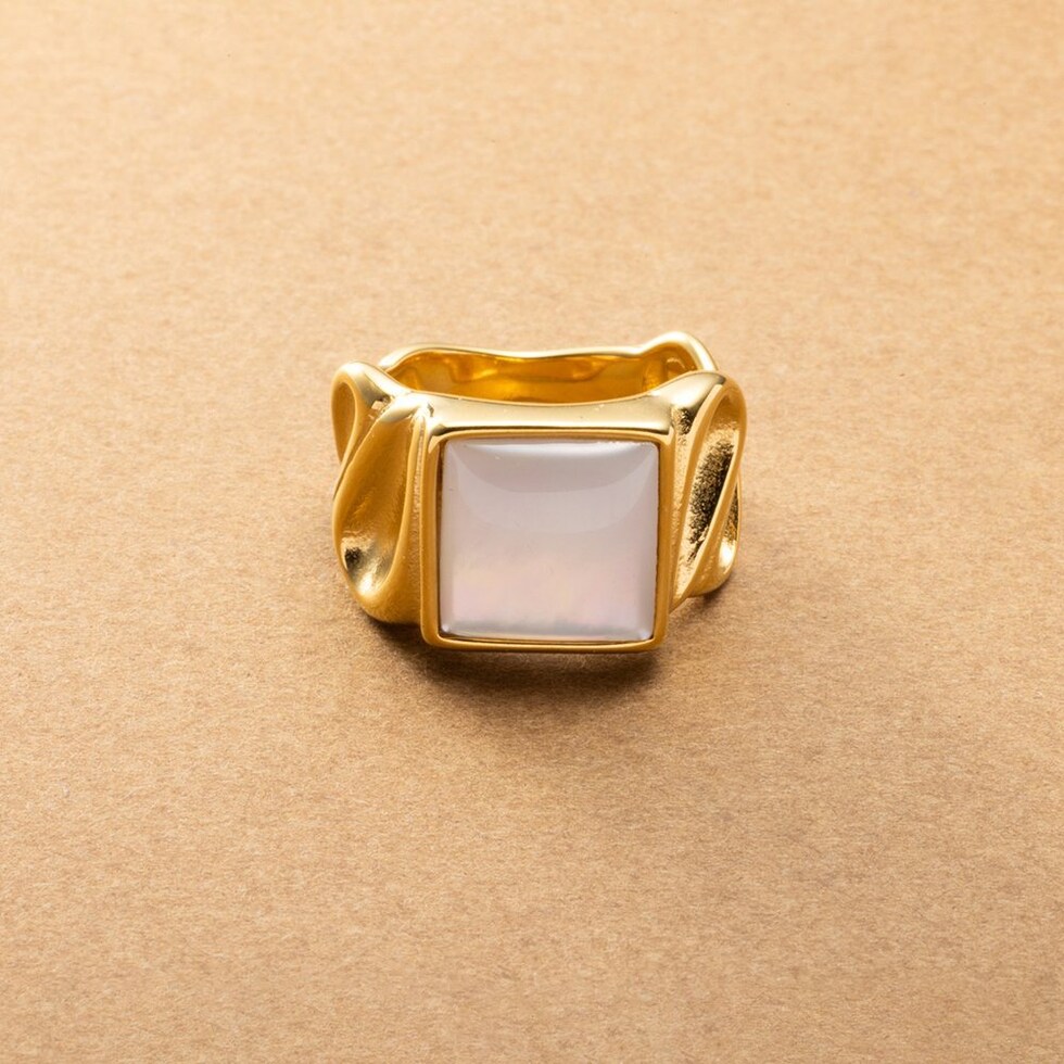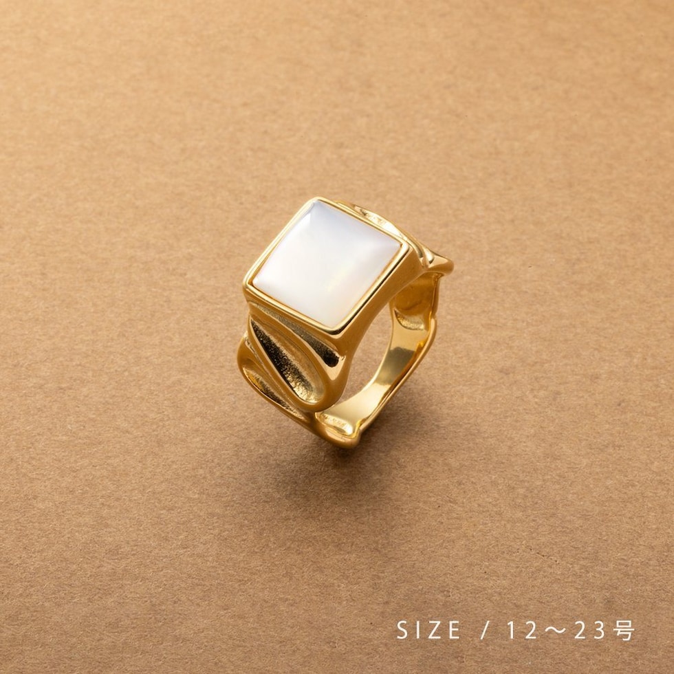 リング 指輪 ステンレス 金属アレルギー サージカルステンレス レディース つけっぱなし シェル 貝 艶 ウェーブ ボリューム スクエア 四角 ワイド メタル 幅広 ホワイト cream dot ゆうパケット [ゴールド_15号]