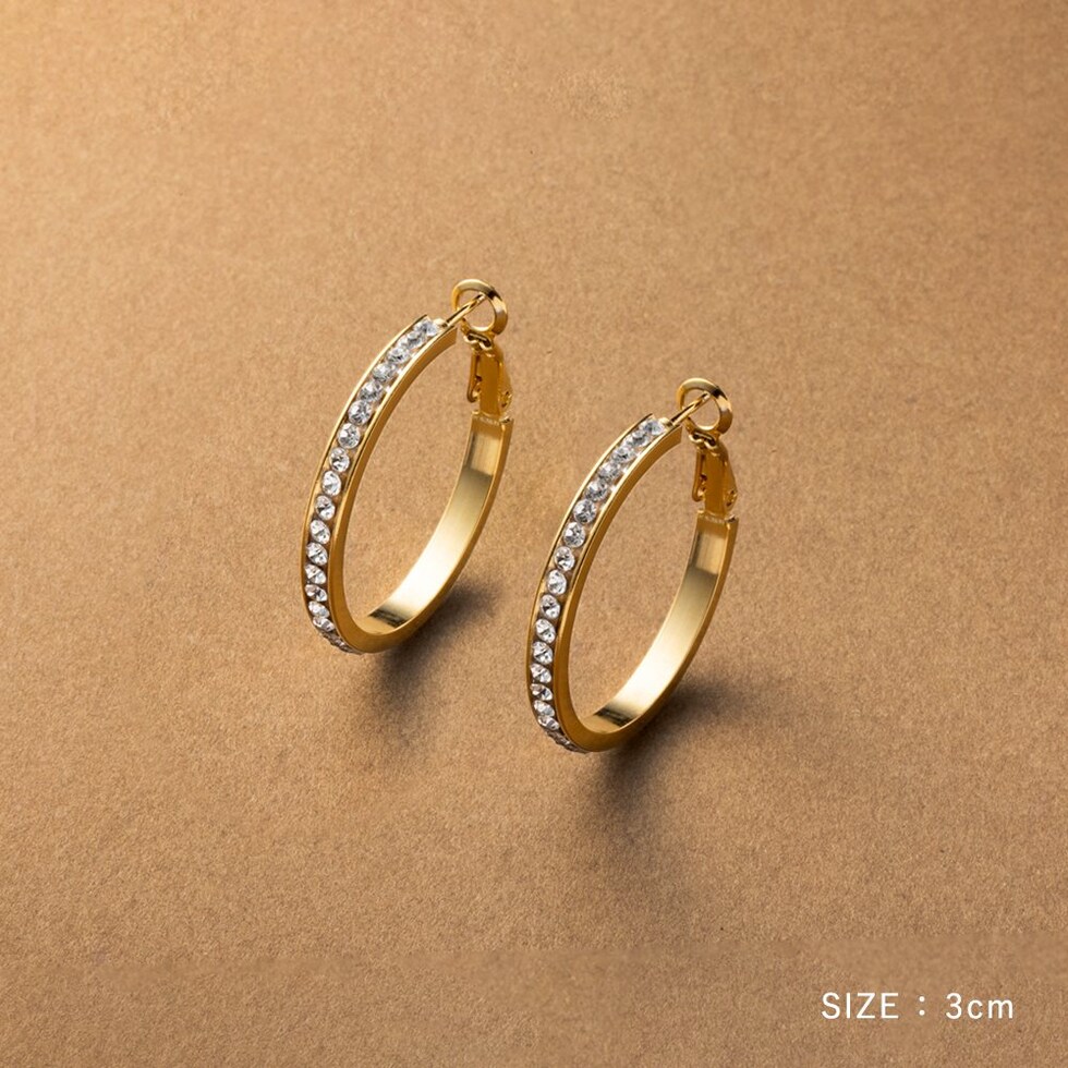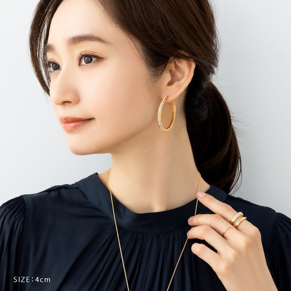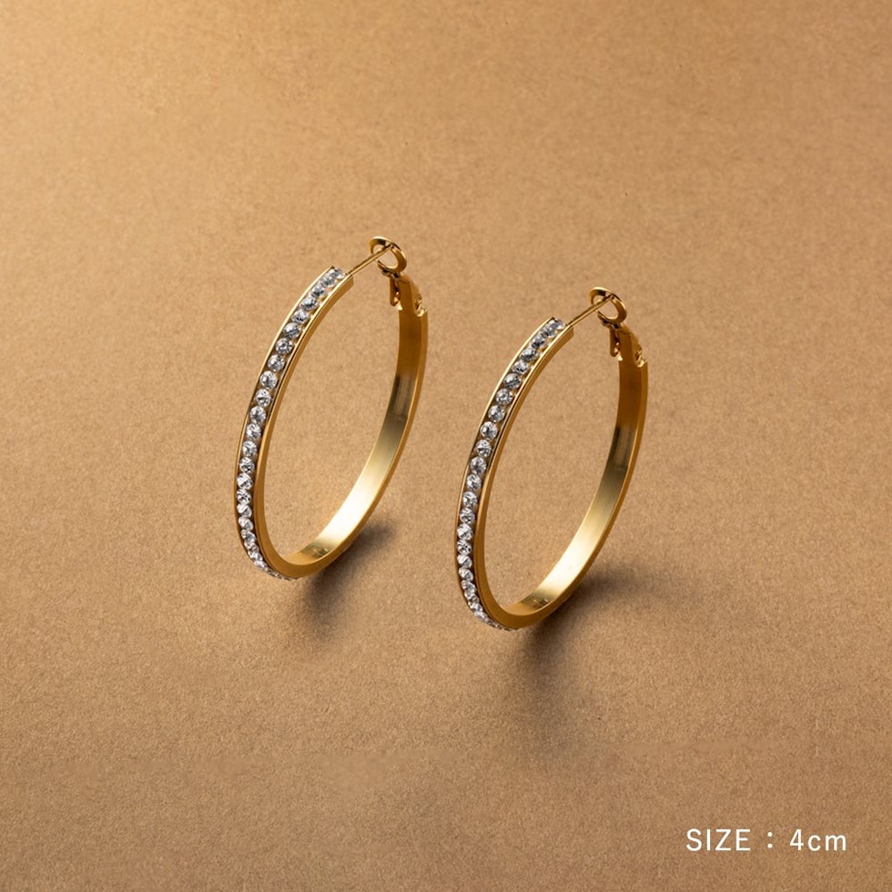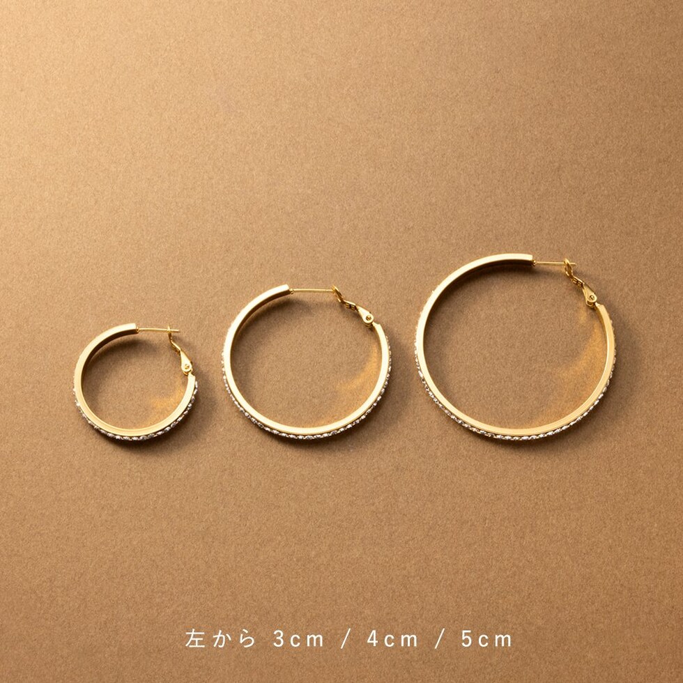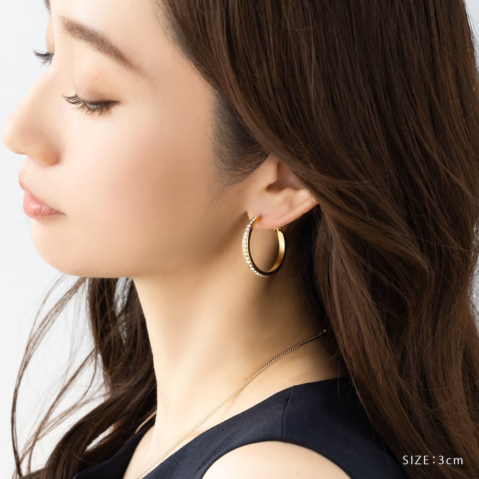 選べる3サイズのビジューライン煌めくキャッチレスフープピアス。存在感を放つサイジングとビジューの輝きが顔周りを華やかに演出するひと品。長時間の着用にもオススメなステンレス製なのも嬉しいアイテムです。