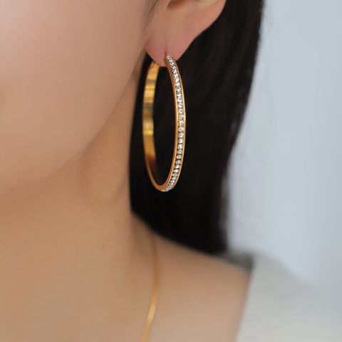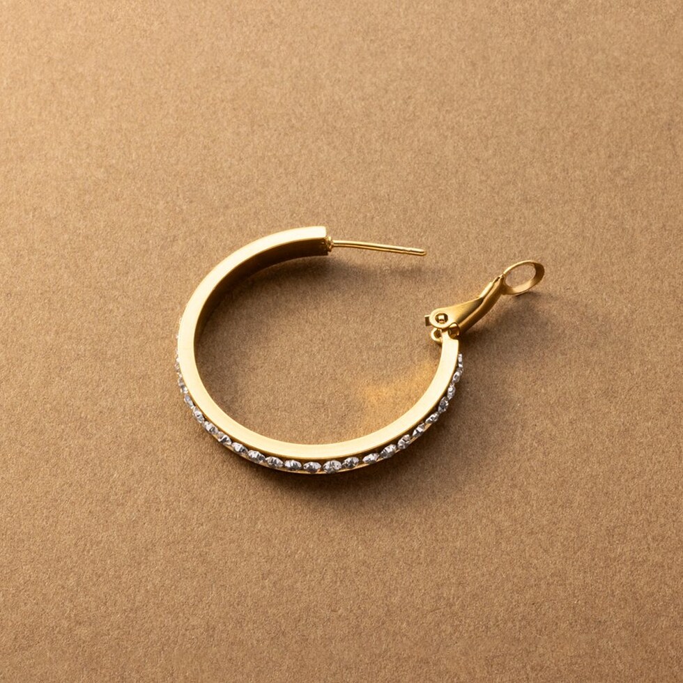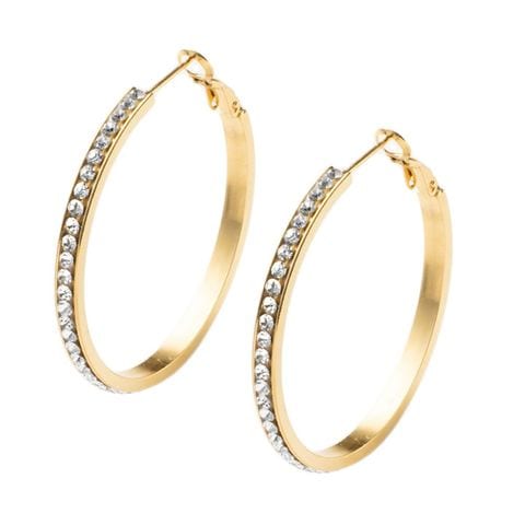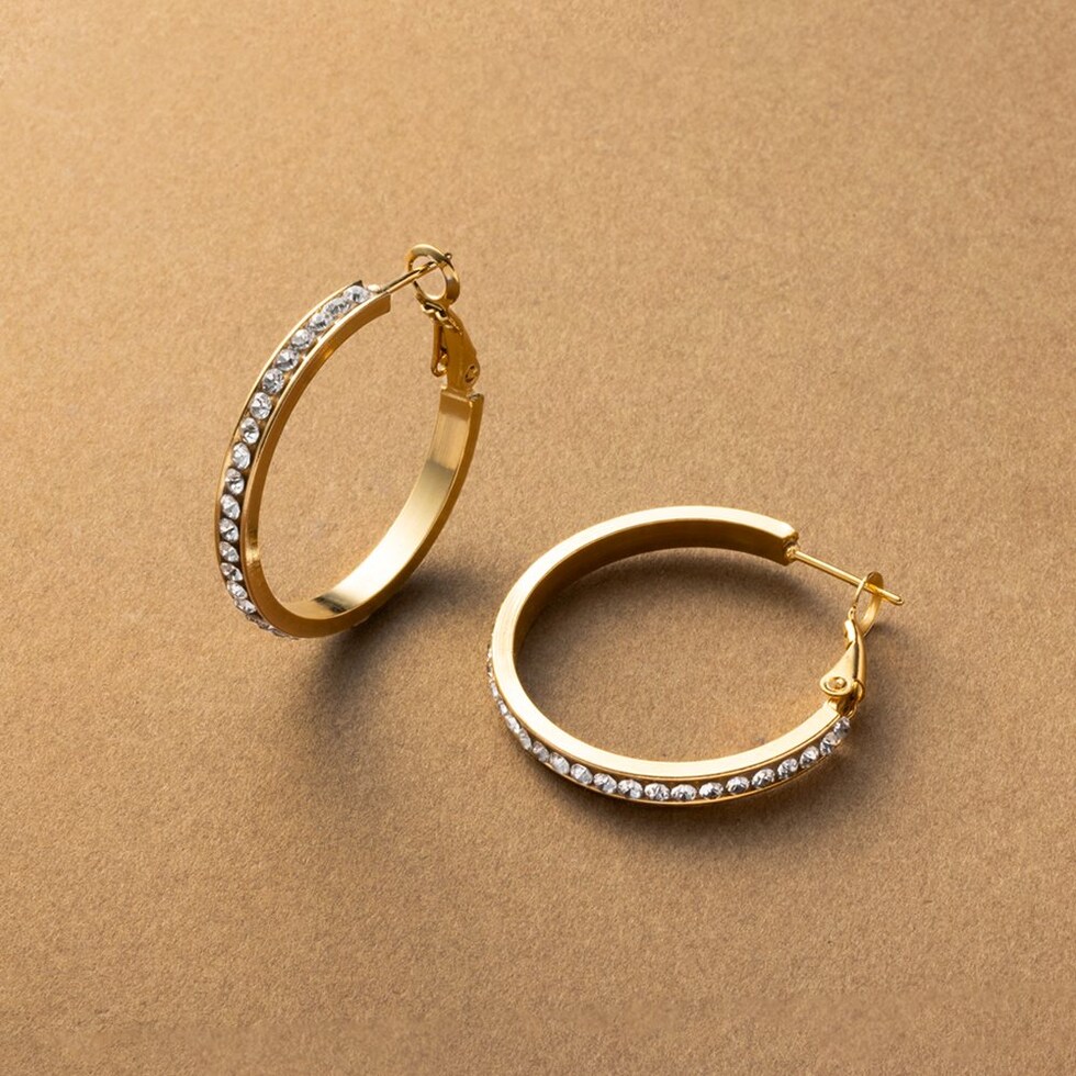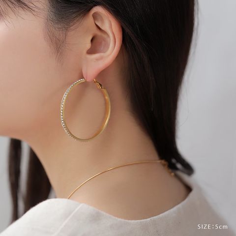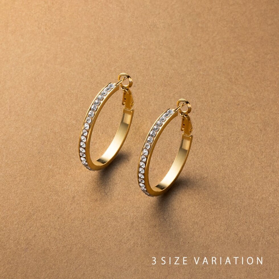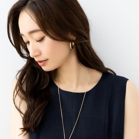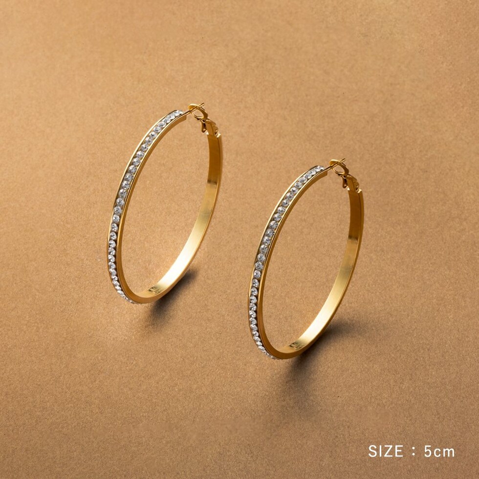 選べる3サイズのビジューライン煌めくキャッチレスフープピアス。存在感を放つサイジングとビジューの輝きが顔周りを華やかに演出するひと品。長時間の着用にもオススメなステンレス製なのも嬉しいアイテムです。