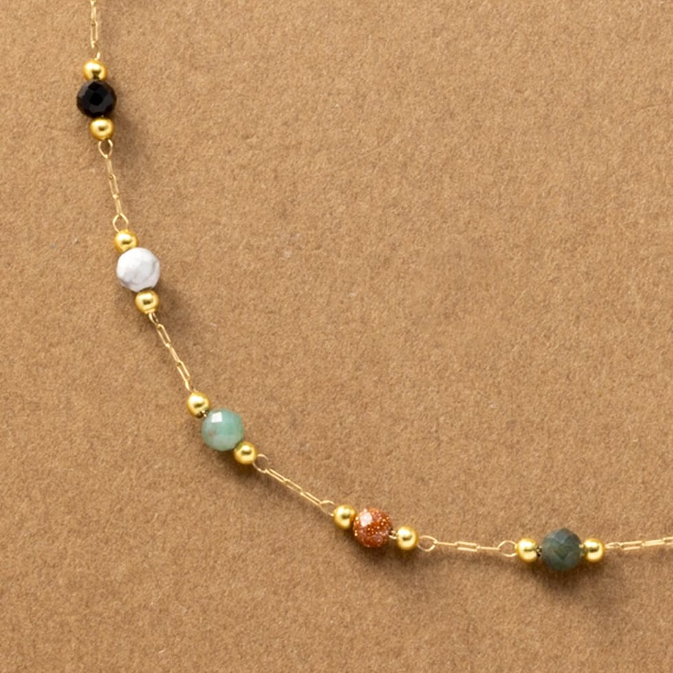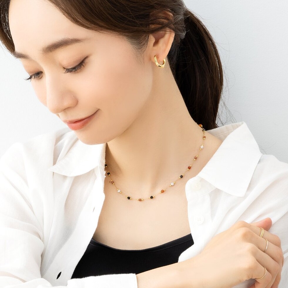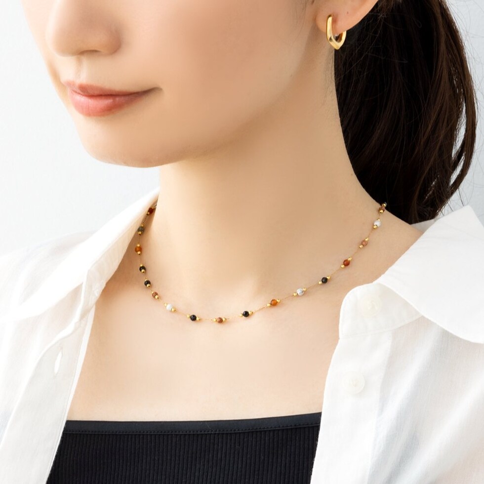 彩りたっぷりの天然石ビジューが首元を華やかに演出してくれるマルチカラーネックレス。色鮮やかでカラーパレットのような天然石が様々な表情を見せ、シーズンライクに仕上がるひと品。