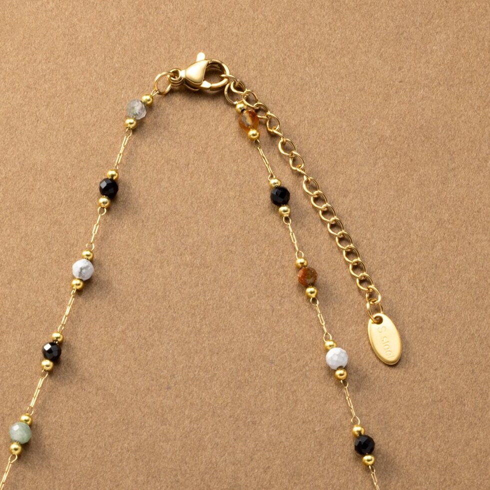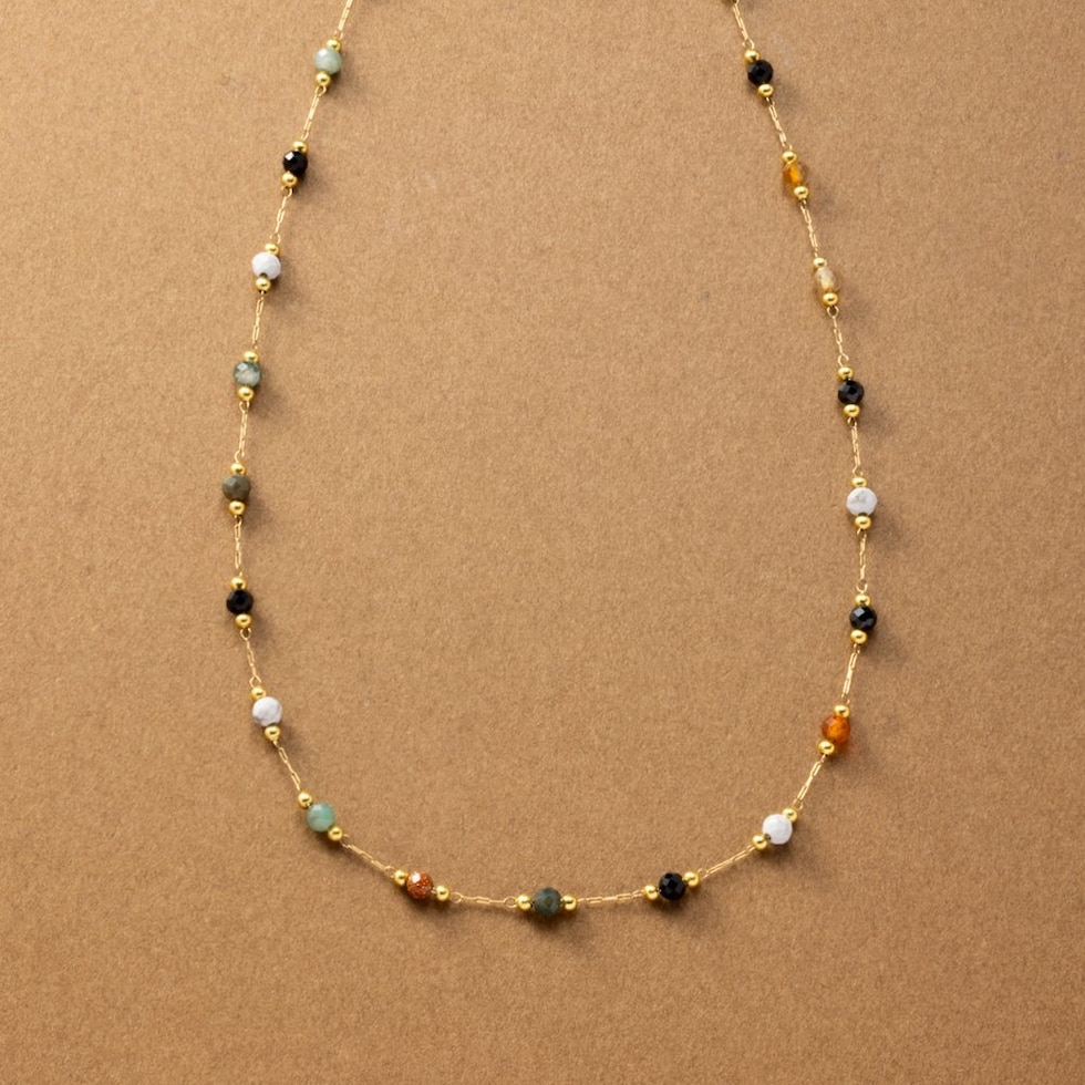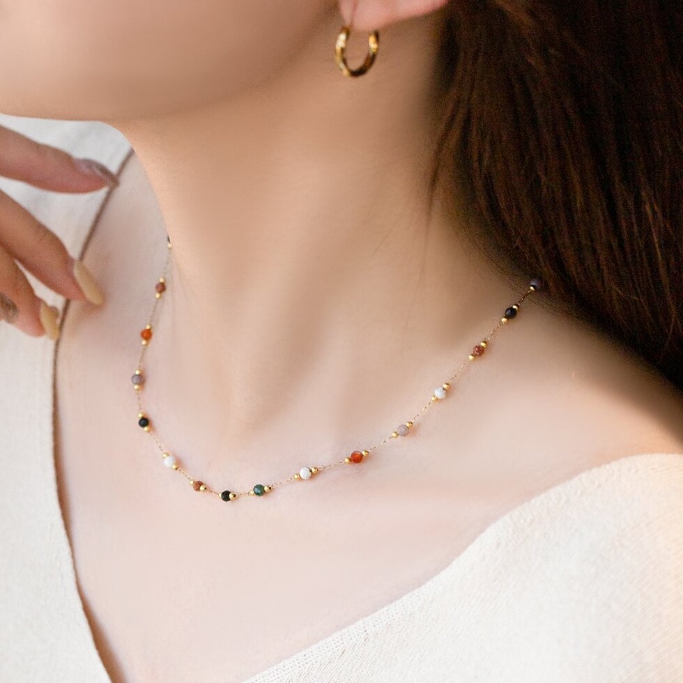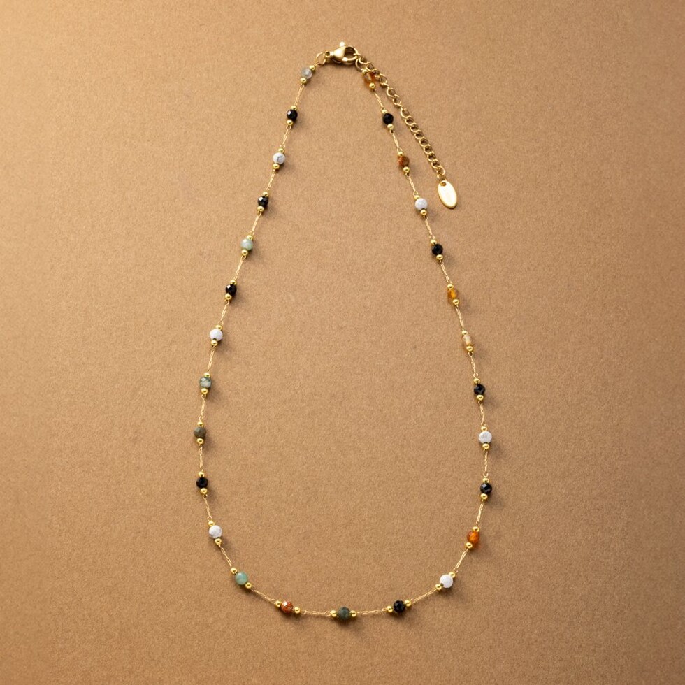 彩りたっぷりの天然石ビジューが首元を華やかに演出してくれるマルチカラーネックレス。色鮮やかでカラーパレットのような天然石が様々な表情を見せ、シーズンライクに仕上がるひと品。