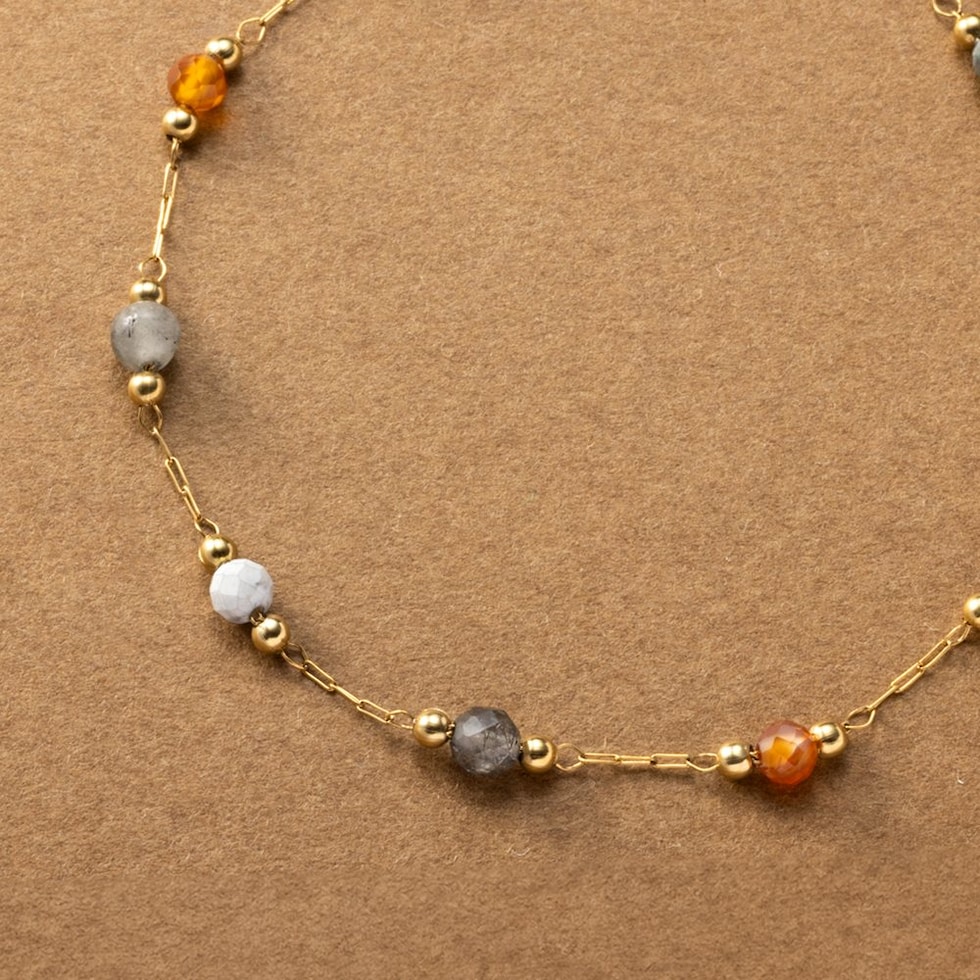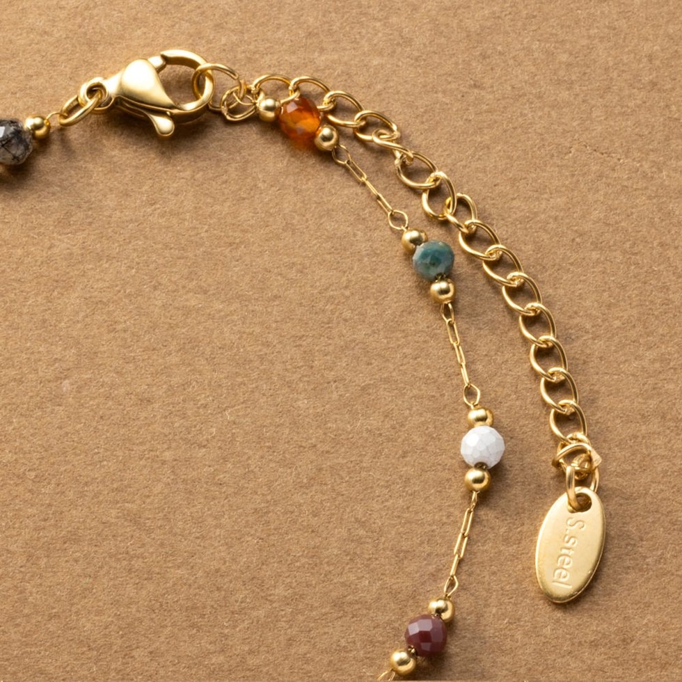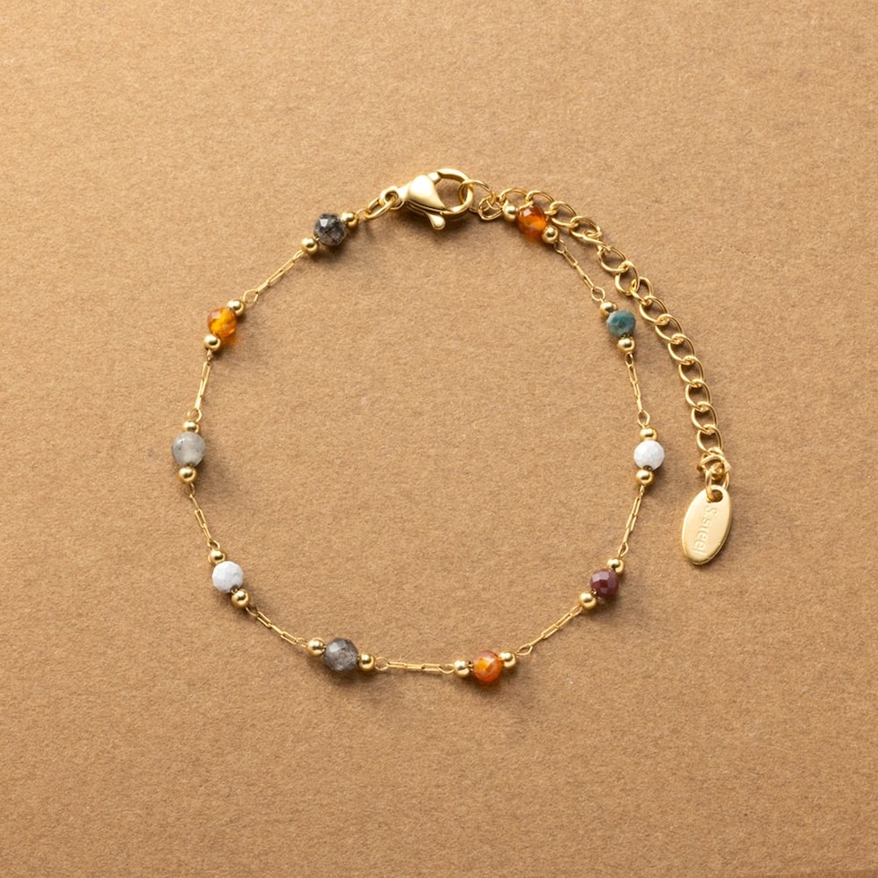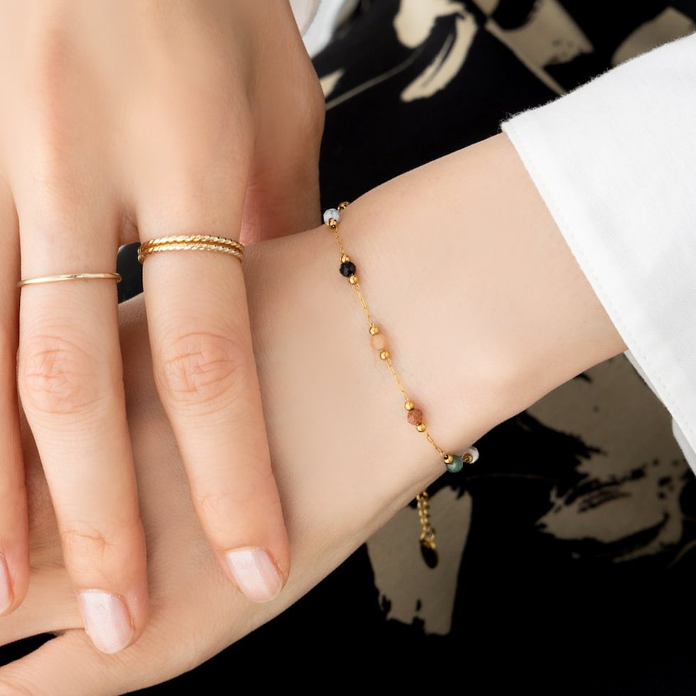 彩りたっぷりの天然石ビジューが手元を華やかに演出してくれるマルチカラーブレスレット。色鮮やかでカラーパレットのような天然石が様々な表情を見せ、シーズンライクに仕上がるひと品。