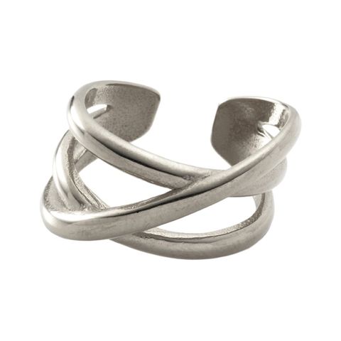 ニュアンス漂う3本のメタルラインを重ねたクロスリング。ボリュームがありながらも柔らかな曲線が手元に品の良い存在感をプラス。シンプルなデザインで錆びにくいステンレス製だからデイリーに活躍しそう。