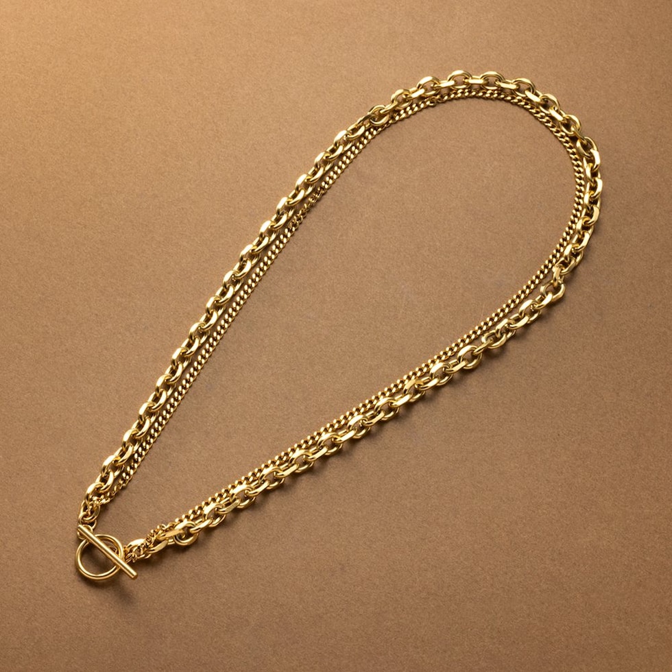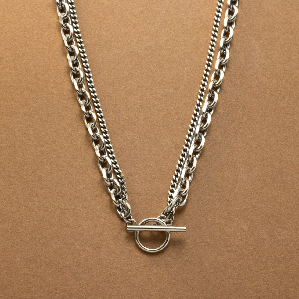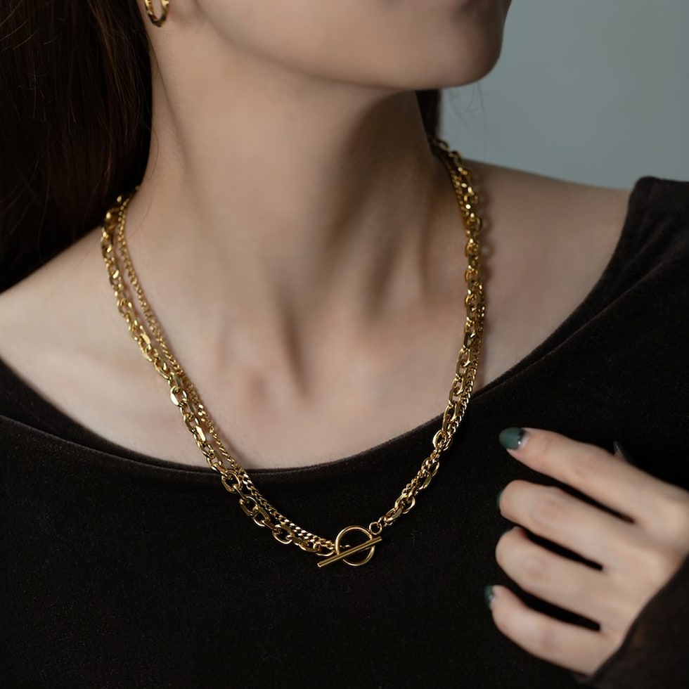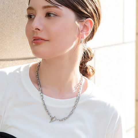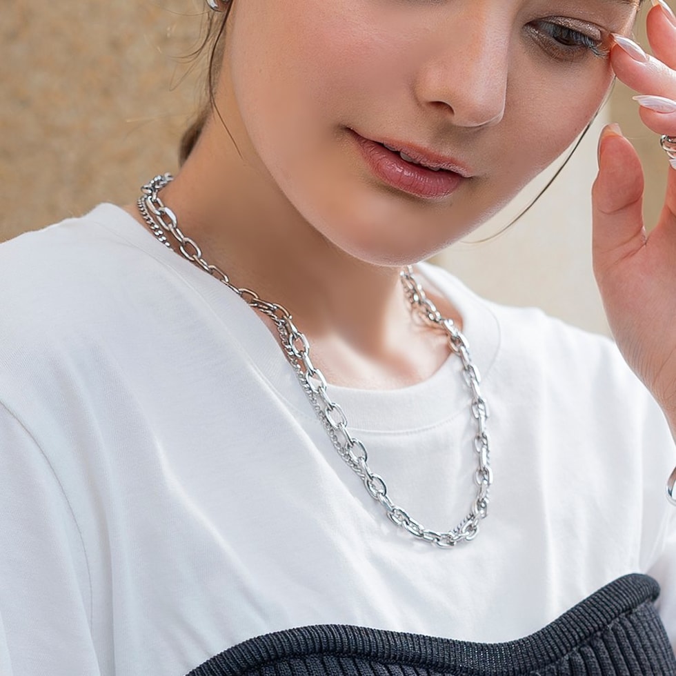 重厚感たっぷりなレイヤードチェーンのステンレス製マンテルネックレス。絶妙なボリューム感でひと味違う今っぽいスタイルを完成させます。シンプルやカジュアルに映える存在感抜群なアイテム。モチーフを後ろにしてもご着用できる、錆びにくいステンレス製でデイリーに活躍しそう◎