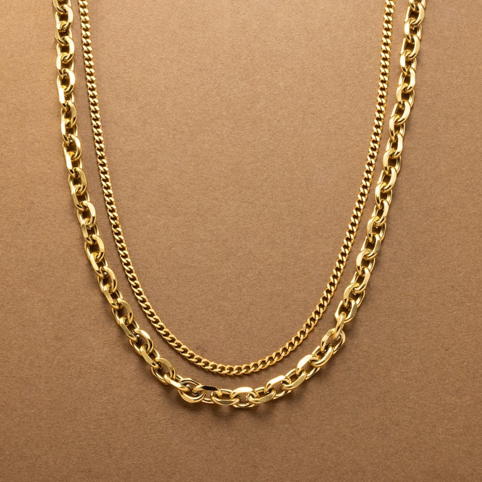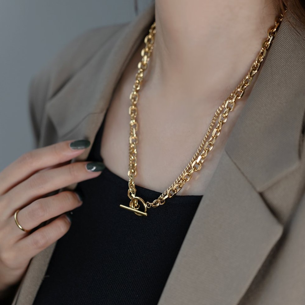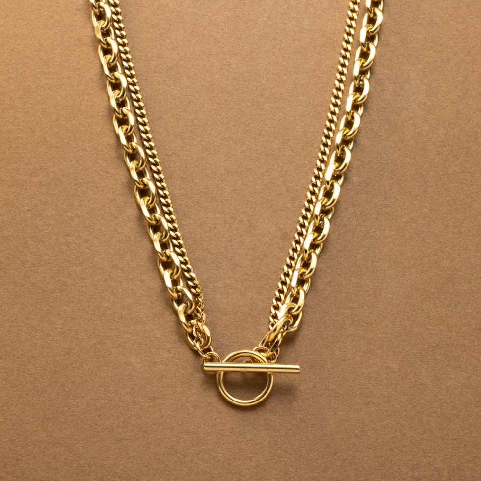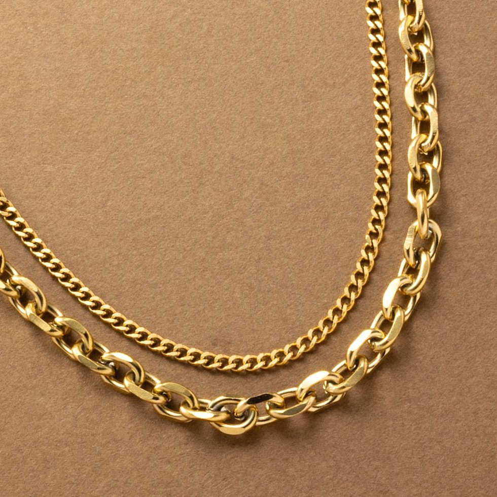 重厚感たっぷりなレイヤードチェーンのステンレス製マンテルネックレス。絶妙なボリューム感でひと味違う今っぽいスタイルを完成させます。シンプルやカジュアルに映える存在感抜群なアイテム。モチーフを後ろにしてもご着用できる、錆びにくいステンレス製でデイリーに活躍しそう◎
