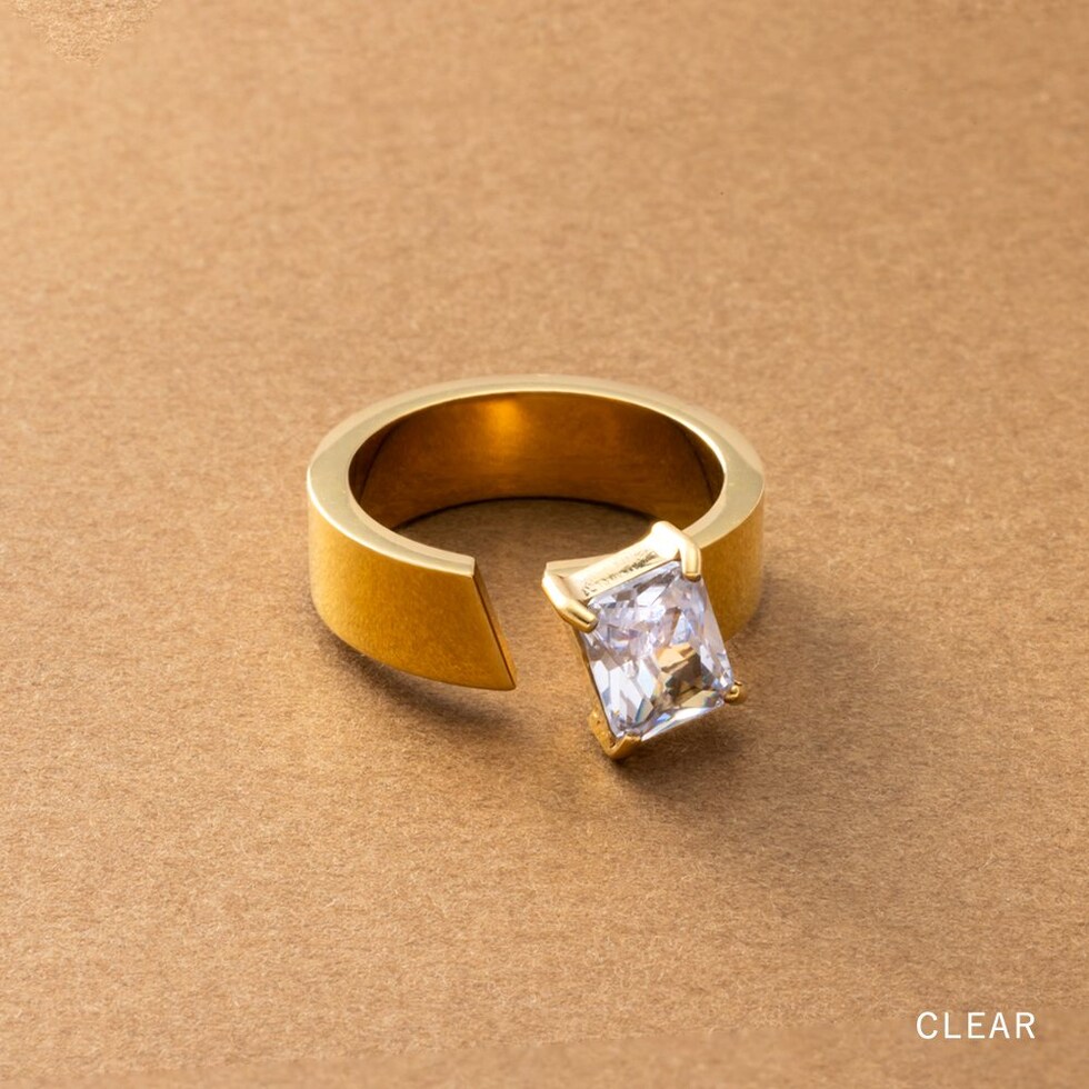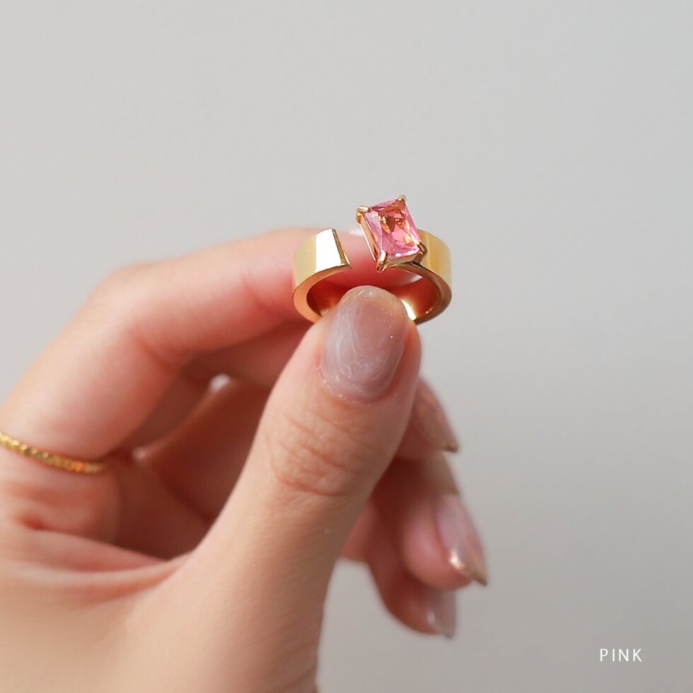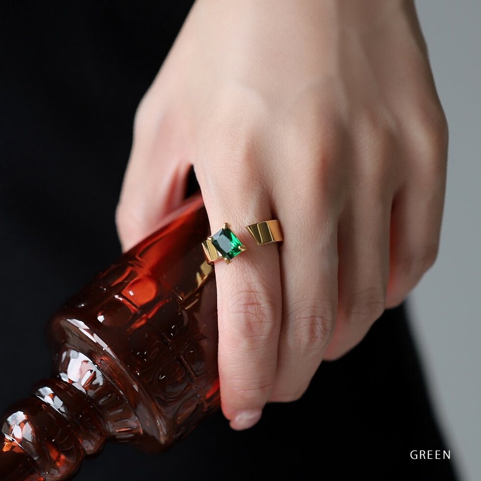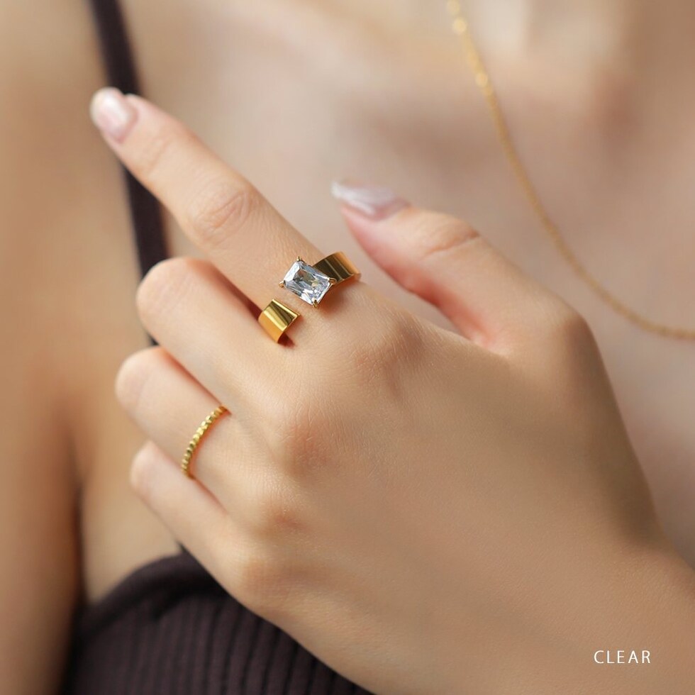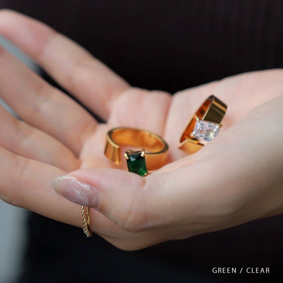 スクエアビジューが煌めくリング。アシンメトリーなデザインが、程よく個性的なアクセントを手元に添えるひと品。存在感のあるゴールドフレームで高見えに仕上がるアイテムです。