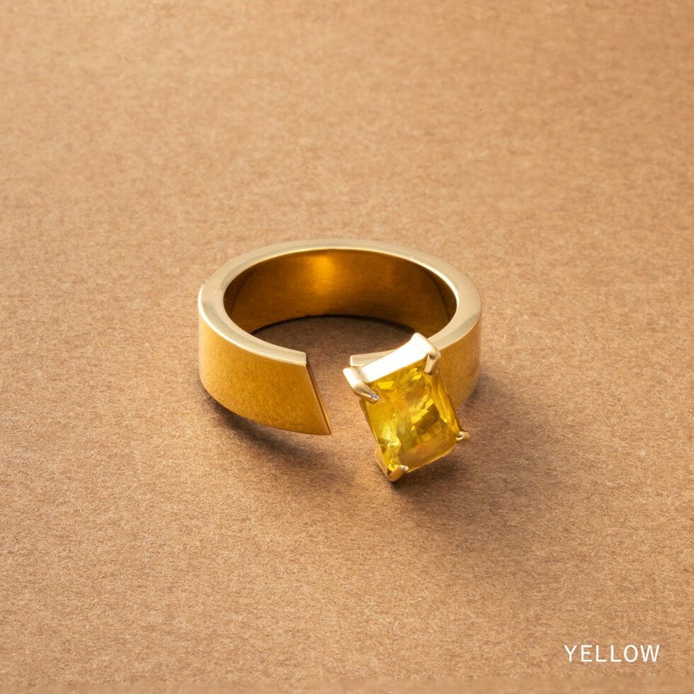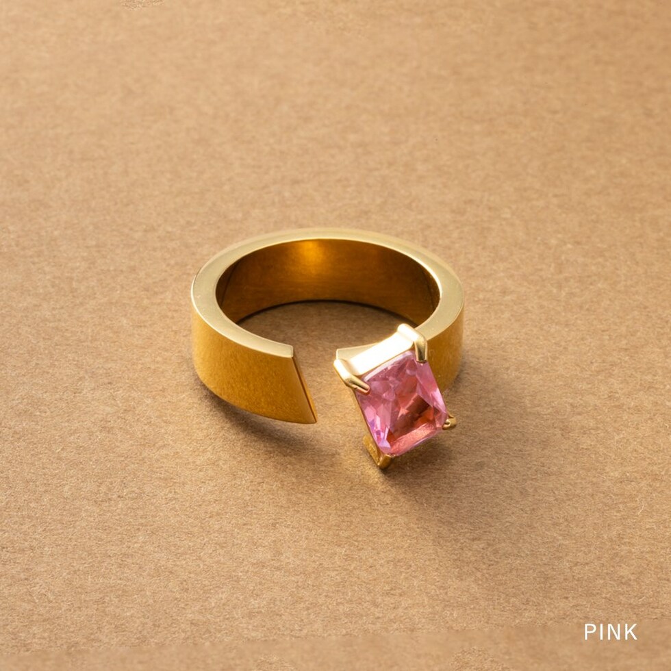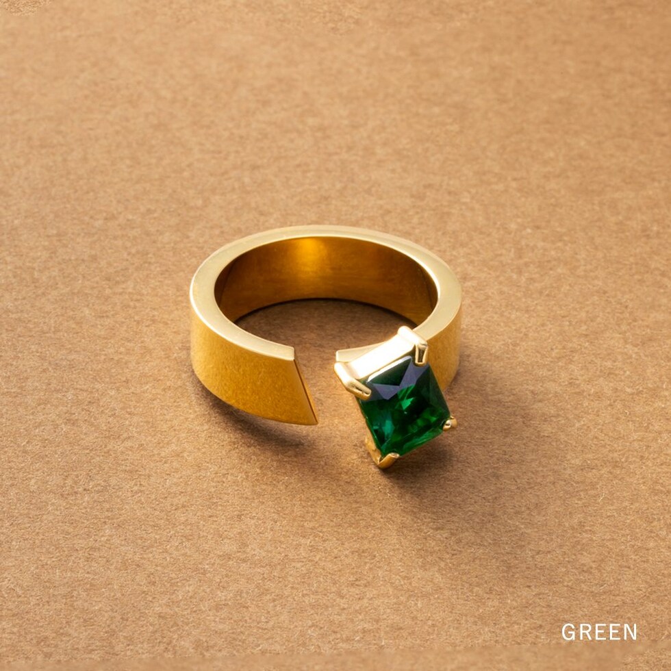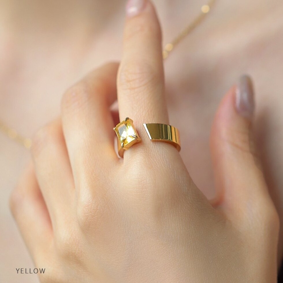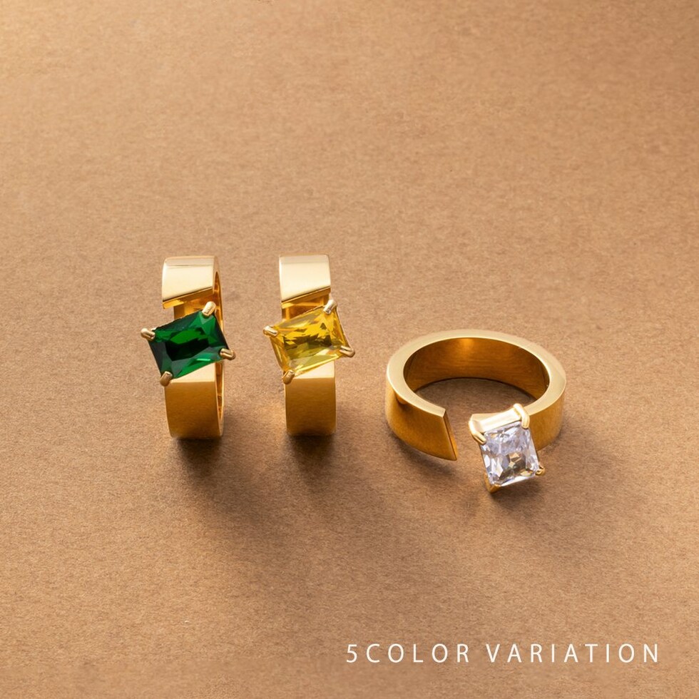 スクエアビジューが煌めくリング。アシンメトリーなデザインが、程よく個性的なアクセントを手元に添えるひと品。存在感のあるゴールドフレームで高見えに仕上がるアイテムです。