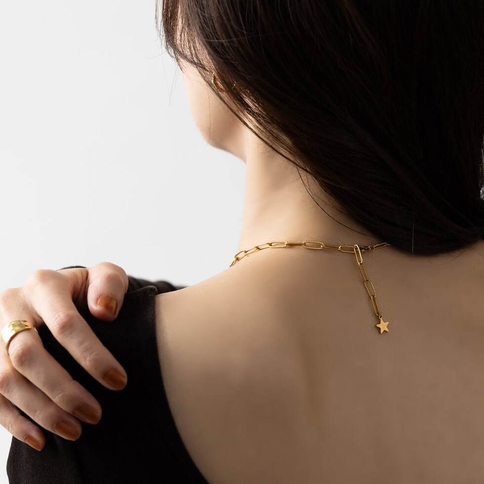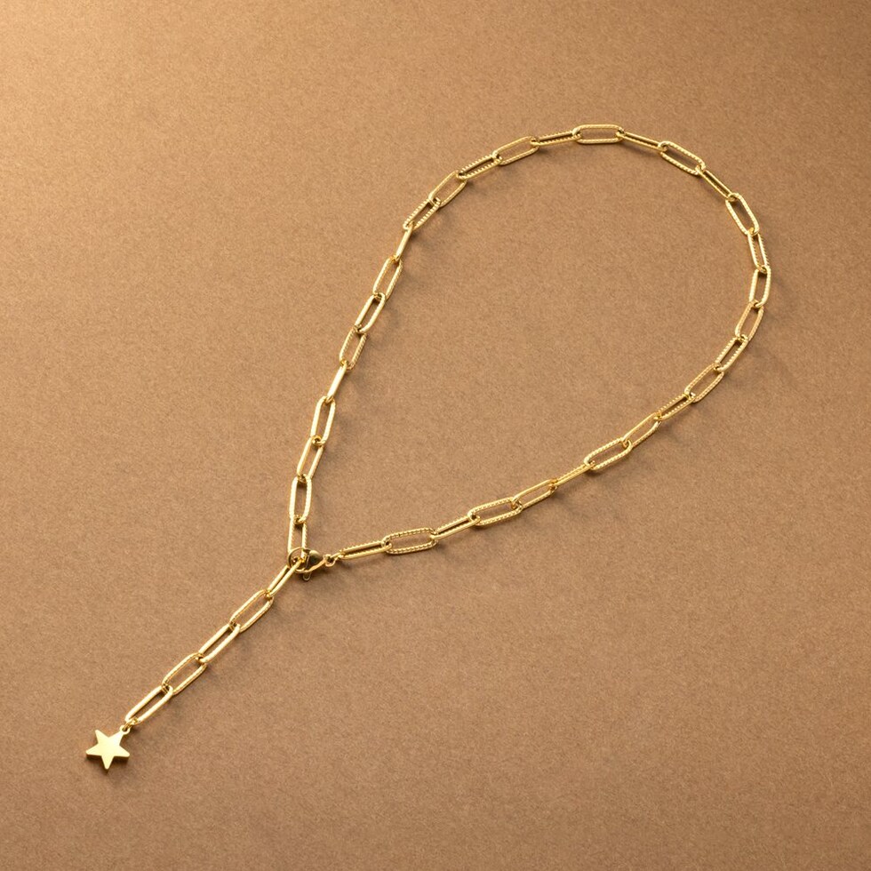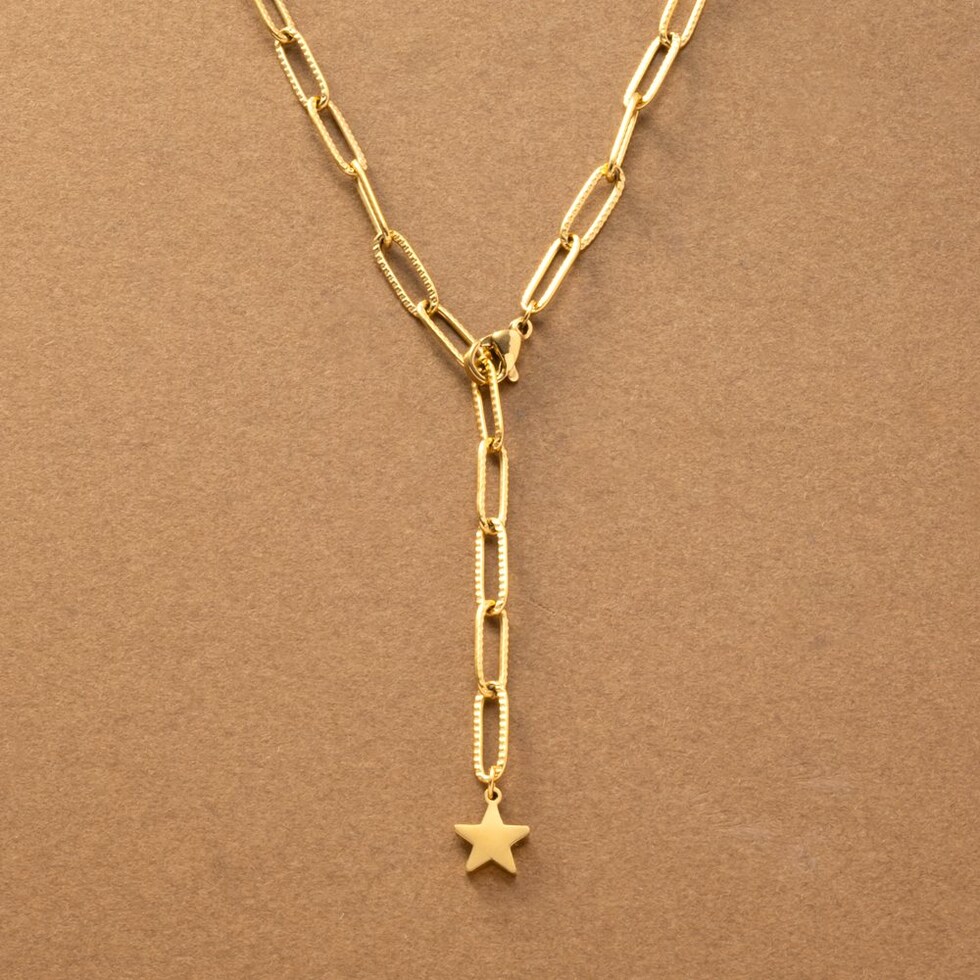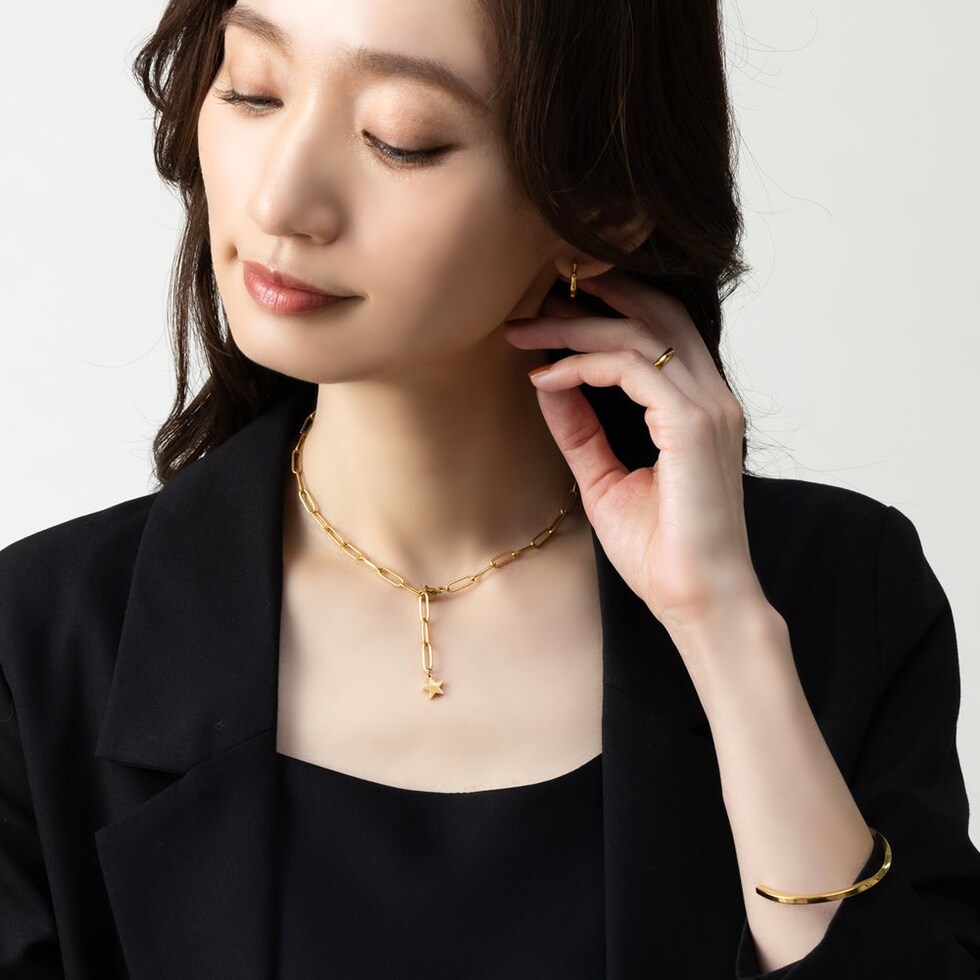 凹凸加工を施したオーバルチェーンとスターモチーフを組み合わせたY字ネックレス。さりげない星モチーフが、コーデにエッジの効いたアクセントとこなれた印象をプラス。モチーフを後ろ側にしてもお使いいただけるアレンジ自在なデザインも魅力◎肌馴染みもよく錆びにくいステンレス製だからデイリー使いにぴったりの一品です。