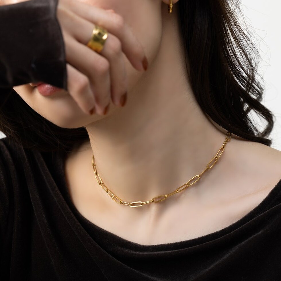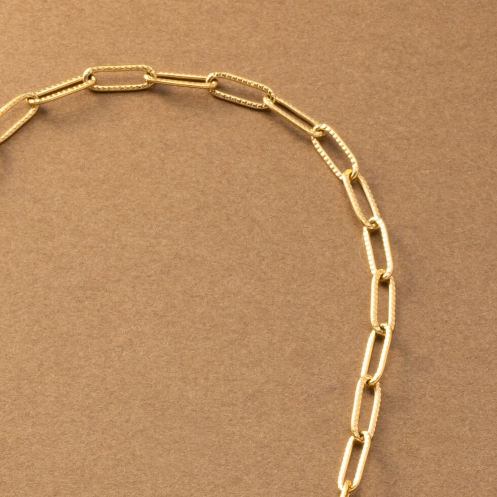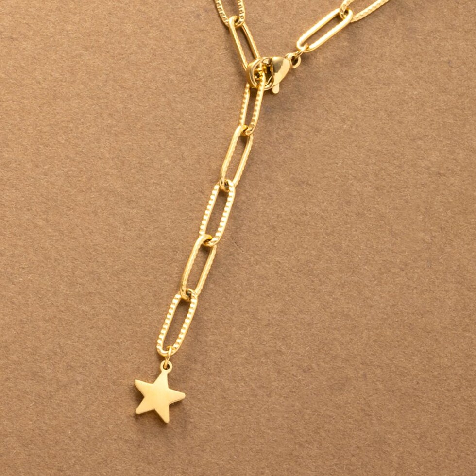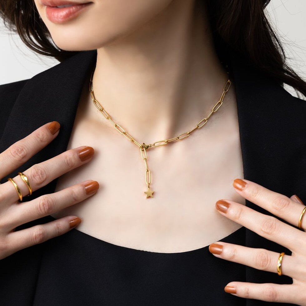 凹凸加工を施したオーバルチェーンとスターモチーフを組み合わせたY字ネックレス。さりげない星モチーフが、コーデにエッジの効いたアクセントとこなれた印象をプラス。モチーフを後ろ側にしてもお使いいただけるアレンジ自在なデザインも魅力◎肌馴染みもよく錆びにくいステンレス製だからデイリー使いにぴったりの一品です。