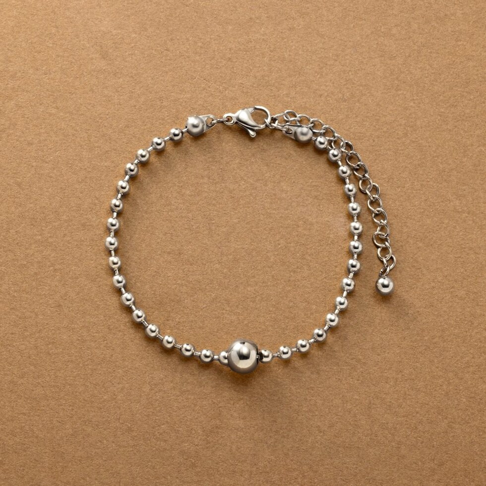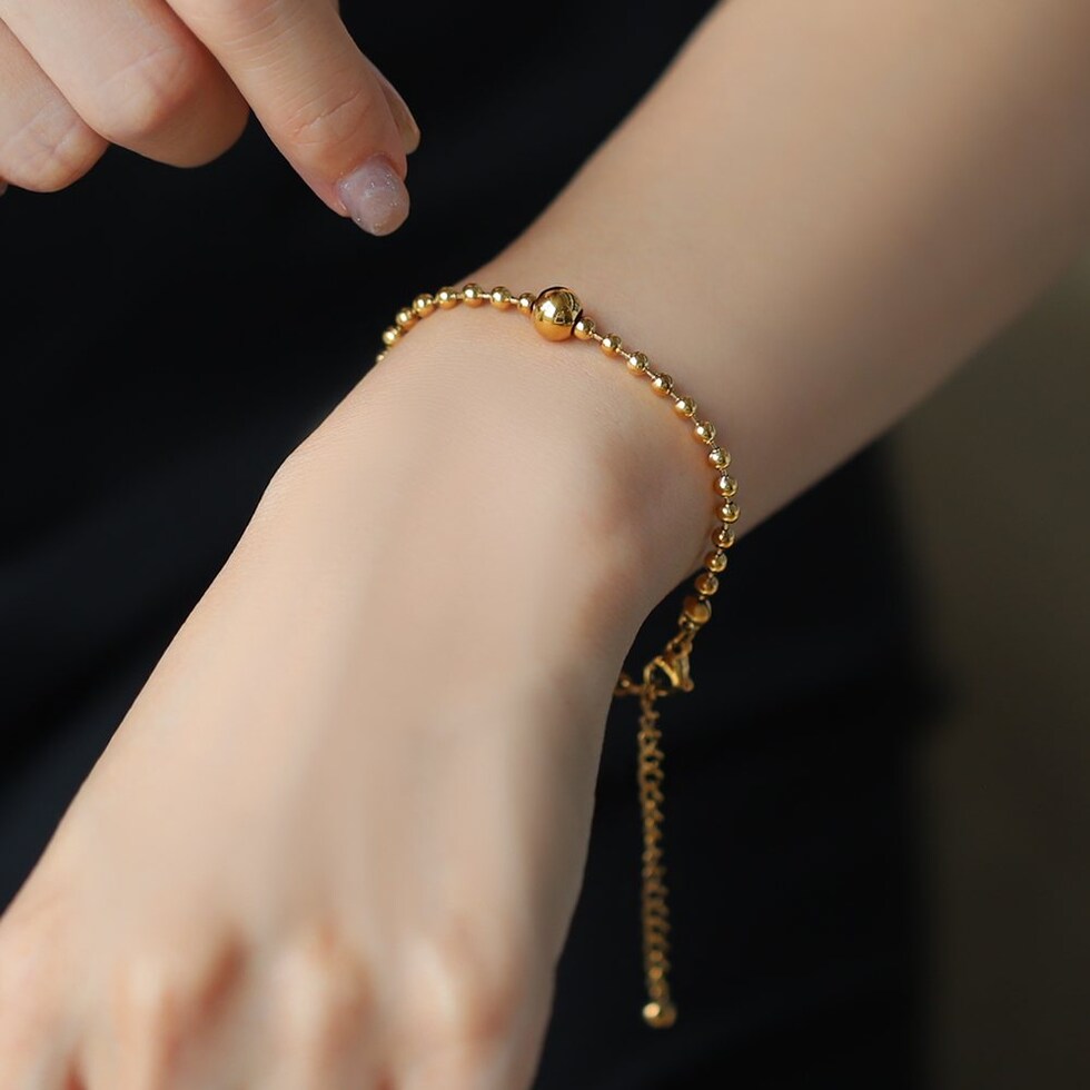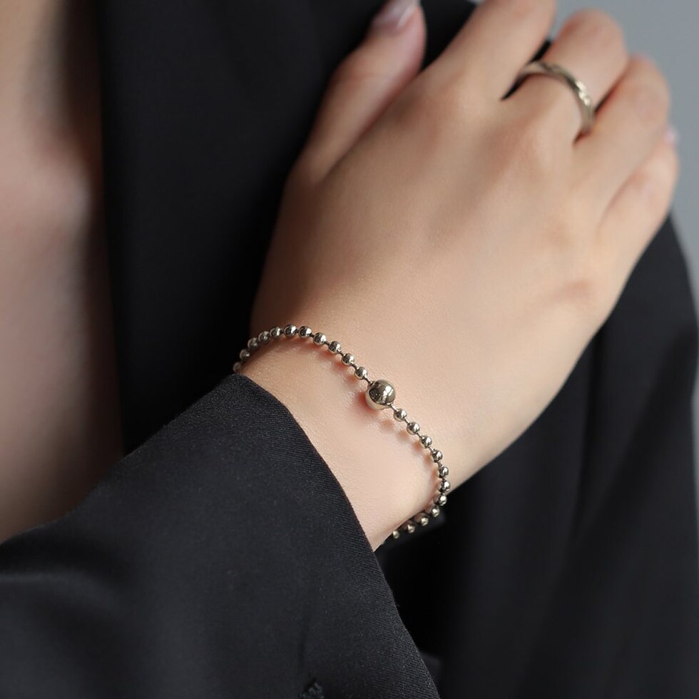 スマートな印象に仕上がるボールチェーンのブレスレット。中央のメタルボールはチェーンと固定されていないので、手元の動きに合わせて表情が変わるひと品。シンプルなデザインでデイリー使いにピッタリなアイテムです。