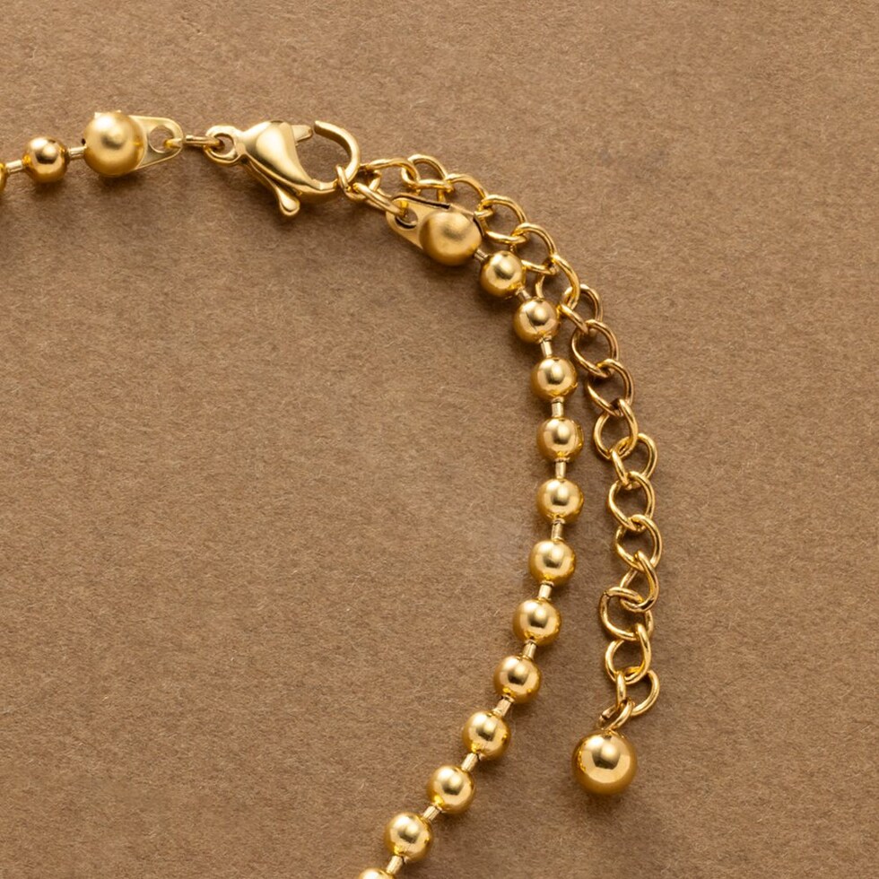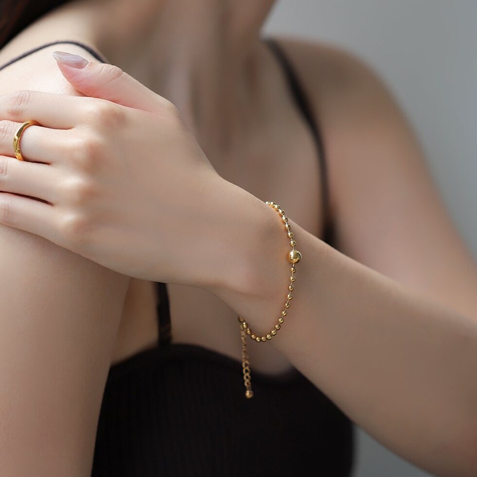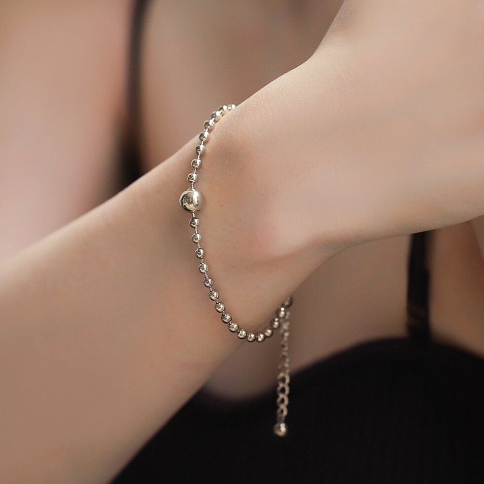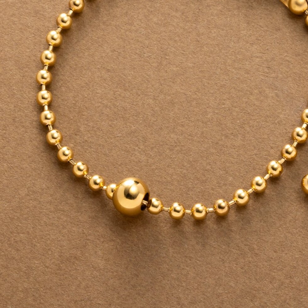 スマートな印象に仕上がるボールチェーンのブレスレット。中央のメタルボールはチェーンと固定されていないので、手元の動きに合わせて表情が変わるひと品。シンプルなデザインでデイリー使いにピッタリなアイテムです。
