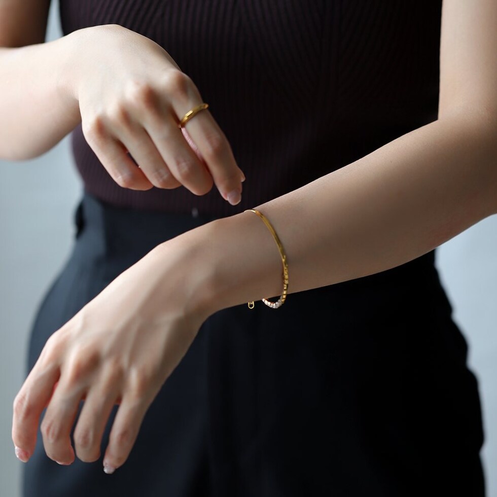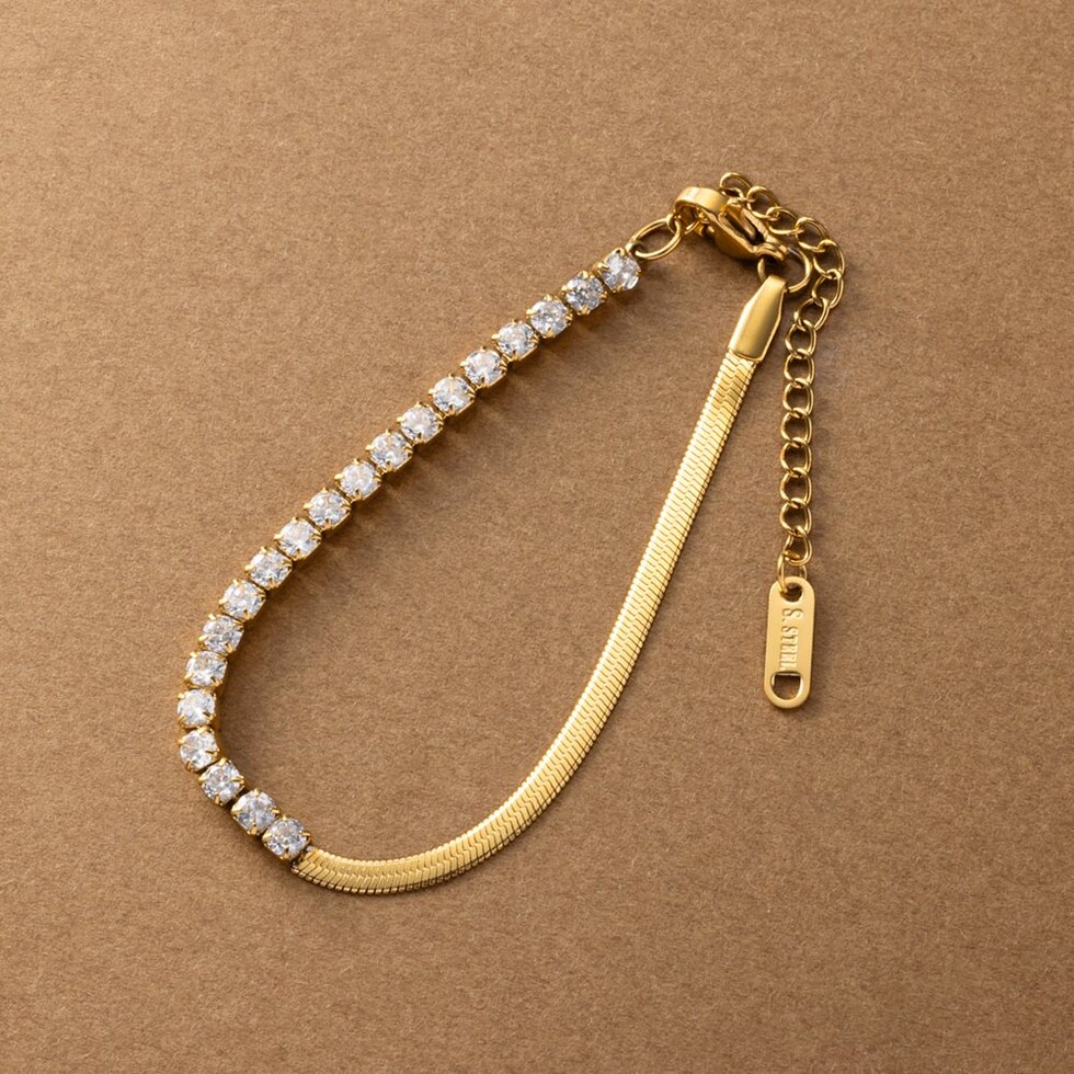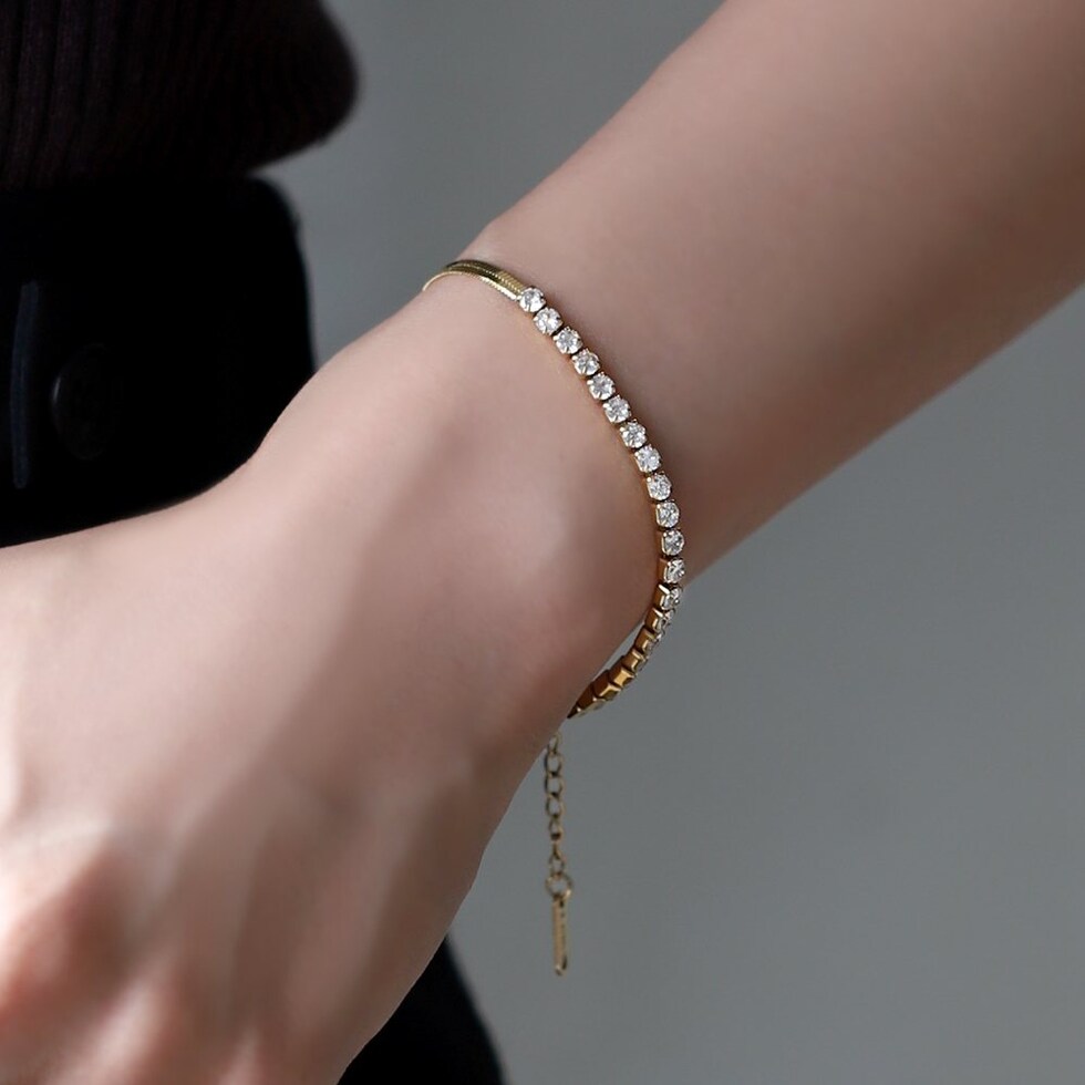 ラインビジューとスネークチェーンが手首に沿って煌くブレスレット。リッチな輝きが、着けるだけで手元に上品さをプラスします。錆びにくく傷に強いステンレス製でデイリーに活躍しそう◎