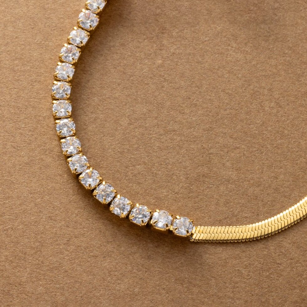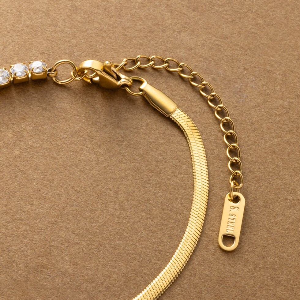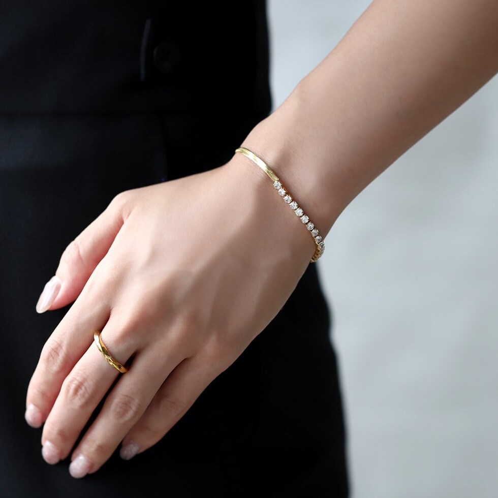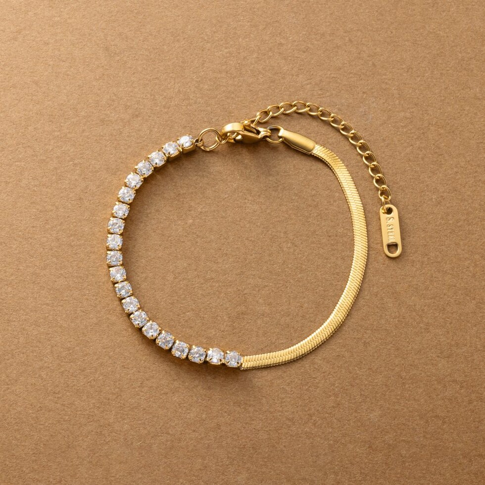 ラインビジューとスネークチェーンが手首に沿って煌くブレスレット。リッチな輝きが、着けるだけで手元に上品さをプラスします。錆びにくく傷に強いステンレス製でデイリーに活躍しそう◎