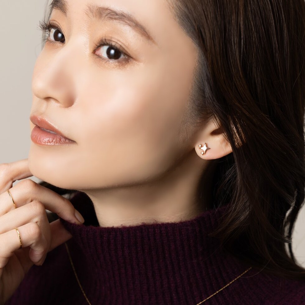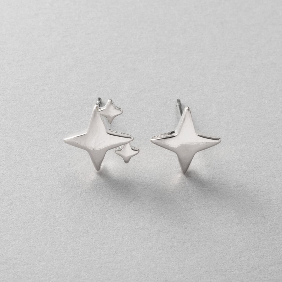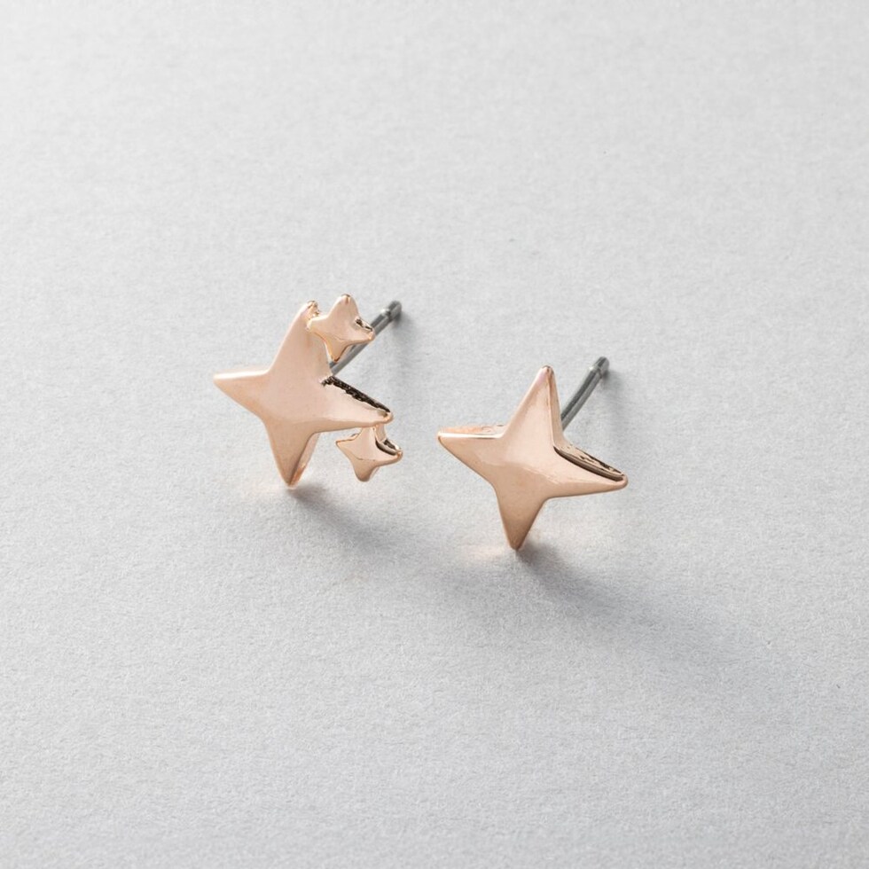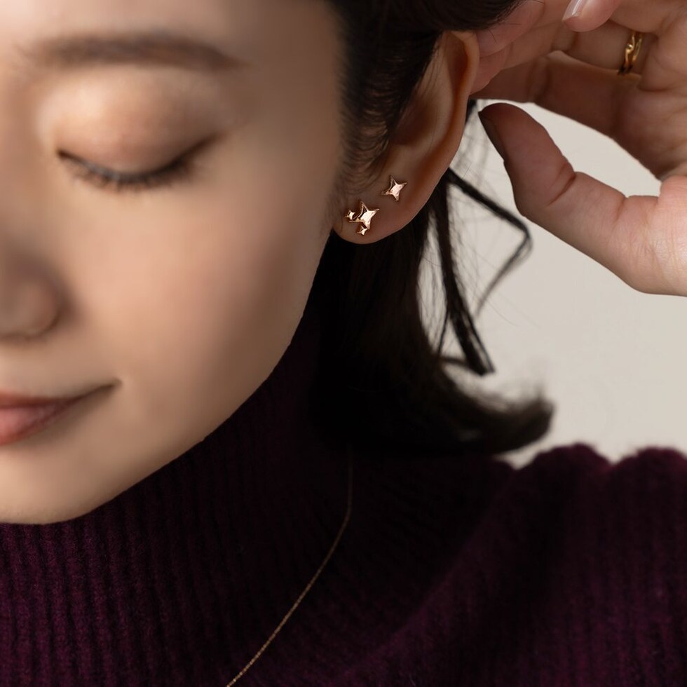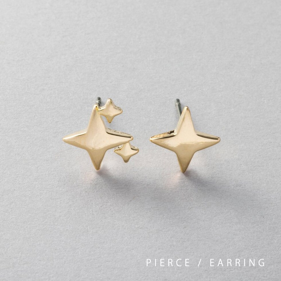 ひとつの星と3つの星をかたどったアシンメトリーなスタッドピアス/イヤリング。左右の印象の違いを楽しめるデザインです。低アレルギーのニッケルフリー素材を使用しているので、長時間の着用も安心♪