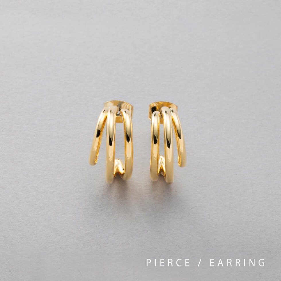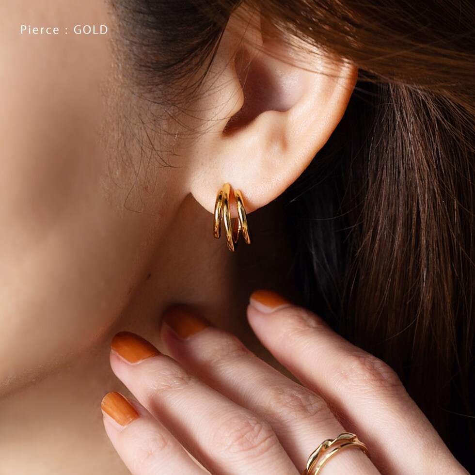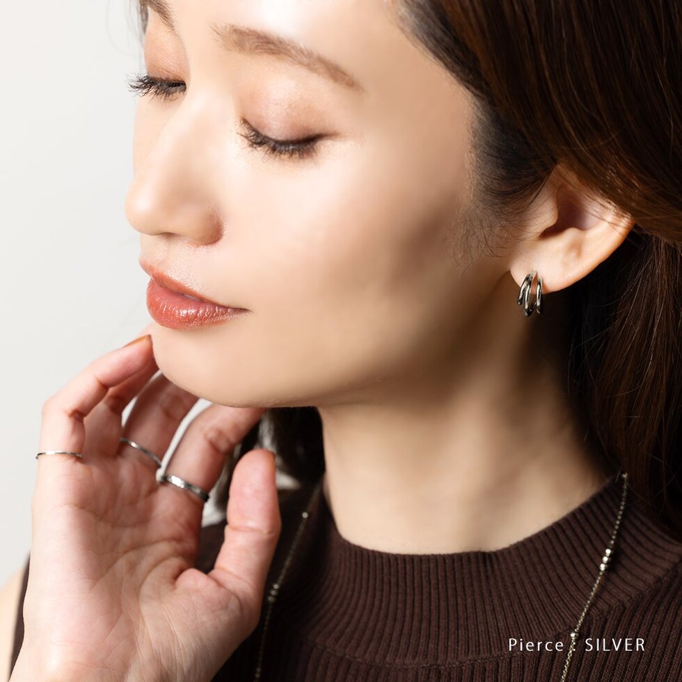 3つのフープラインが連なるレイヤード風ピアス/イヤリング。シンプルなフープを重ね着けしたようなフォルムがさりげなく存在感あるモダンデザインで大人顔をメイク。大人コーデにひとつ加えて格上げして◎