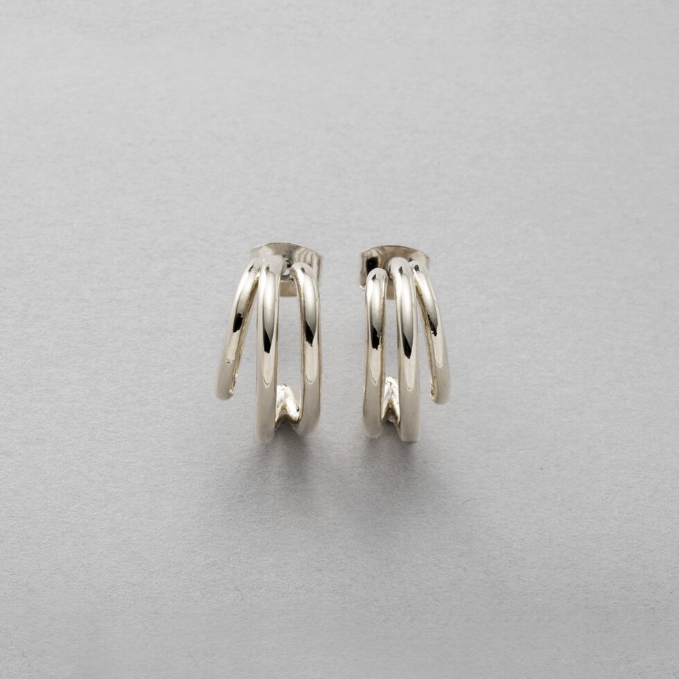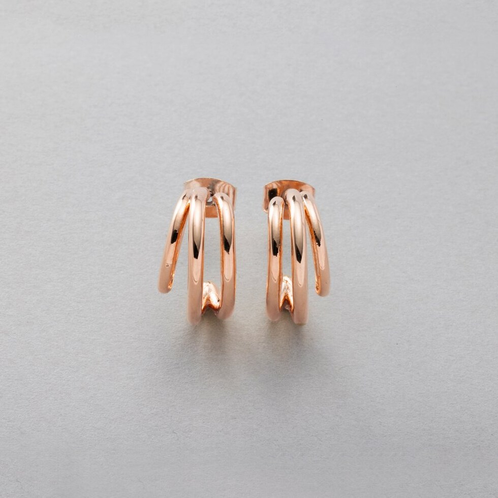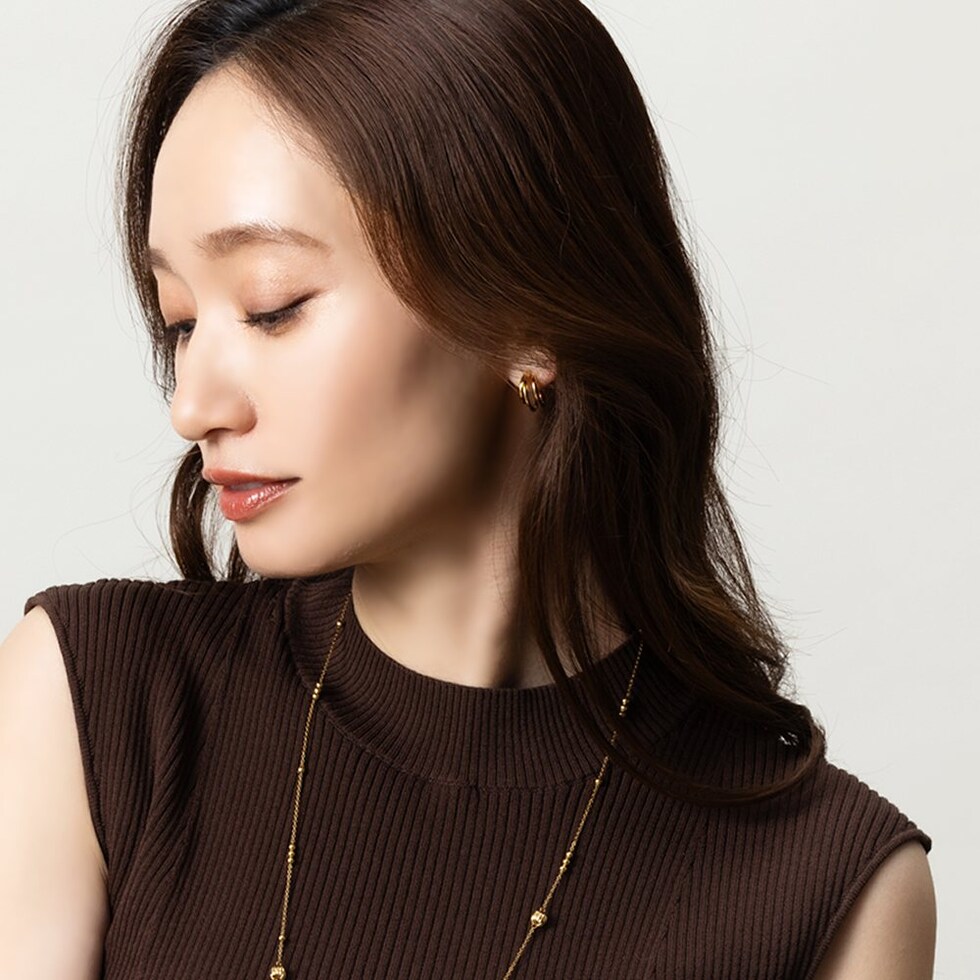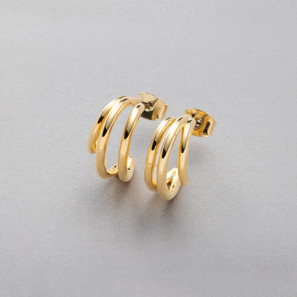 3つのフープラインが連なるレイヤード風ピアス/イヤリング。シンプルなフープを重ね着けしたようなフォルムがさりげなく存在感あるモダンデザインで大人顔をメイク。大人コーデにひとつ加えて格上げして◎
