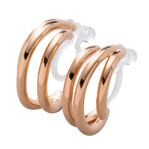 3つのフープラインが連なるレイヤード風ピアス/イヤリング。シンプルなフープを重ね着けしたようなフォルムがさりげなく存在感あるモダンデザインで大人顔をメイク。大人コーデにひとつ加えて格上げして◎