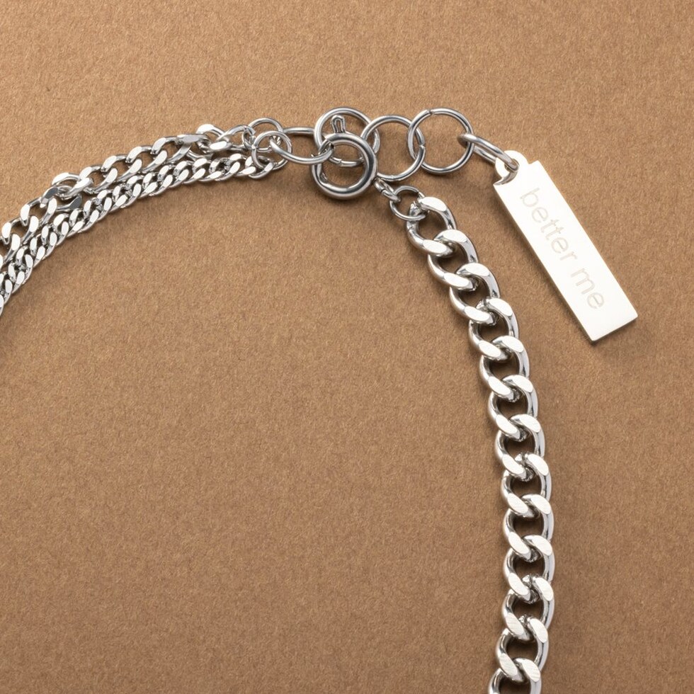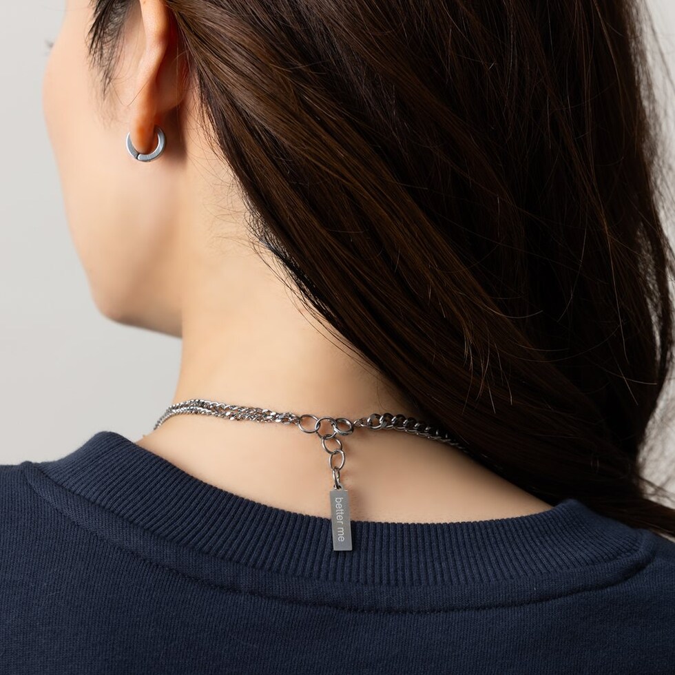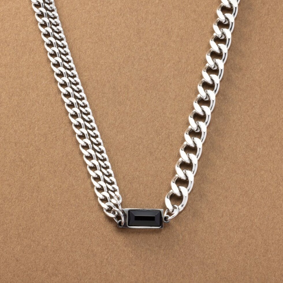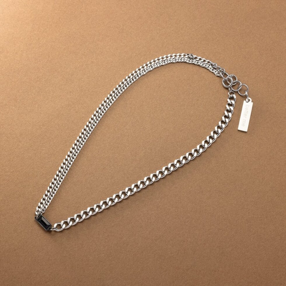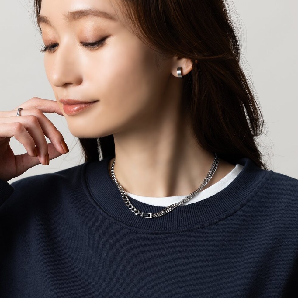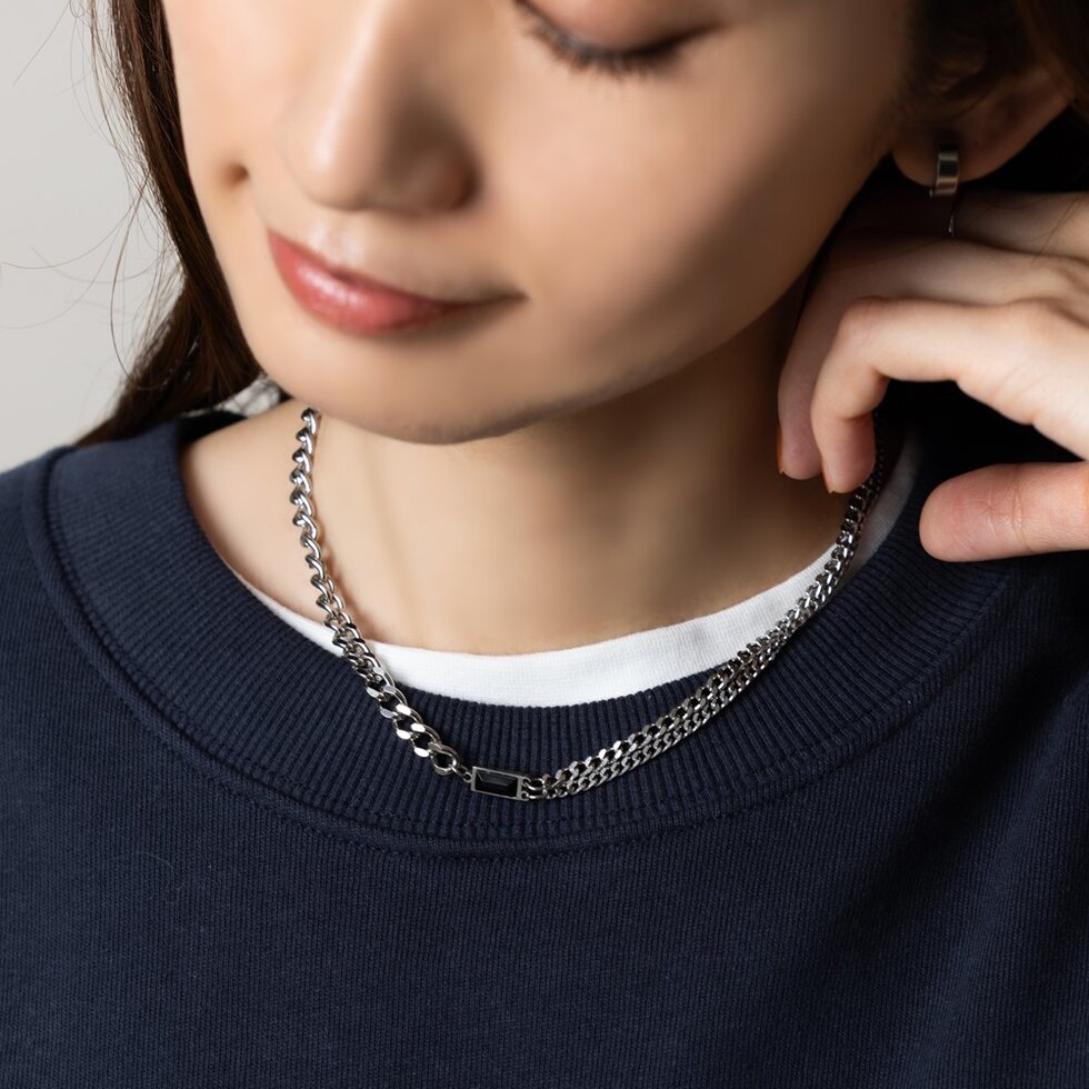 スクエアストーンと太さの異なる喜平チェーンを組み合わせたネックレス。大人な雰囲気を演出するデザインと合わせやすい丈感で、普段のコーデをグッと格上げしてくれるひと品。バックパーツにはメッセージプレート付きで後ろ姿も◎肌馴染みもよく錆びにくいステンレス製だからデイリー使いにぴったりの一品です。