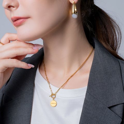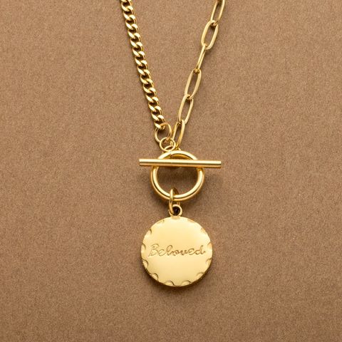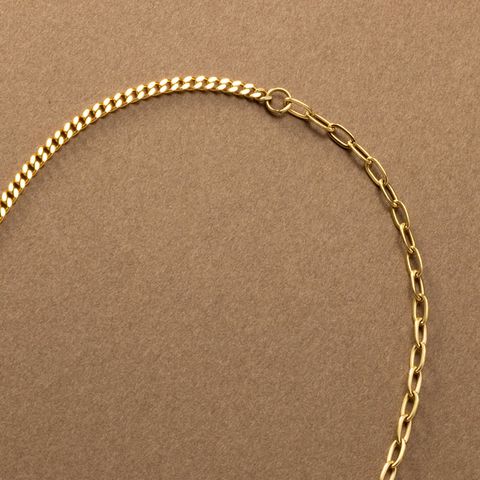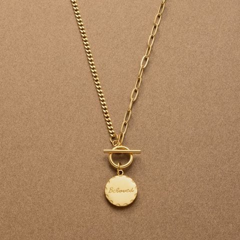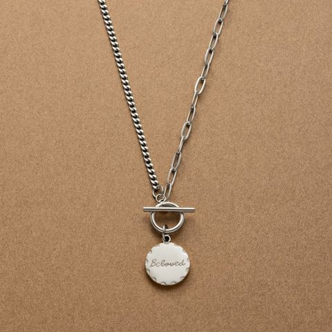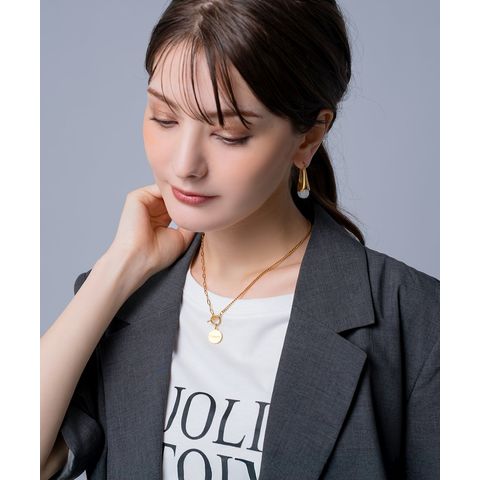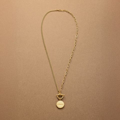 手書き風メッセージロゴが入ったコインネックレス。オーバルチェーンと喜平チェーンをMIXしたデザインとマンテルが程よい存在感をプラスし、洗練された印象に仕上げてくれます。錆びにくいステンレス製なので、デイリー使いにぴったりの一品です。