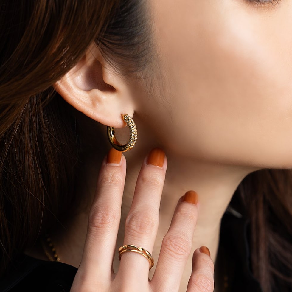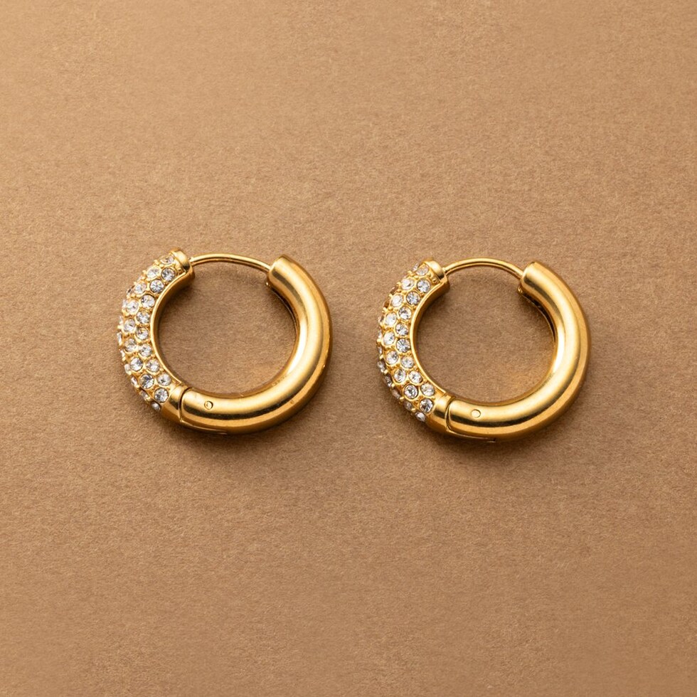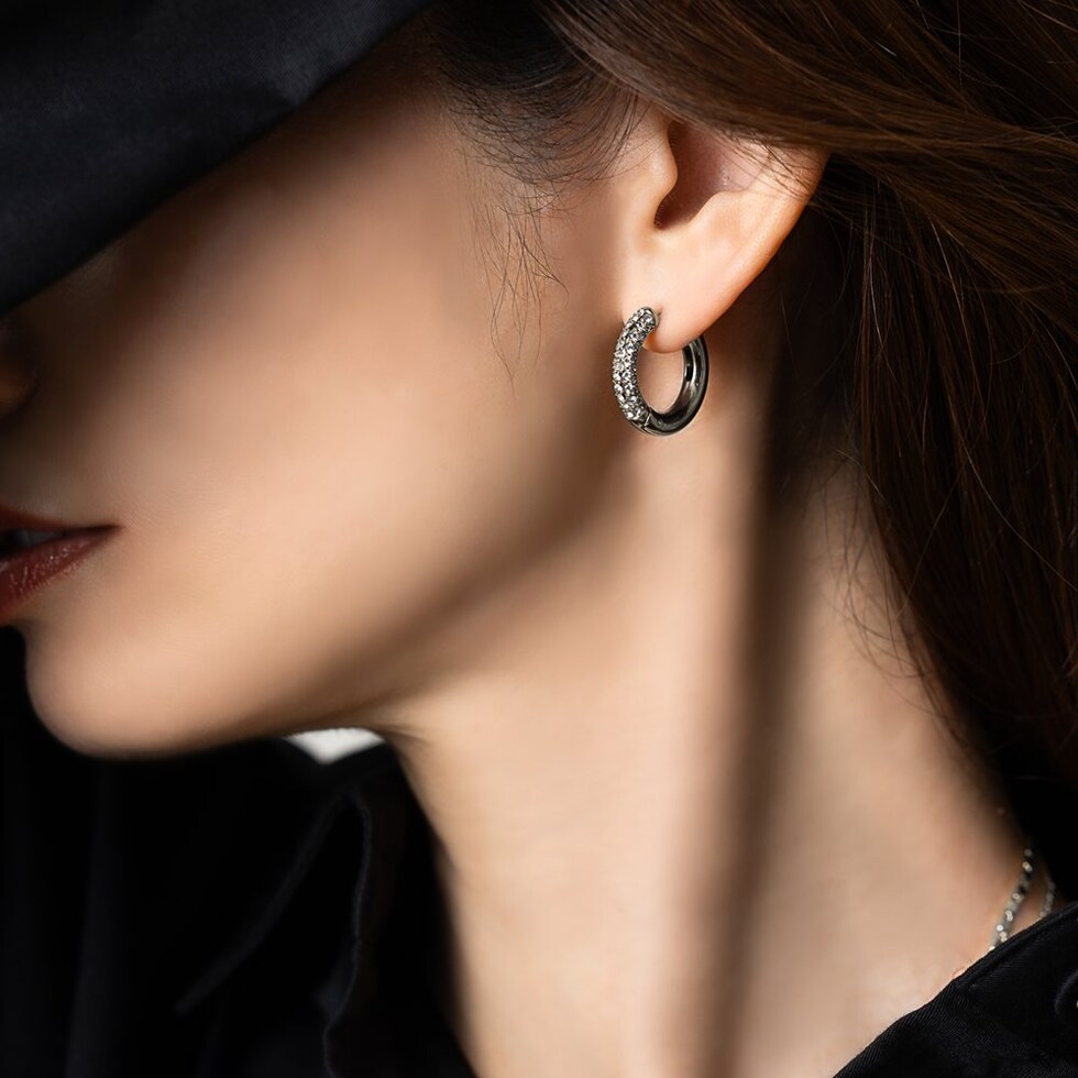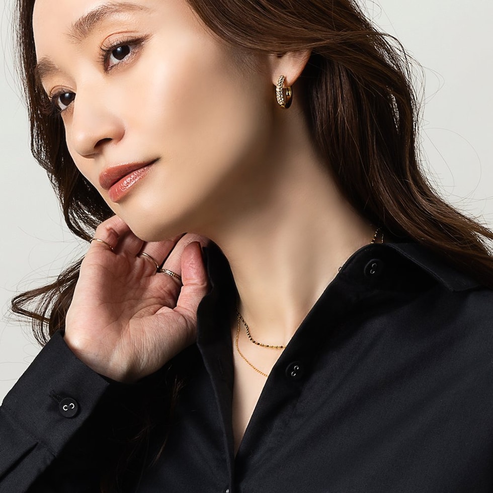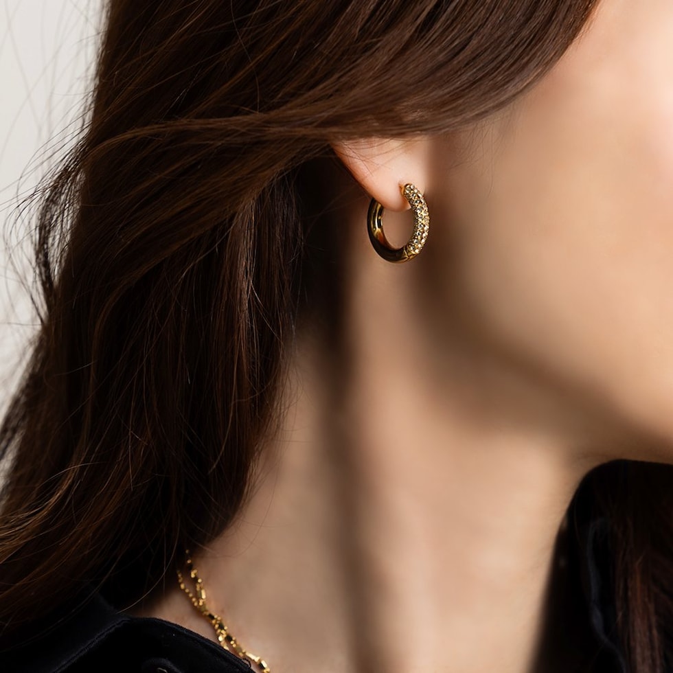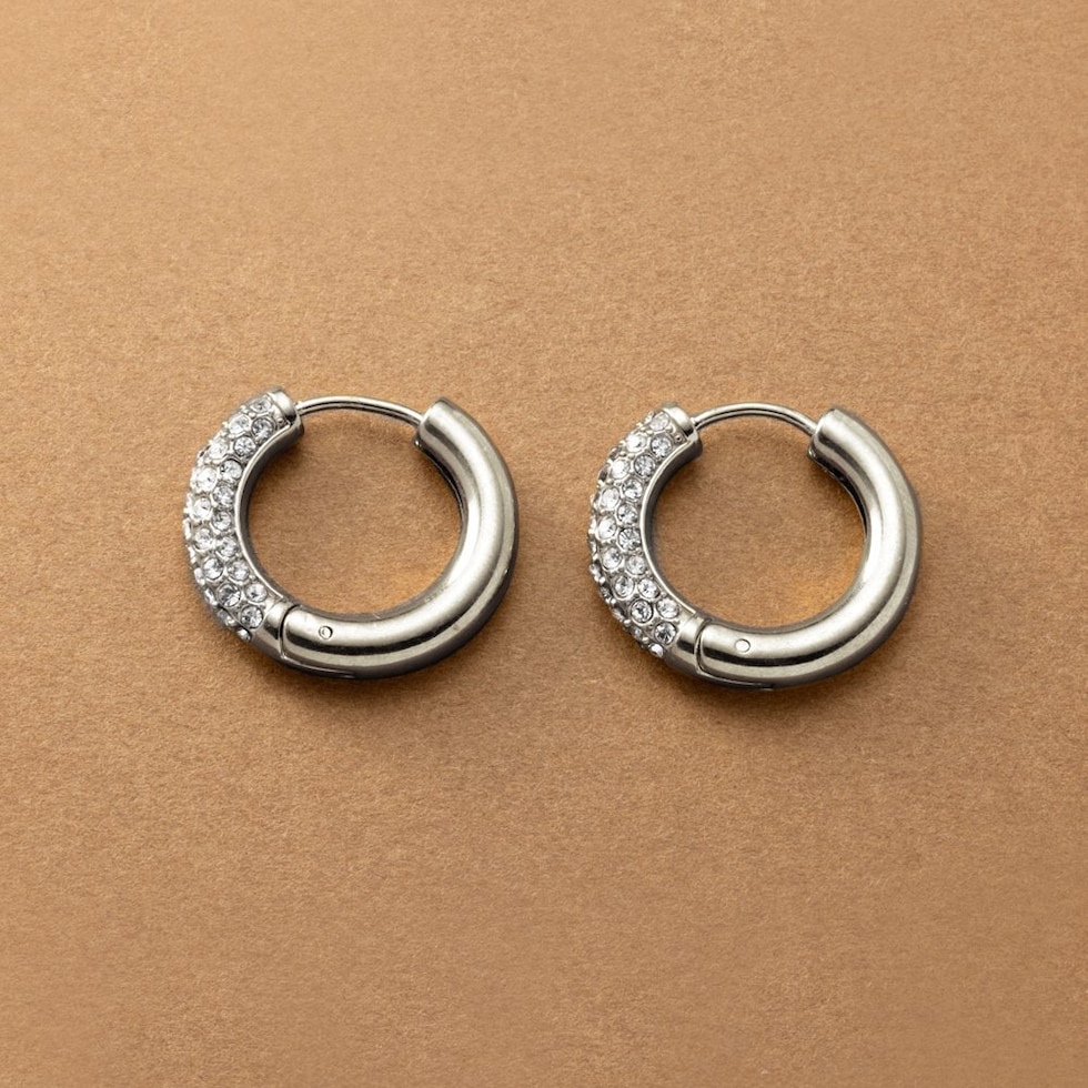 ラグジュアリーな輝きを放つパヴェ×メタルのキャッチレスピアス。存在感あるワイドなフープにビジューをふんだんに使用したデザインが高級感漂う逸品。錆びにくいステンレス製でデイリーに活躍しそう。お呼ばれシーンにも◎