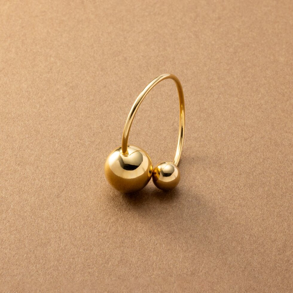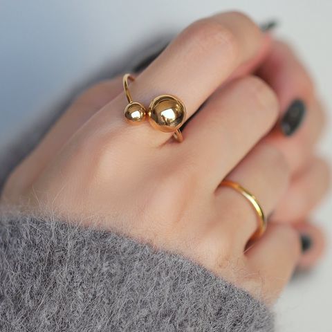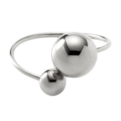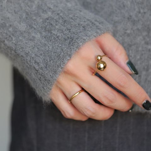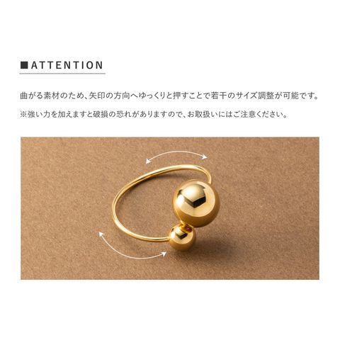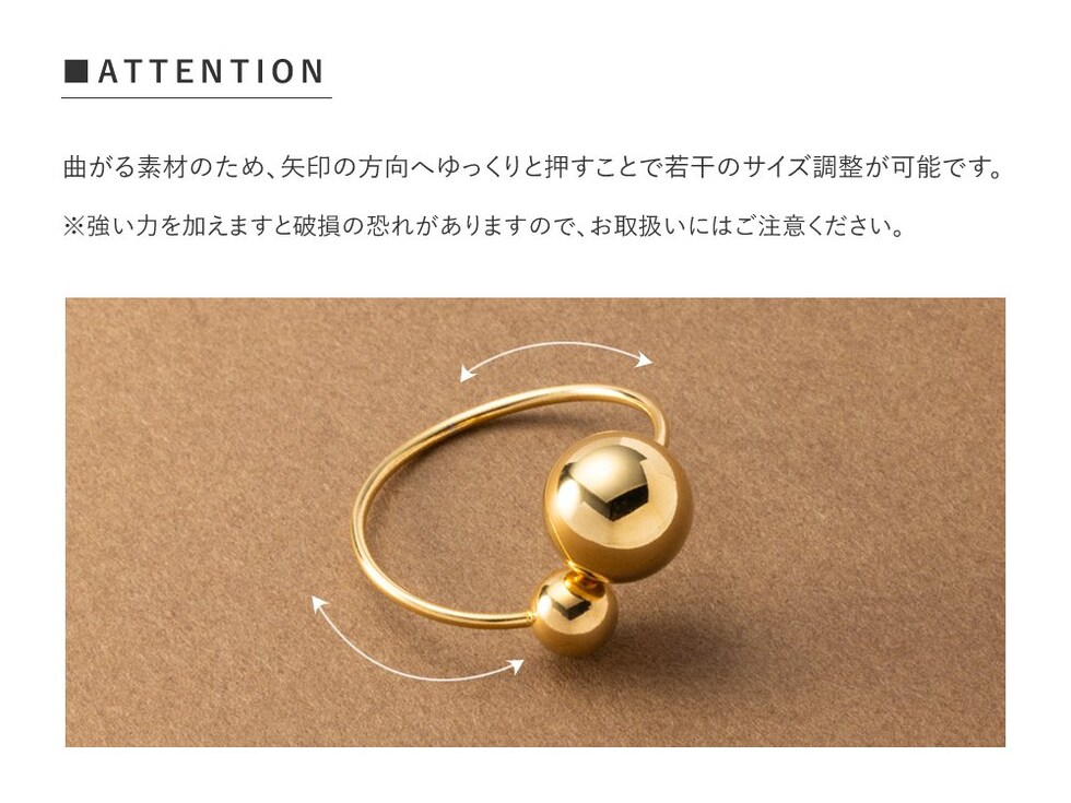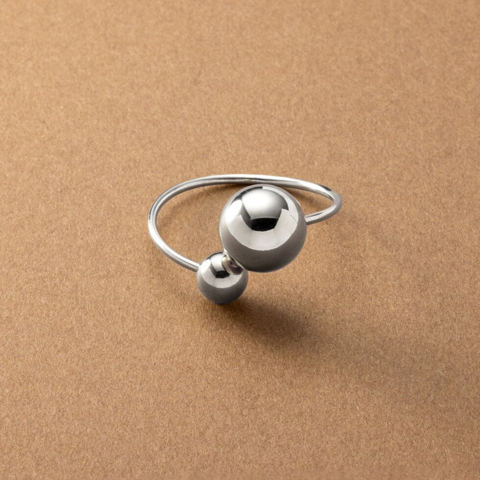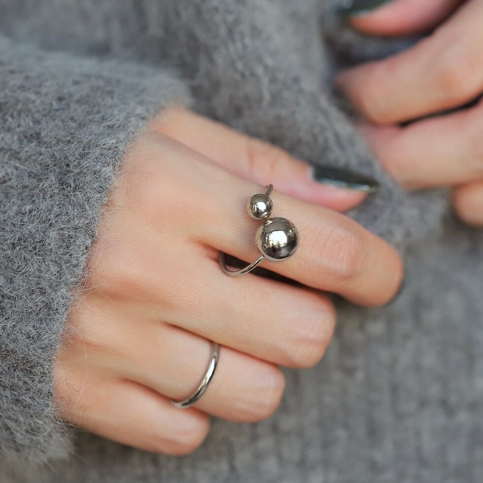 大きさの異なるメタルスフィアが艶めくリング。サイズ調整可能なフリーサイズで、お好みの指に着けれるのが魅力的。長時間の着用にも安心なステンレス製で、今っぽさも叶うオススメのひと品です。