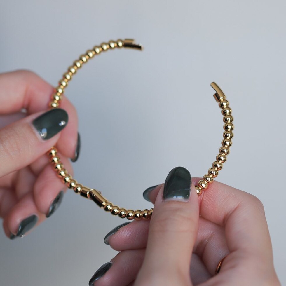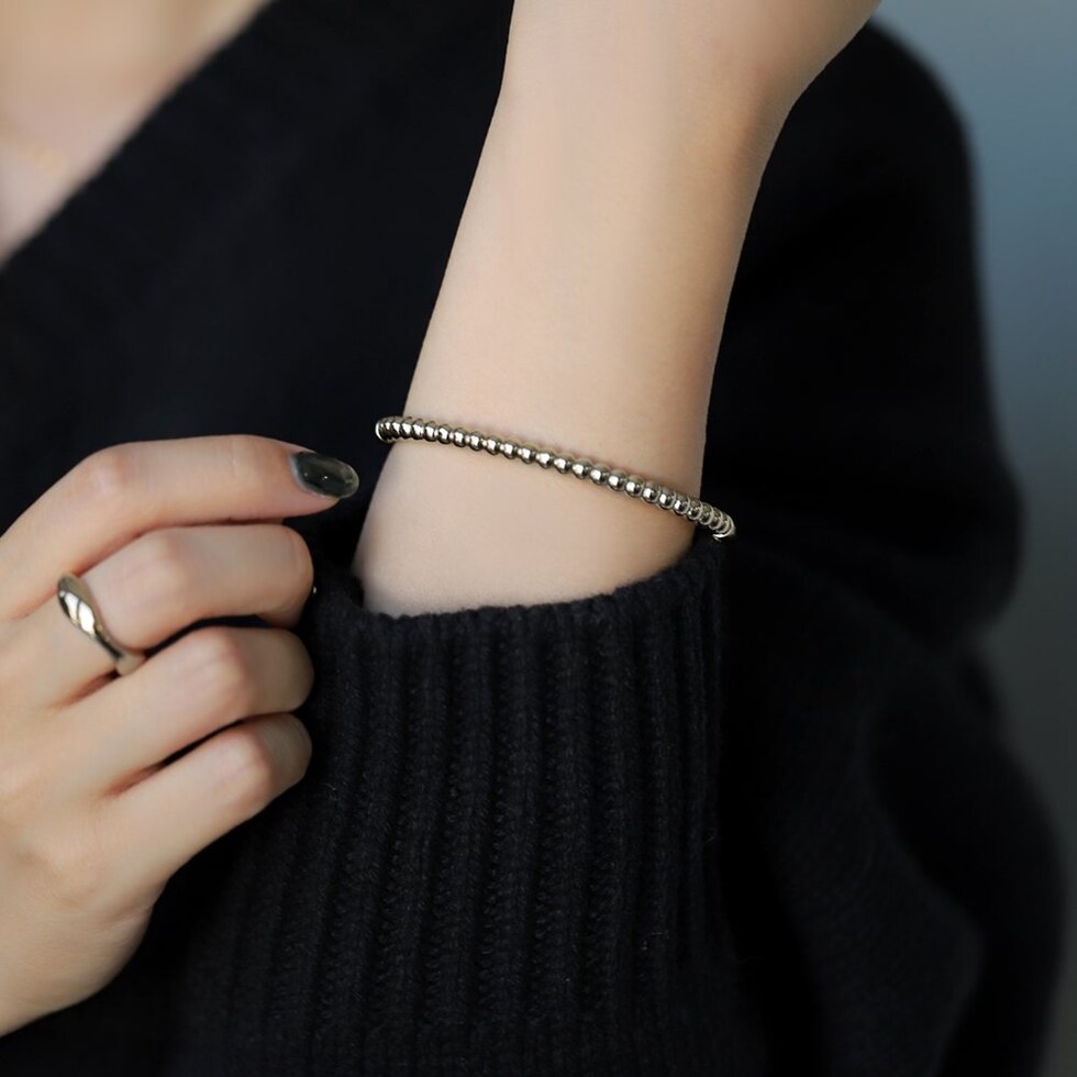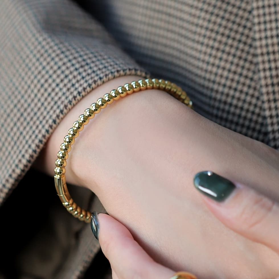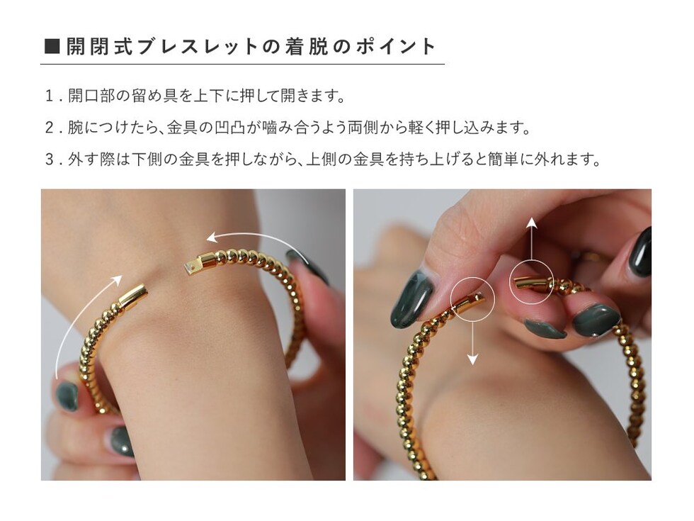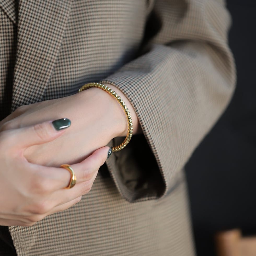 存在感のあるメタルボールを連ねた開閉式ブレスレット。金具を噛み合わせてつけるので、外れる心配もなくスマートなシルエットを楽しめます。手元を印象的に仕上げてくれるひと品です。