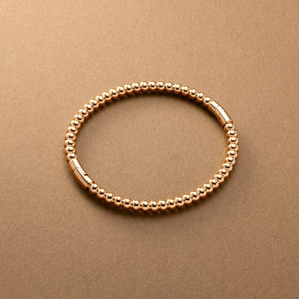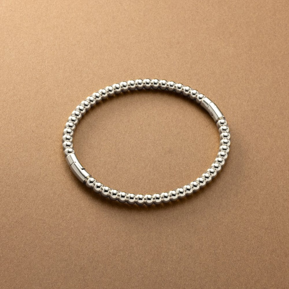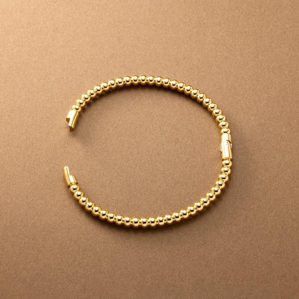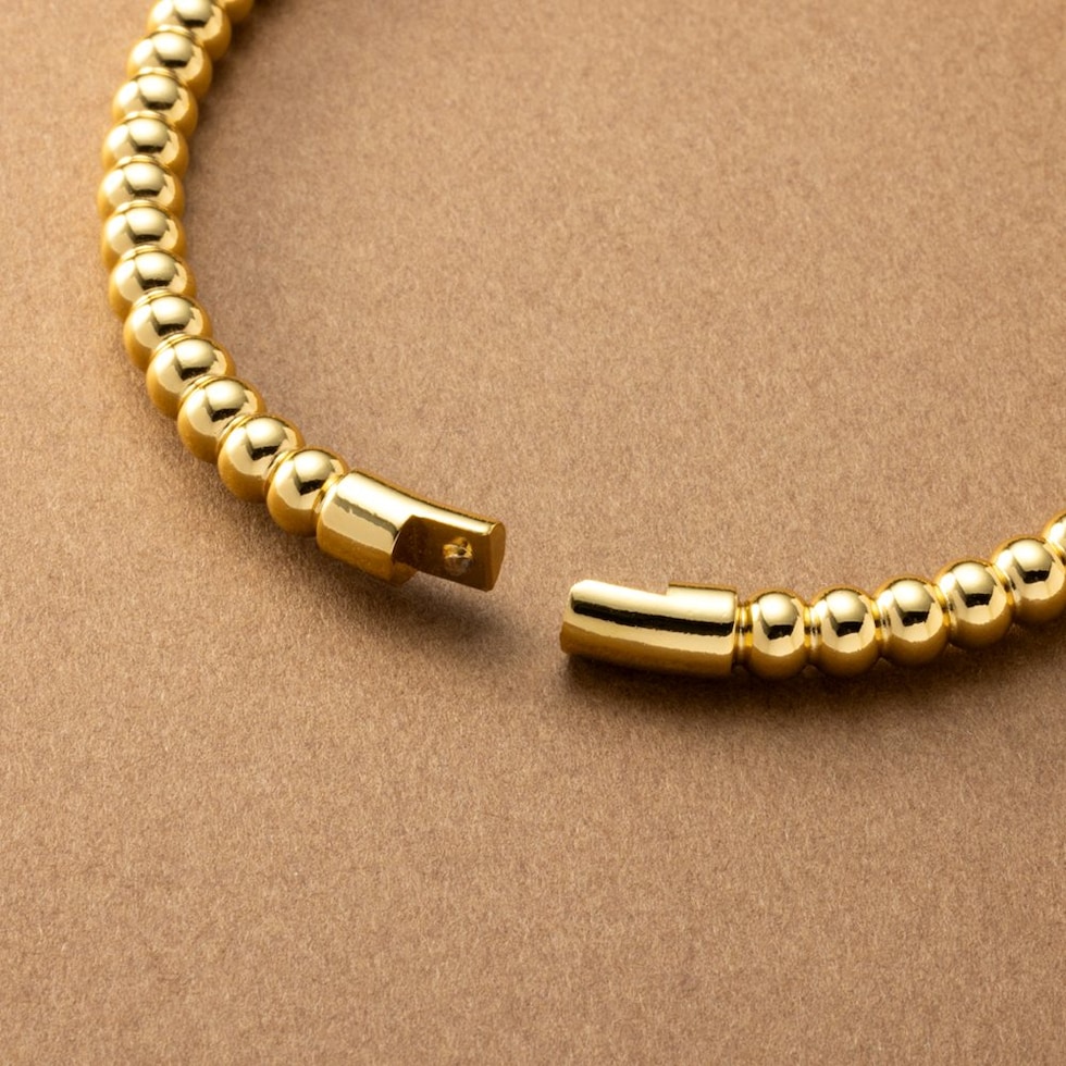 存在感のあるメタルボールを連ねた開閉式ブレスレット。金具を噛み合わせてつけるので、外れる心配もなくスマートなシルエットを楽しめます。手元を印象的に仕上げてくれるひと品です。