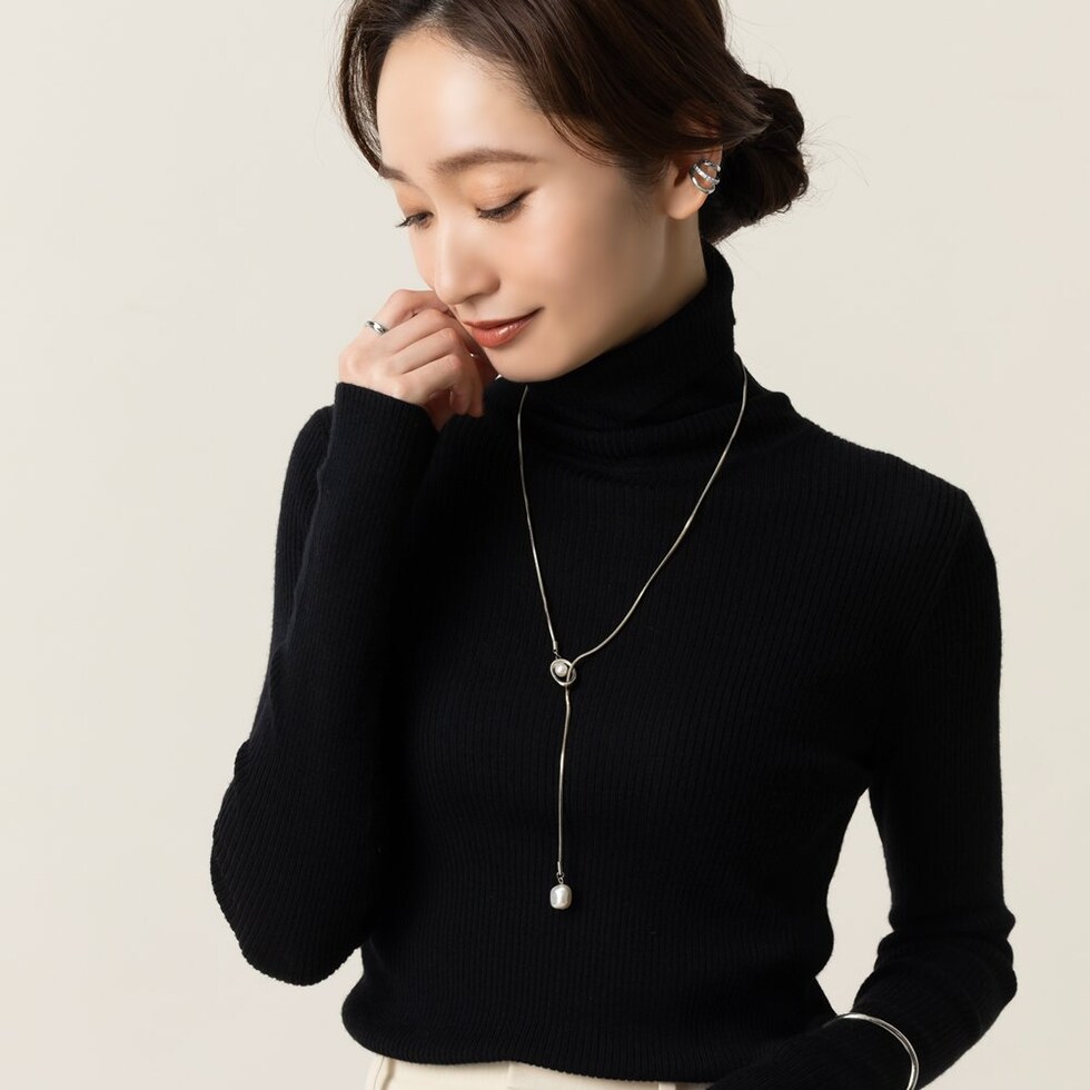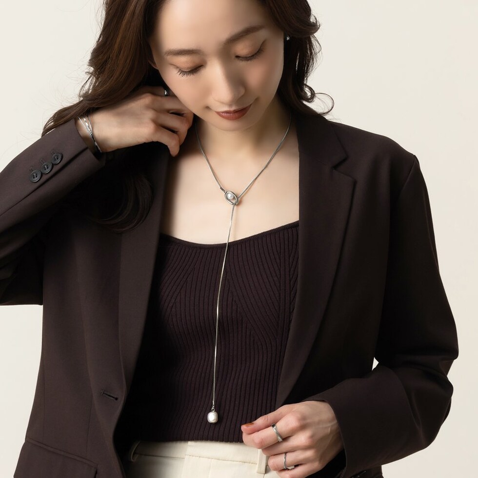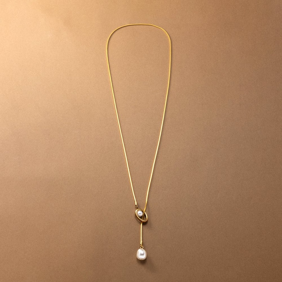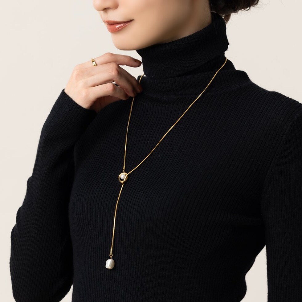 滑らかなスネークチェーンの先でパールが揺らめくY字ロングネックレス。Y字部分のオーバルフレームにもパールをあしらった、他にはないデザインが◎チェーンをスライドさせてバランスや長さを調節できるので、その日のコーデに合わせたスタイリングが楽しめます。肌馴染みもよく錆びにくいステンレス製だからデイリー使いにぴったりの一品です。