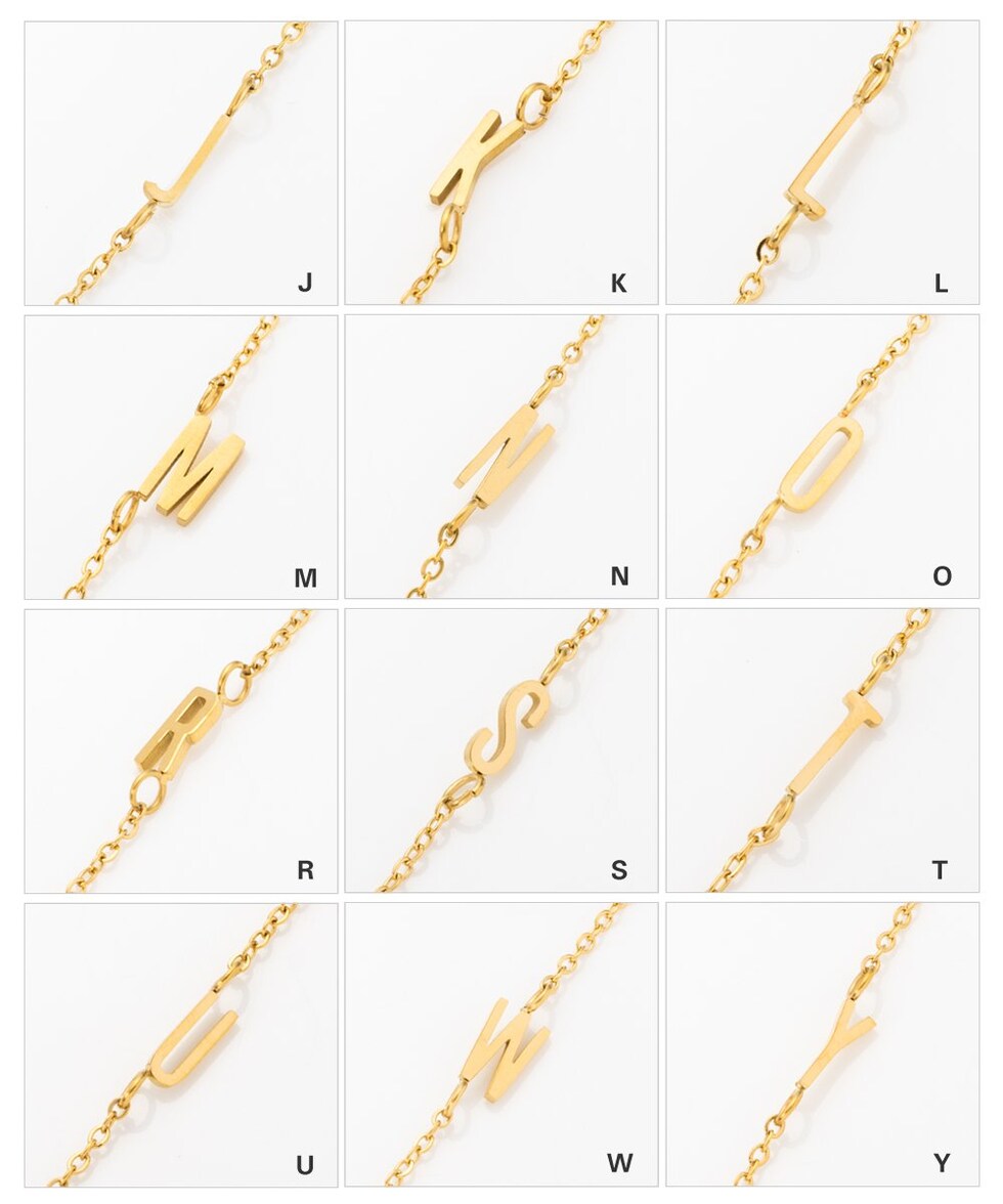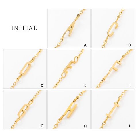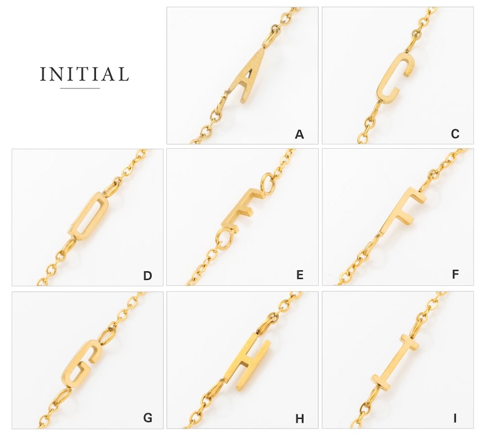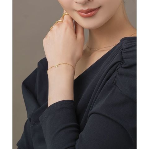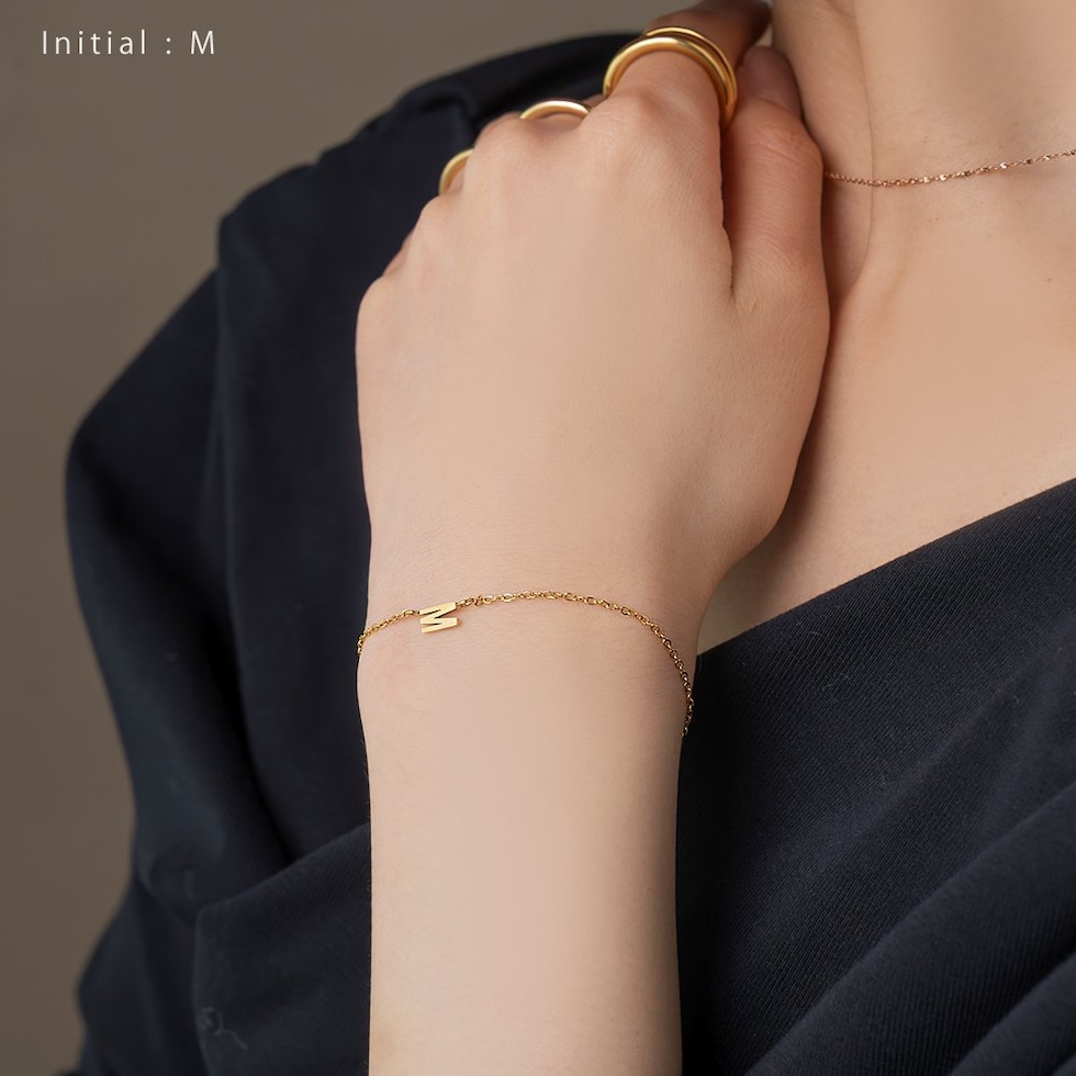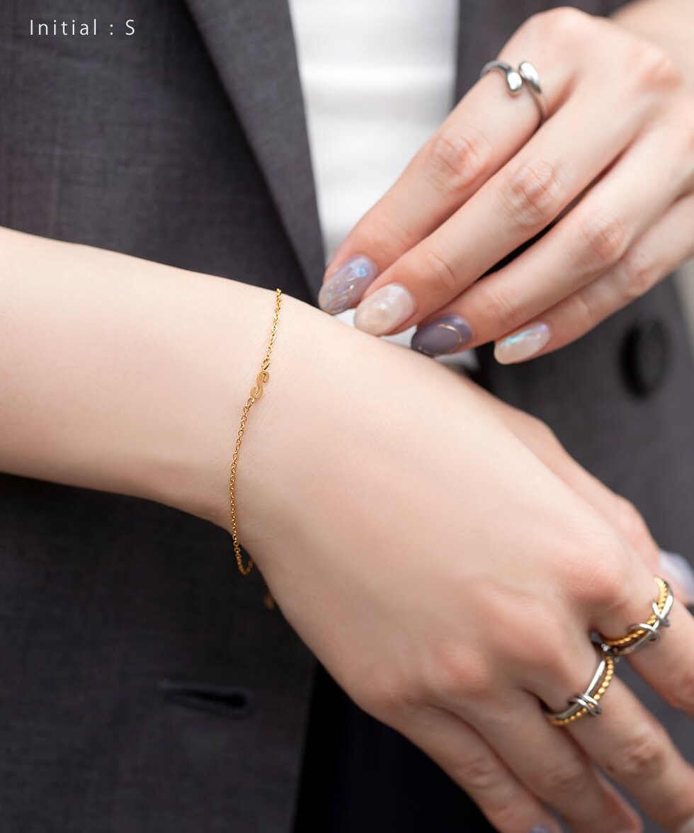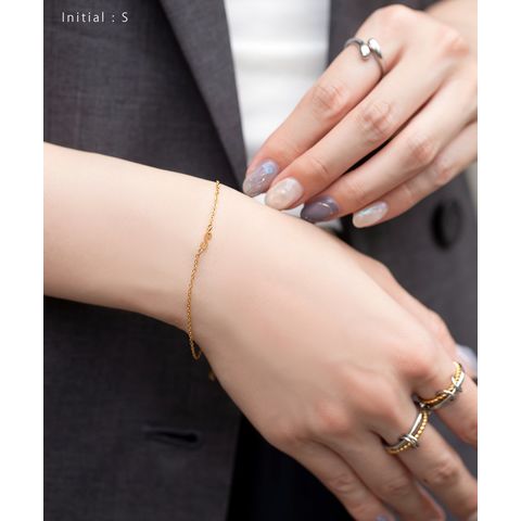 さりげなく控えめなイニシャルのステンレス製ブレスレット。華奢なあずきチェーンとスマートなモチーフで大人の手元に馴染むひと品。お気に入りが見つかる20typeで重ね着けやプレゼントにもオススメ◎