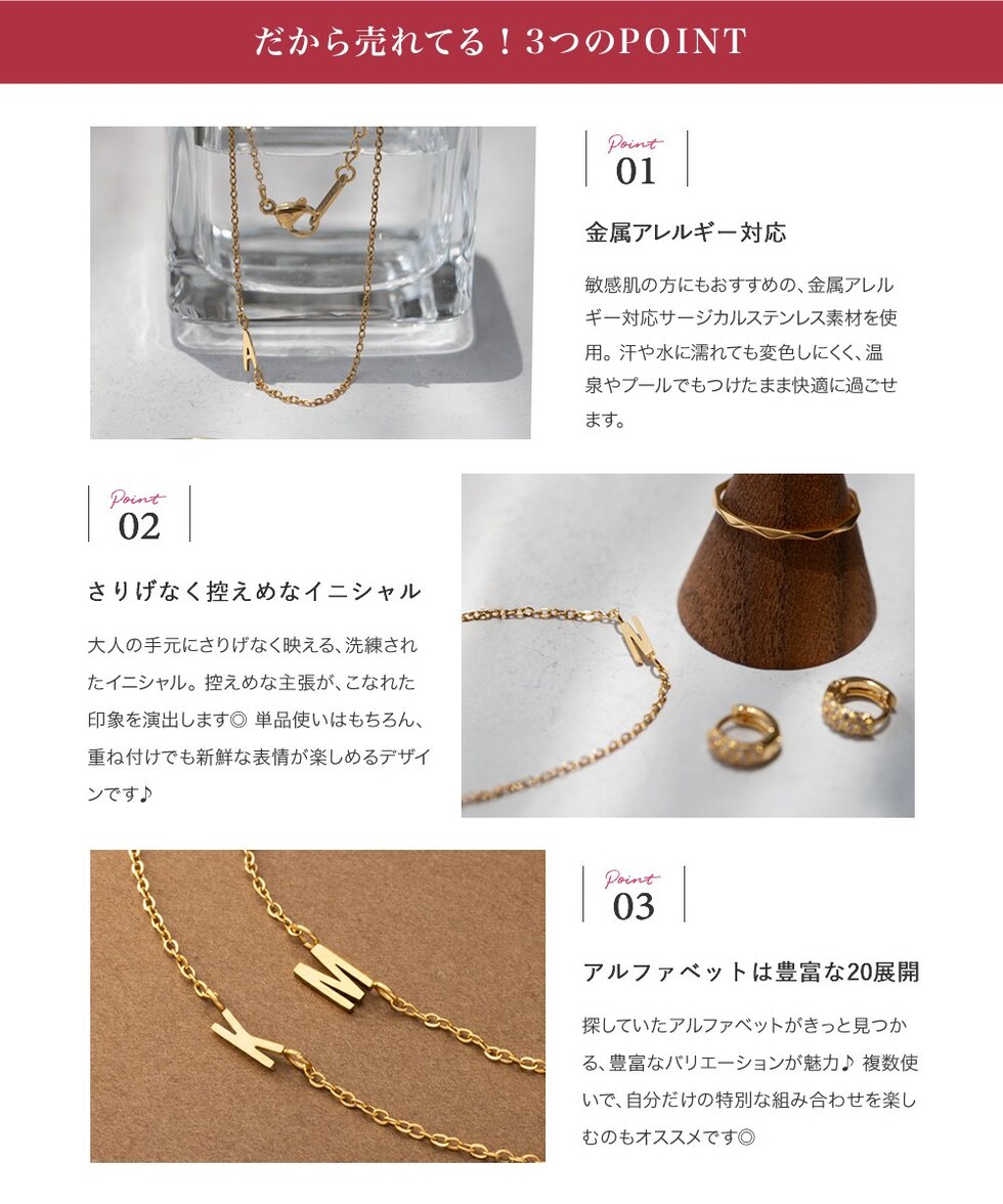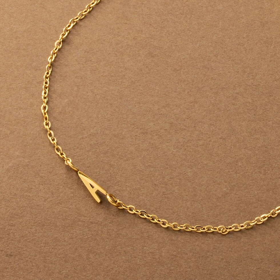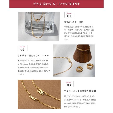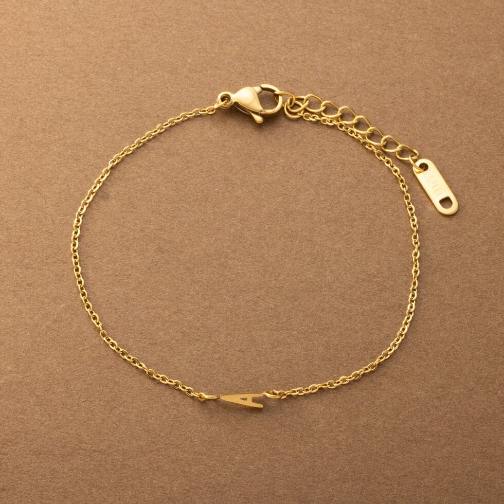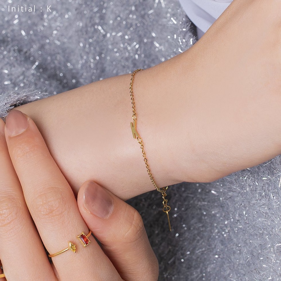 さりげなく控えめなイニシャルのステンレス製ブレスレット。華奢なあずきチェーンとスマートなモチーフで大人の手元に馴染むひと品。お気に入りが見つかる20typeで重ね着けやプレゼントにもオススメ◎