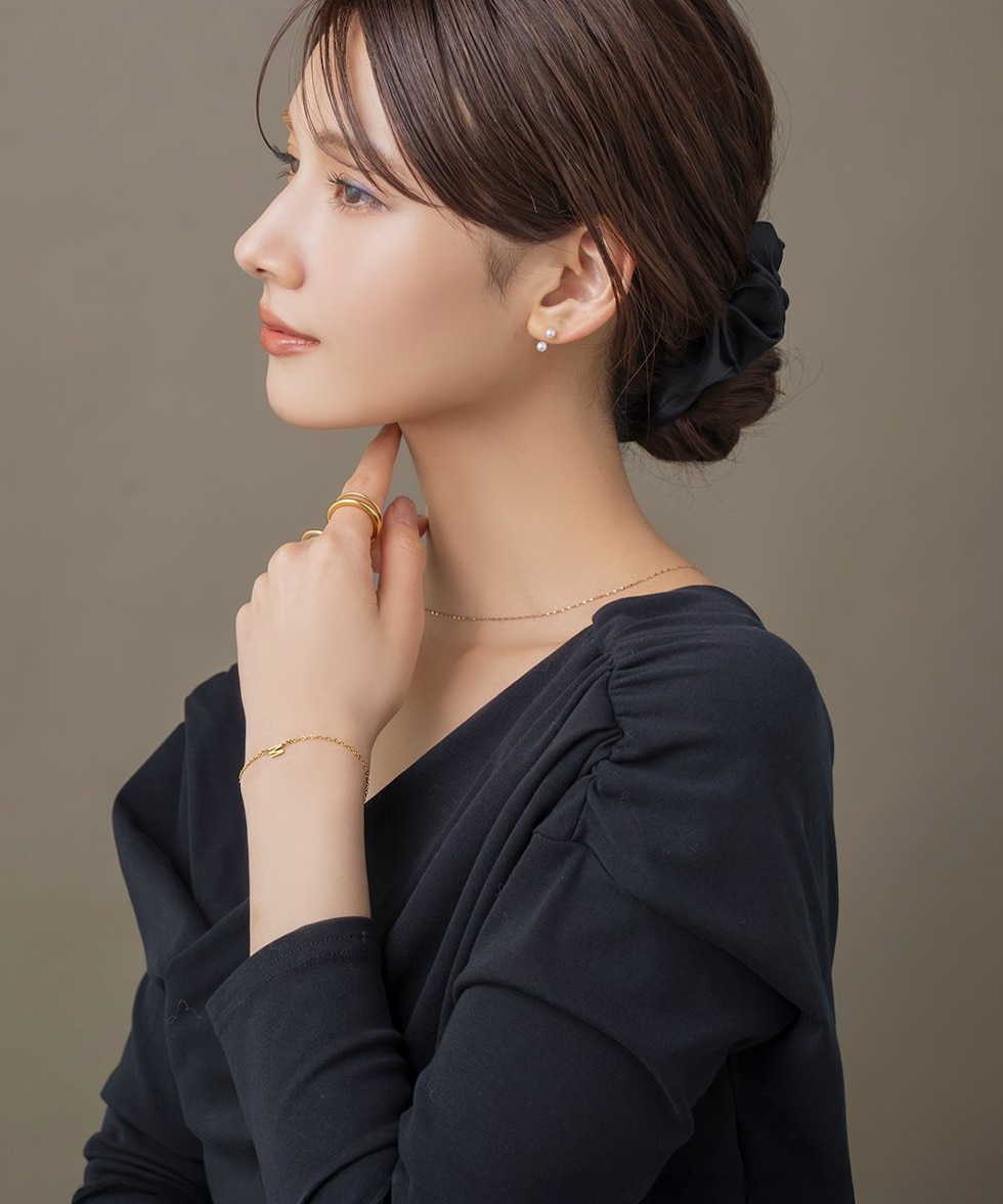 敏感肌の方にもおすすめの、金属アレルギー対応サージカルステンレス素材を使用。汗や水に濡れても変色しにくく、温泉やプールでもつけたまま快適に過ごせます。