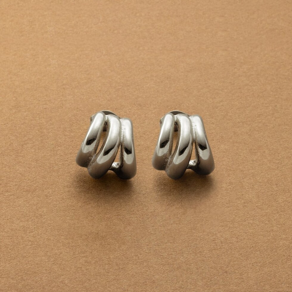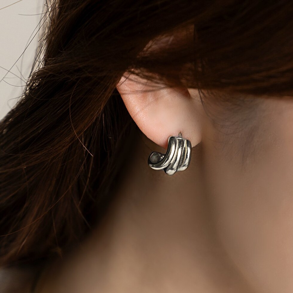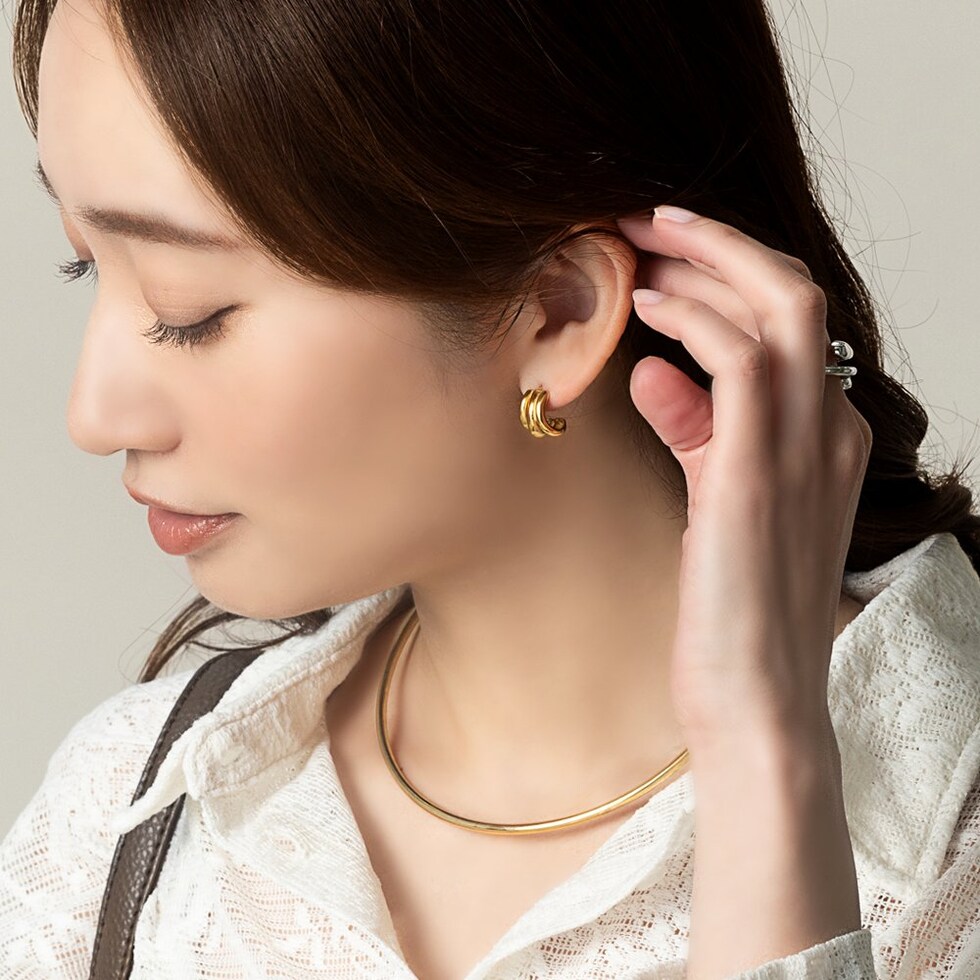 耳に沿うカーブフォルムとトリプルラインのピアス。程よい存在感がモダンで上品なアクセントを添えてくれる一品。錆びにくく傷に強いステンレス製だから、デイリーに活躍してくれそう。