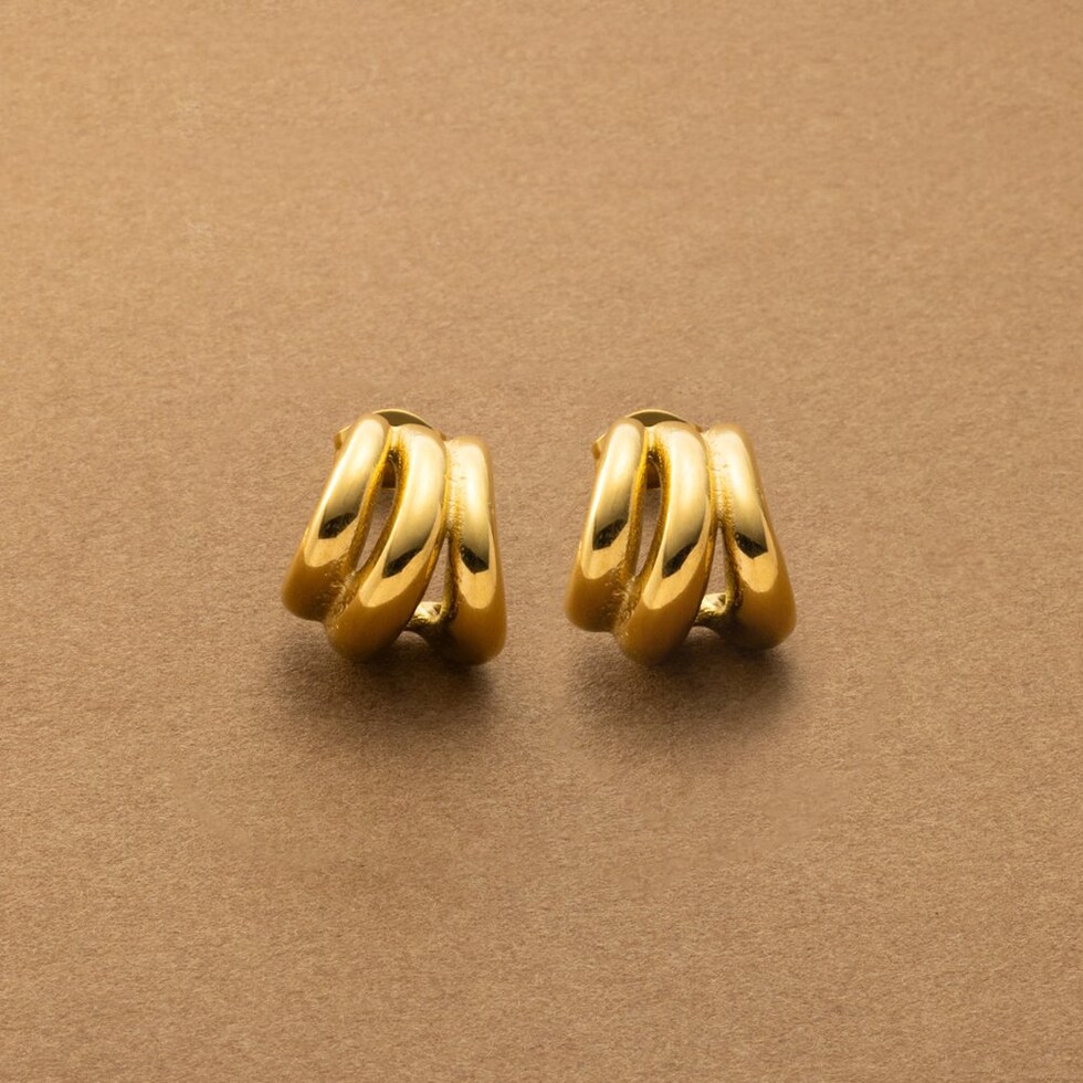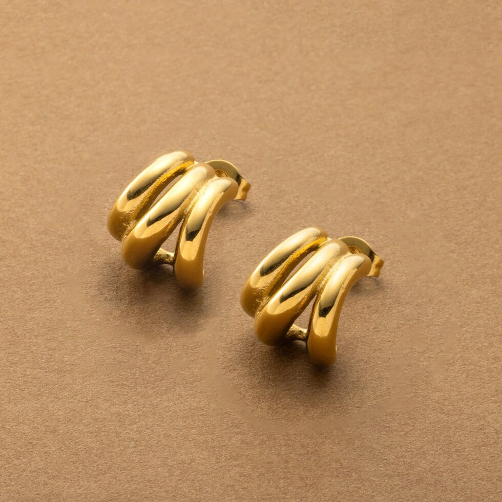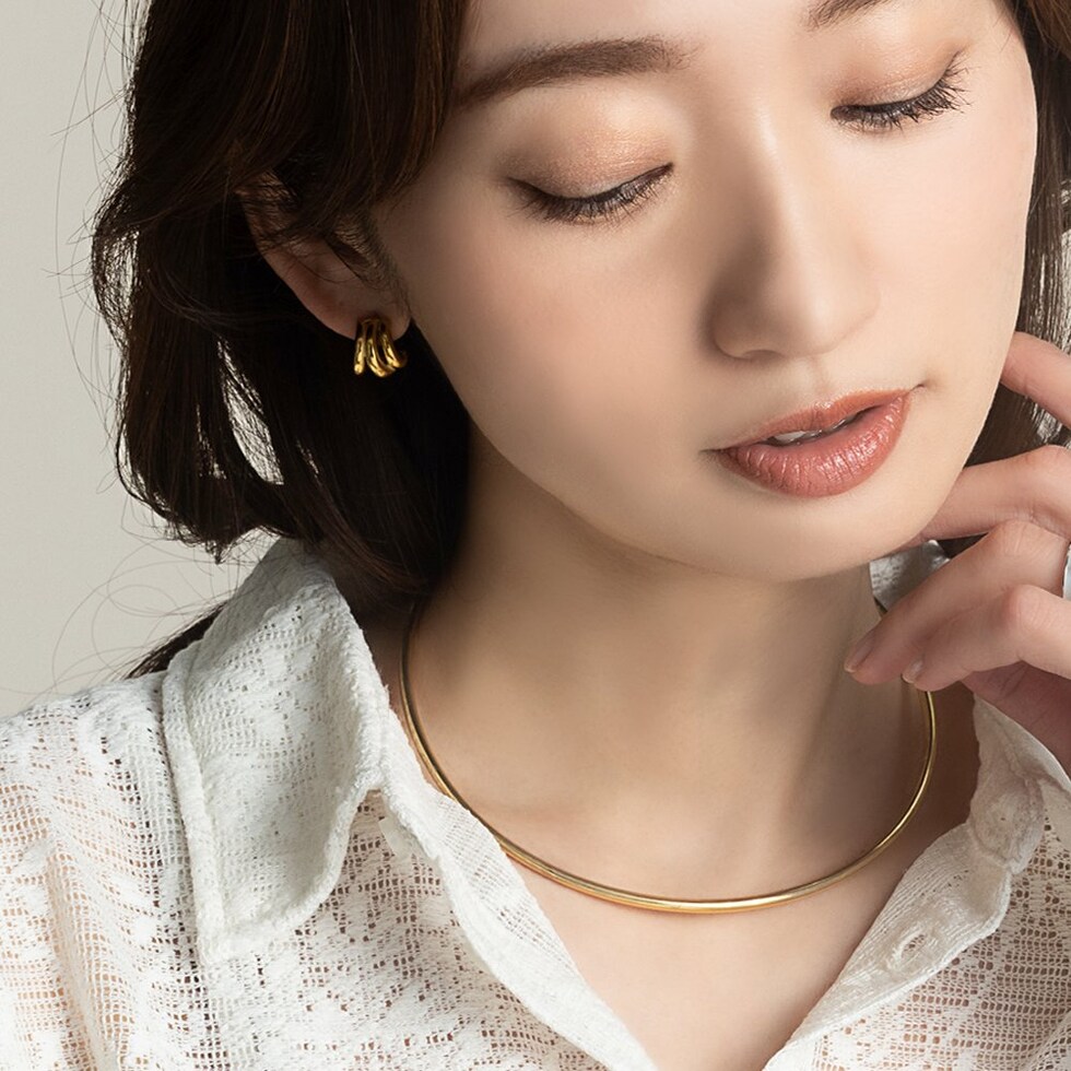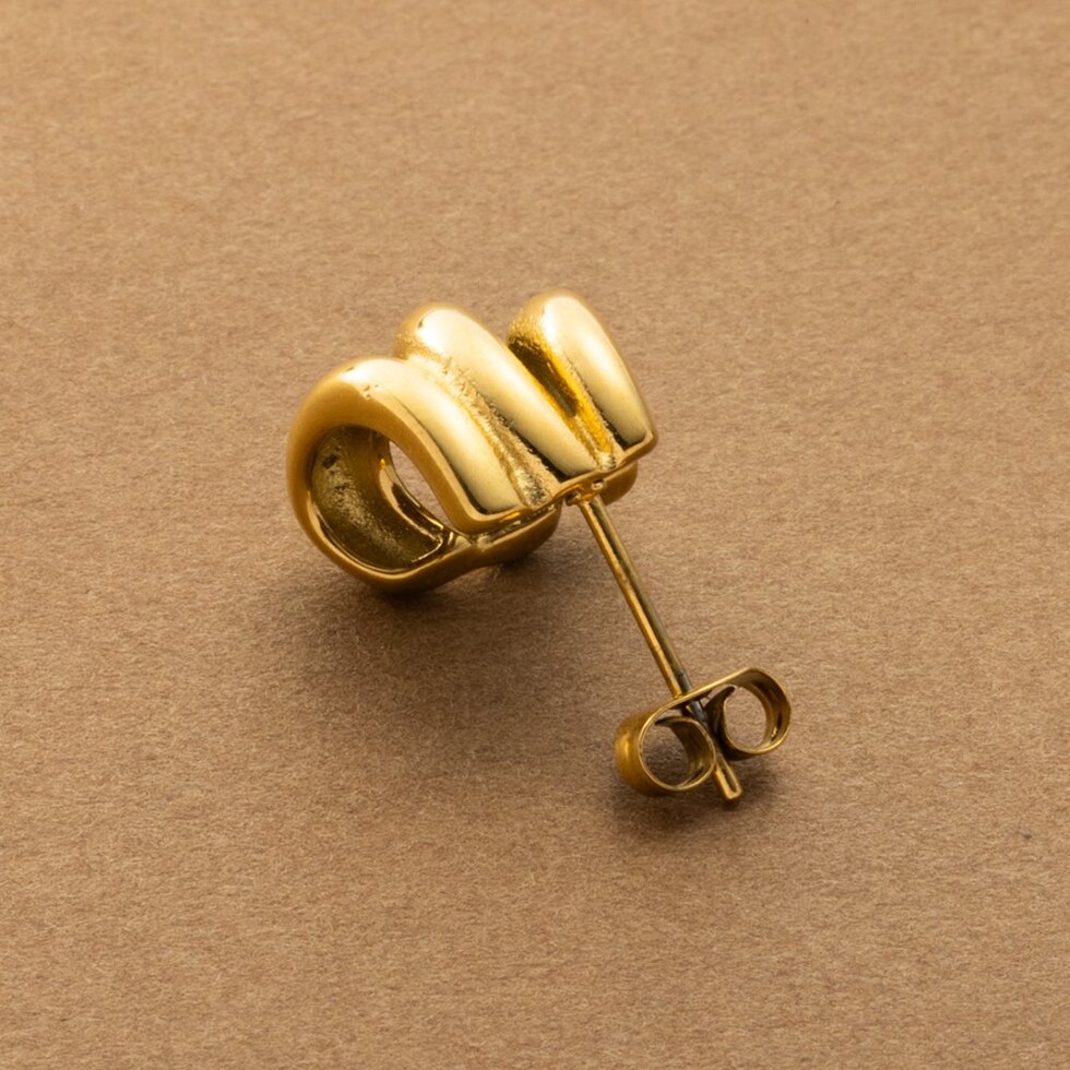 耳に沿うカーブフォルムとトリプルラインのピアス。程よい存在感がモダンで上品なアクセントを添えてくれる一品。錆びにくく傷に強いステンレス製だから、デイリーに活躍してくれそう。