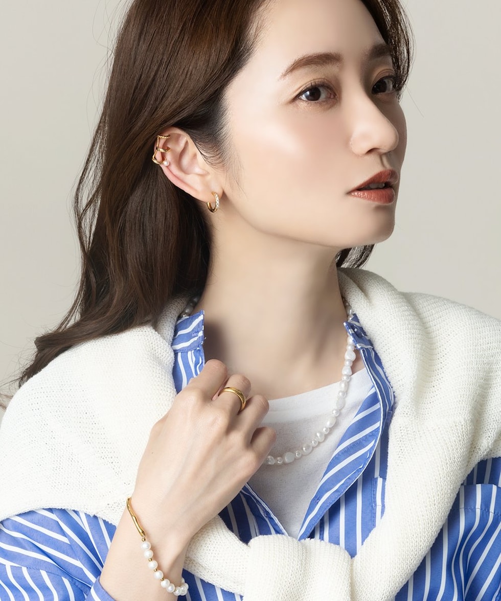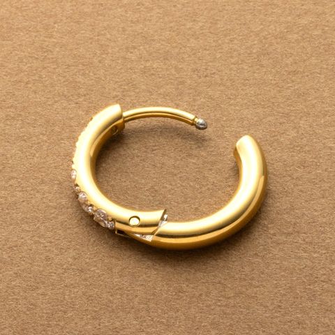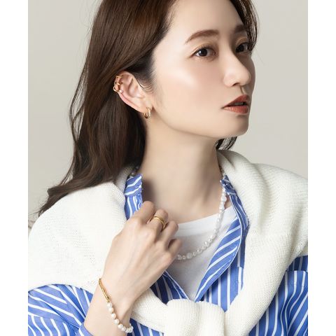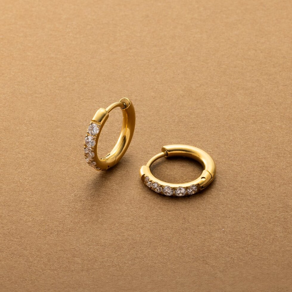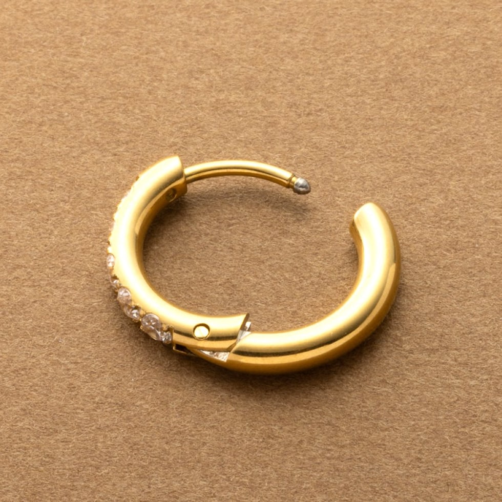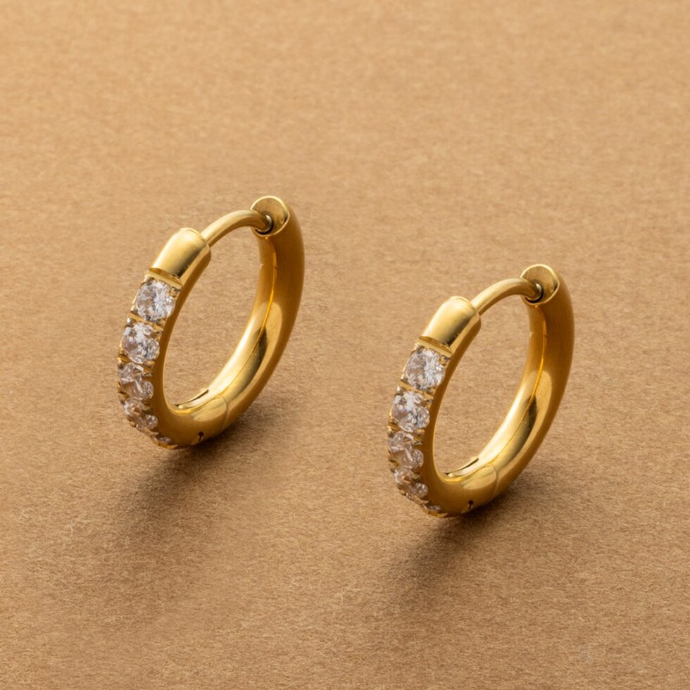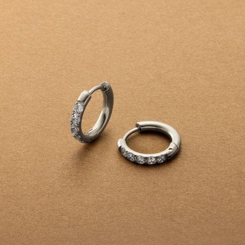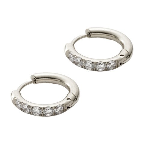 ビジューラインが煌めくステンレス製フープピアス。5粒の極小ジルコニアを並べたビジューラインが程よく華やかな“大人の定番”。開閉式キャッチレスデザインですっきりしたフォルムが人気のマストアイテム。