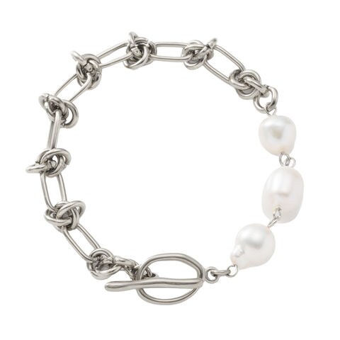 ニュアンスある艶めきの淡水パールとメタルチェーンの切り替えブレスレット。トレンドのマンテルデザインでこなれたスタイルに◎錆びにくく傷に強いステンレス製で、長時間の着用も安心の低アレルギー素材です。