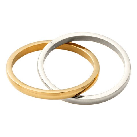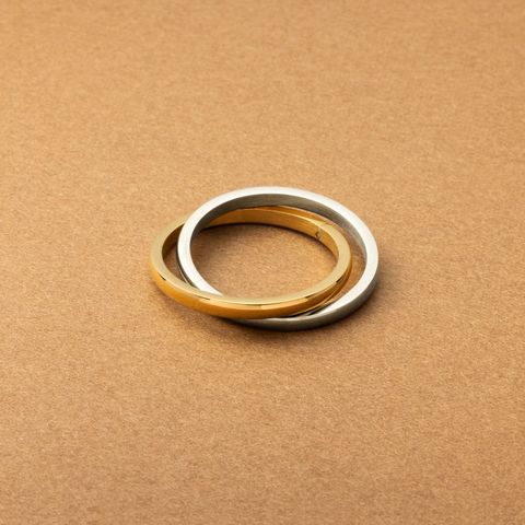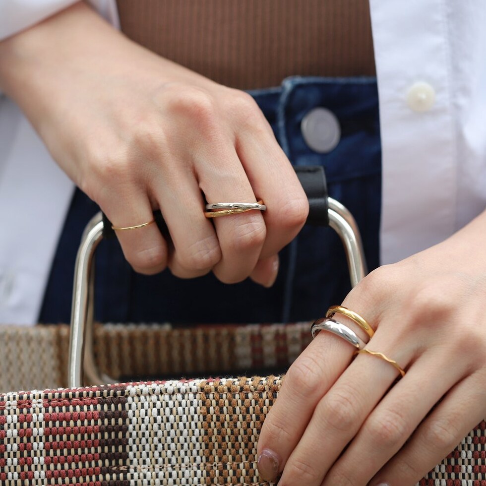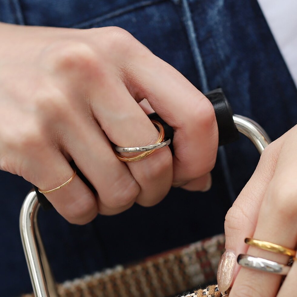 MIXカラーのステンレス製ダブルリング。指に着けると交わった2つのリングがクロスになる洗練デザイン。トレンドのミックスカラーとこなれ感たっぷりのフォルムで余裕のあるオトナの女性を演出して。
