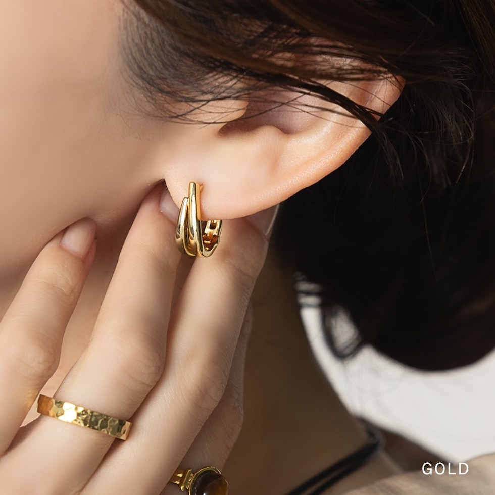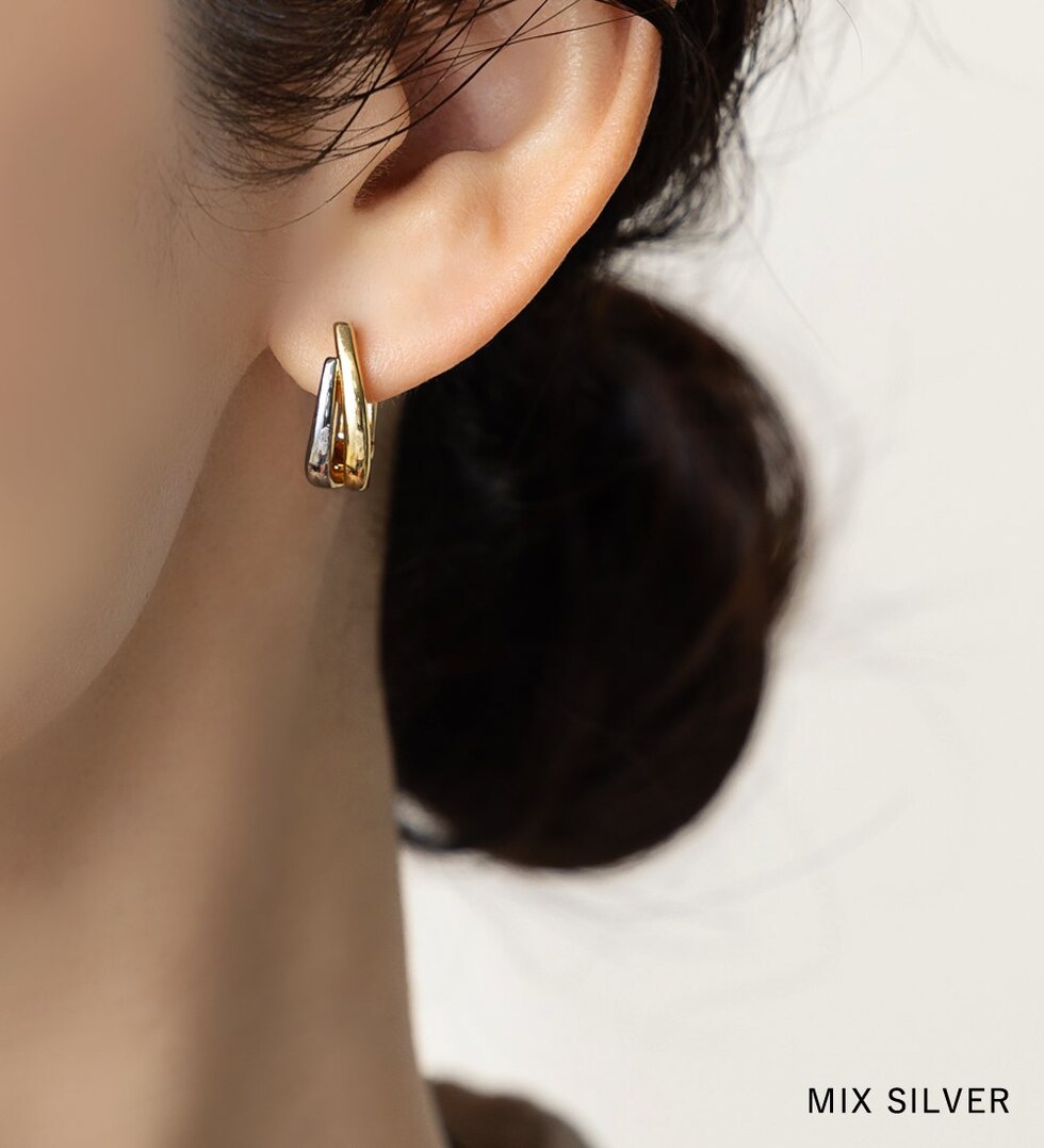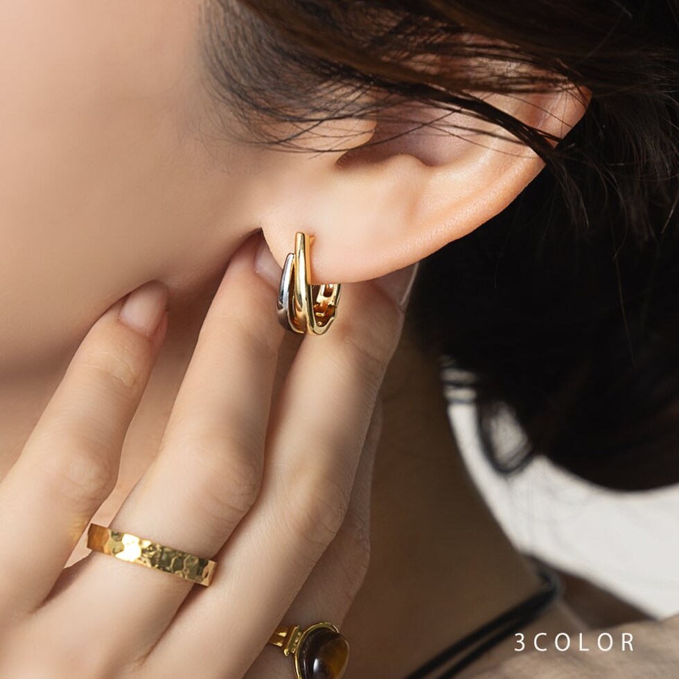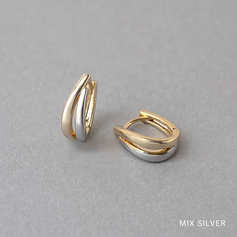 ミックスカラー×ツイストのキャッチレスフープピアス。レイヤード風に重なったメタルラインが、耳元に程よい存在感を添えてくれる。 艶感とシンプルなフォルムで、トレンドに左右されずデイリーに長く愛用できる一品です。 カジュアルにもキレイめにも馴染む万能アイテムです。