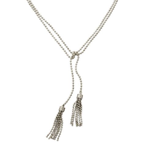 留め具のないボールチェーンのロングネックレス。紐のようなデザインで二重にしてY字で着用したり、巻きつけたりと色々なコーデをお楽しみいただけます。チェーン端のフリンジがコーデのアクセントにぴったり◎