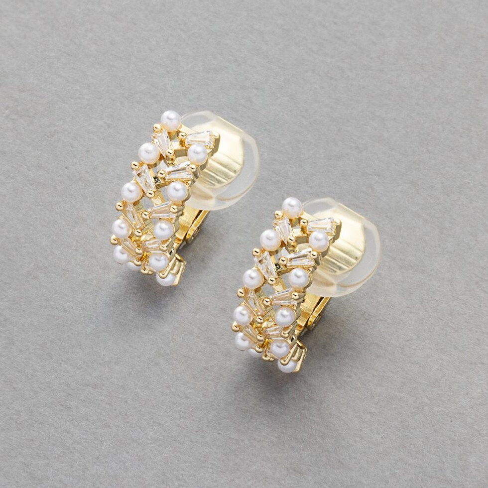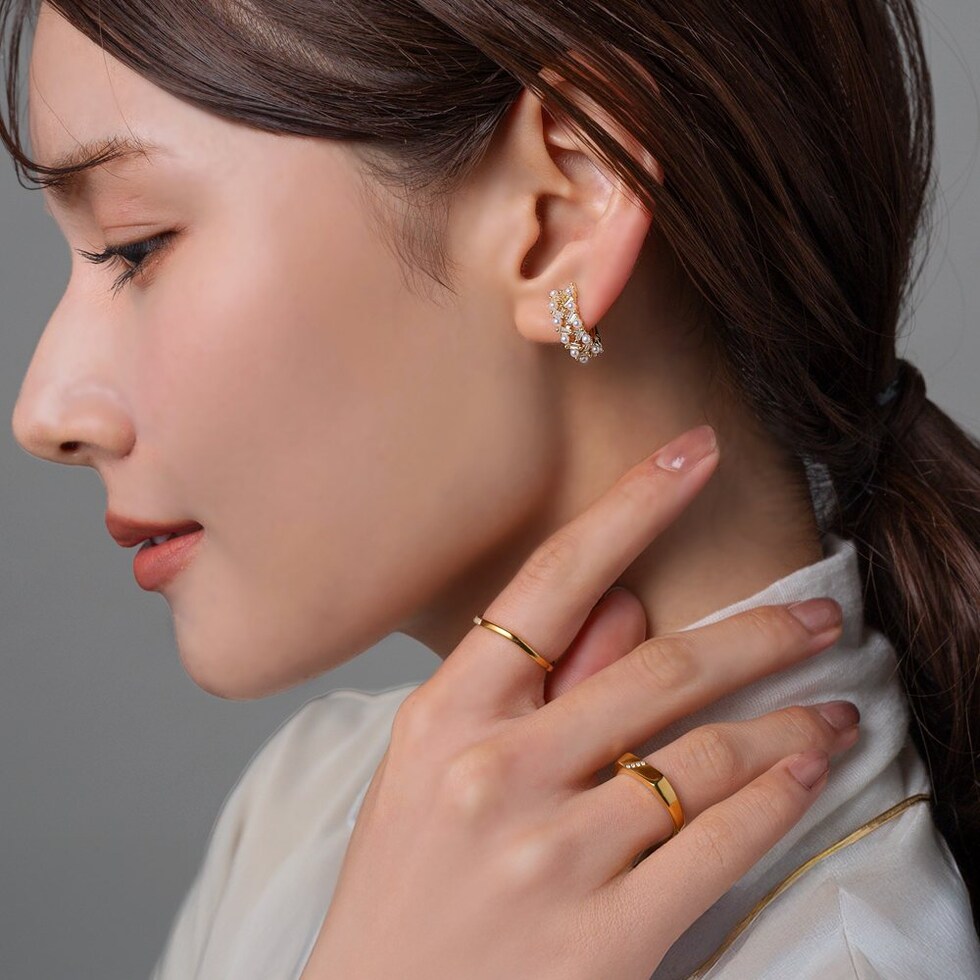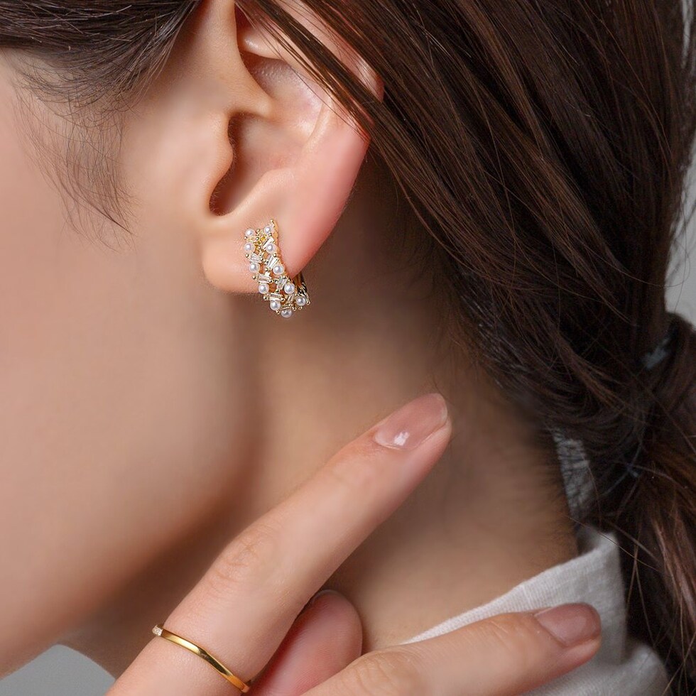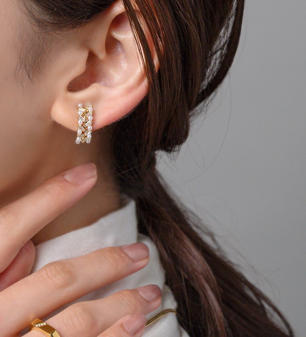 贅沢に並べたカットビジューとパールのフープイヤリング。上品で華やかな煌めきがアクセントを添えてくれる。フープ型だからイヤーカフとしても使える2way仕様。程よいサイズでデイリーにもお出かけにも活躍間違いない万能アイテムです。