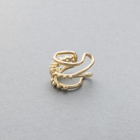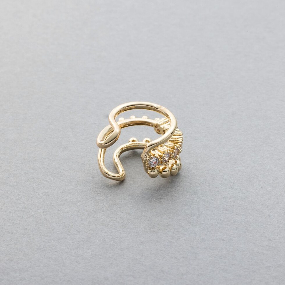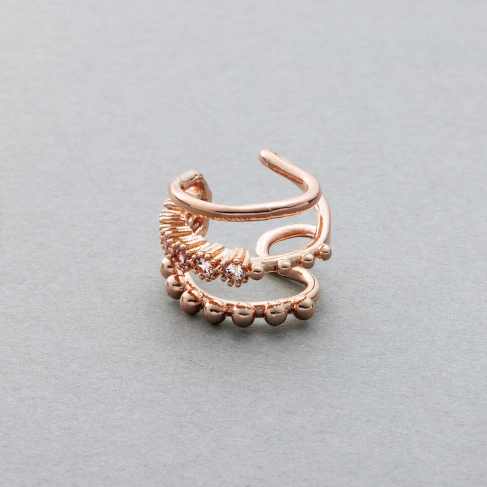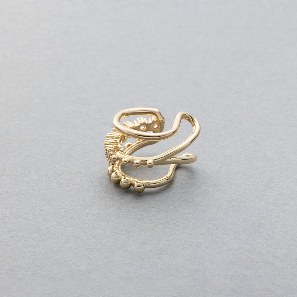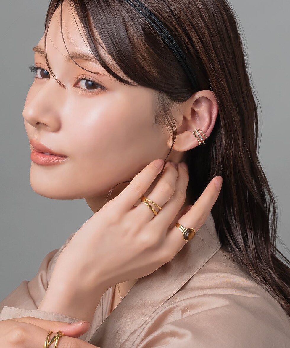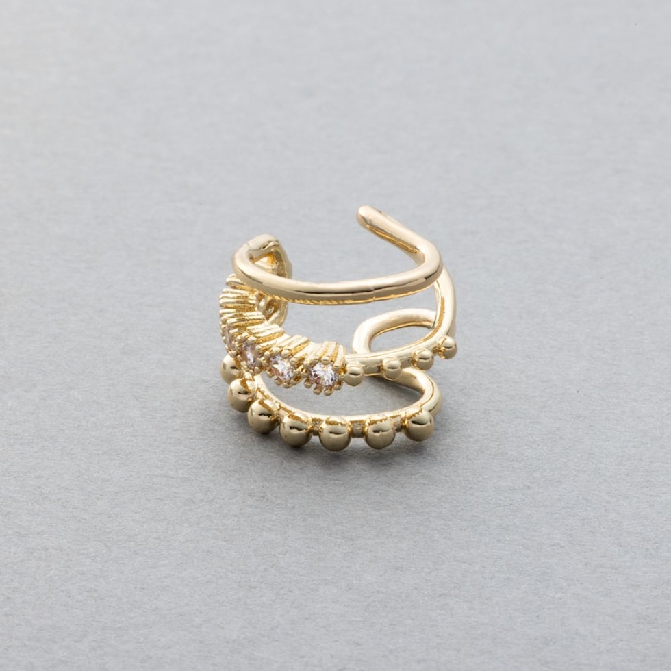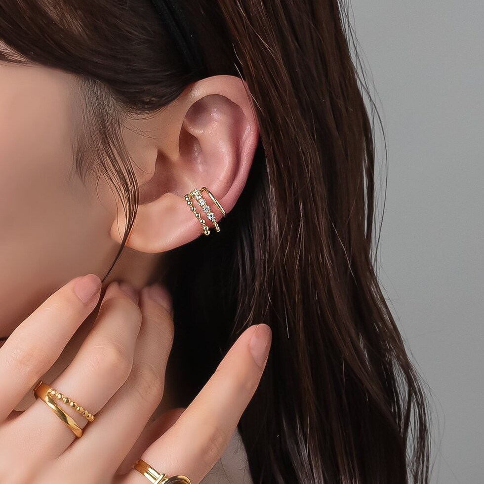 小粒ビジューとメタルボールが並ぶ、フープラインの3連イヤーカフ。重ね着けしたようなデザインが、耳元に洗練された立体感と華やかさを添えてくれる。カジュアルにもきれいめにも馴染む、毎日使いたくなる万能アイテムです。
